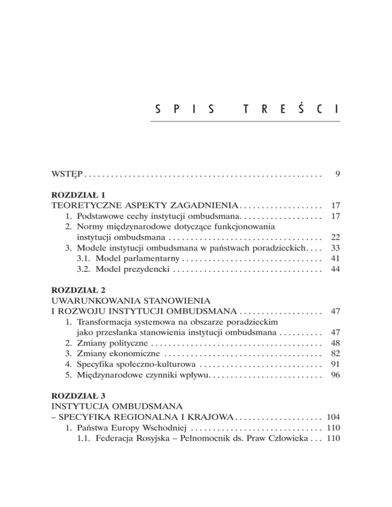 S p i s t r e ś c i WSTĘP . . . . . . . . . . . . . . . . . . . . . . . . . . . . . . . . . . . . . . . . . . . . . . . . . . . . . . 9 ROZDZIAŁ 1 TEORETYCZNE ASPEKTY ZAGADNIENIA . . . . . . . . . . . . . . . . . . . 1. Podstawowe cechy instytucji ombudsmana . . . . . . . . . . . . . . . . . . . 2.Normy międzynarodowe dotyczące funkcjonowania instytucji ombudsmana . . . . . . . . . . . . . . . . . . . . . . . . . . . . . . . . . . . . 3. Modele instytucji ombudsmana w państwach poradzieckich . . . . 3.1. Model parlamentarny . . . . . . . . . . . . . . . . . . . . . . . . . . . . . . . . . 3.2. Model prezydencki . . . . . . . . . . . . . . . . . . . . . . . . . . . . . . . . . . . ROZDZIAŁ 2 UWARUNKOWANIA STANOWIENIA I ROZWOJU INSTYTUCJI OMBUDSMANA . . . . . . . . . . . . . . . . . . . . 1.Transformacja systemowa na obszarze poradzieckim jako przesłanka stanowienia instytucji ombudsmana . . . . . . . . . . . 2. Zmiany polityczne . . . . . . . . . . . . . . . . . . . . . . . . . . . . . . . . . . . . . . . . 3. Zmiany ekonomiczne . . . . . . . . . . . . . . . . . . . . . . . . . . . . . . . . . . . . . 4. Specyfika społeczno-kulturowa . . . . . . . . . . . . . . . . . . . . . . . . . . . . . 5. Międzynarodowe czynniki wpływu . . . . . . . . . . . . . . . . . . . . . . . . . . 17 17 22 33 41 44 47 47 48 82 91 96 ROZDZIAŁ 3 INSTYTUCJA OMBUDSMANA – SPECYFIKA REGIONALNA I KRAJOWA . . . . . . . . . . . . . . . . . . . . 104 1. Państwa Europy Wschodniej . . . . . . . . . . . . . . . . . . . . . . . . . . . . . . . 110 1.1. Federacja Rosyjska – Pełnomocnik ds. Praw Człowieka . . . . 110 S p i s t r e ś 1.2.Ukraina – Pełnomocnik Rady Najwyższej ds. Praw Człowieka . . . . . . . . . . . . . . . . . . . . . . . . . . . . . . . . . . . 1.3. Mołdowa – Adwokaci Parlamentarni . . . . . . . . . . . . . . . . . . . 2. Państwa Kaukazu Południowego . . . . . . . . . . . . . . . . . . . . . . . . . . . 2.1. Gruzja – Obrońca Publiczny . . . . . . . . . . . . . . . . . . . . . . . . . . . 2.2. Azerbejdżan – Pełnomocnik ds. Praw Człowieka . . . . . . . . . 2.3. Armenia – Obrońca Praw Człowieka . . . . . . . . . . . . . . . . . . . 3. Państwa Azji Centralnej . . . . . . . . . . . . . . . . . . . . . . . . . . . . . . . . . . . 3.1.Uzbekistan – Pełnomocnik Olij Mażlisu ds. Praw Człowieka . . . . . . . . . . . . . . . . . . . . . . . . . . . . . . . . . . . 3.2. Kirgistan – Akyjkatczy (Ombudsman) . . . . . . . . . . . . . . . . . . . 3.3. Kazachstan – Pełnomocnik ds. Praw Człowieka . . . . . . . . . . 3.4. Tadżykistan – Rzecznik Praw Człowieka . . . . . . . . . . . . . . . . . c i ROZDZIAŁ 4 FORMALNO-PRAWNE PODSTAWY FUNKCJONOWANIA INSTYTUCJI OMBUDSMANA W PAŃSTWACH PORADZIECKICH . . . . . . . . . . . . . . . . . . . . . . . . . . . . . . . . . . . . . . . . . . . . 1. Procedura powołania oraz odwołania ombudsmana . . . . . . . . . . . 2. Kadencja ombudsmana . . . . . . . . . . . . . . . . . . . . . . . . . . . . . . . . . . . 3. Zakres kompetencji i uprawnień ombudsmana . . . . . . . . . . . . . . . 4. Kryteria stawiane kandydatom na urząd ombudsmana . . . . . . . . . 5. Relacje ombudsmanów z władzą wykonawczą . . . . . . . . . . . . . . . . 6. Relacje ombudsmanów z organizacjami pozarządowymi . . . . . . . ROZDZIAŁ 5 MIĘDZYNARODOWY KONTEKST ROZWOJU I FUNKCJONOWANIA INSTYTUCJI OMBUDSMANA W PAŃSTWACH PORADZIECKICH . . . . . . . . . . . . . . . . . . . . . . . . . . . 1.Członkostwo państw poradzieckich w organizacjach międzynarodowych a prawne i polityczne zobowiązania w dziedzinie ochrony praw człowieka . . . . . . . . . . . . . . . . . . . . . . . 1.1. Członkostwo w ONZ . . . . . . . . . . . . . . . . . . . . . . . . . . . . . . . . . 1.2. Członkostwo w OBWE . . . . . . . . . . . . . . . . . . . . . . . . . . . . . . . 1.3. Członkostwo w RE . . . . . . . . . . . . . . . . . . . . . . . . . . . . . . . . . . . 2.Wspieranie procesów demokratyzacji i instytucji ombudsmana w państwach poradzieckich przez UE . . . . . . . . . . . 116 120 124 125 128 131 139 140 143 147 150 154 156 162 166 178 182 194 205 205 205 226 233 248 S p i s t r e ś c i 2.1.Polska inicjatywa wspierania instytucji ombudsmanów w ramach Programu UE Partnerstwo Wschodnie . . . . . . . . . 250 2.2.Wspieranie instytucji ombudsmana przez UE w państwach Azji Centralnej . . . . . . . . . . . . . . . . . . . . . . . . . . . 253 3.Kompetencje i aktywność ombudsmana w dziedzinie współpracy międzynarodowej . . . . . . . . . . . . . . . . . . . . . . . . . . . . . . 256 ROZDZIAŁ 6 WPŁYW INSTYTUCJI OMBUDSMANA NA STAN OCHRONY PRAW I WOLNOŚCI CZŁOWIEKA W PAŃSTWACH PORADZIECKICH . . . . . . . . . . . . . . . . . . . . . . . . . . . 1.Specyfika funkcjonowania instytucji ombudsmana w warunkach trasformacji systemowej . . . . . . . . . . . . . . . . . . . . . . . . . . . . . . . . . . . 2.Instytucja ombudsmana jako element instytucjonalizacji ochrony praw człowieka w państwie . . . . . . . . . . . . . . . . . . . . . . . . . 3.Ombudsman a sądowe instrumenty ochrony praw człowieka . . . 4.Instytucja ombudsmana i jej rola w kształtowaniu kultury prawnej społeczeństwa . . . . . . . . . . . . . . . . . . . . . . . . . . . . . . . . . . . . 5.Perspektywy rozwoju instytucji wyspecjalizowanych ombudsmanów . . . . . . . . . . . . . . . . . . . . . . . . . . . . . . . . . . . . . . . . . . . 272 272 280 288 302 307 ZAKOŃCZENIE . . . . . . . . . . . . . . . . . . . . . . . . . . . . . . . . . . . . . . . . . . . . . . 316 ANEKS 1.Instytucja ombudsmana w państwach poradzieckich – podstawowe informacje . . . . . . . . . . . . . . . . . . . . . . . . . . . . . . . . . . 320 2.Ratyfikacja podstawowych dokumentów traktatowych ONZ w dziedzinie ochrony praw człowieka przez państwa poradzieckie . . . . . . . . . . . . . . . . . . . . . . . . . . . . . . . . . . . . . . . . . . . . . 324 BIBLIOGRAFIA . . . . . . . . . . . . . . . . . . . . . . . . . . . . . . . . . . . . . . . 