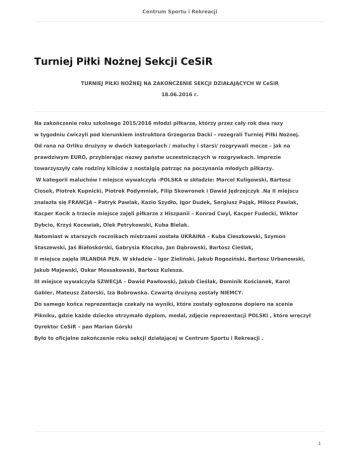 Centrum Sportu i Rekreacji Turniej Piłki Nożnej Sekcji CeSiR TURNIEJ PIŁKI NOŻNEJ NA ZAKOŃCZENIE SEKCJI DZIAŁAJĄCYCH W CeSiR 18.06.2016 r. Na zakończenie roku szkolnego 2015/2016 młodzi piłkarze, którzy przez cały rok dwa razy w tygodniu ćwiczyli pod kierunkiem instruktora Grzegorza Dacki – rozegrali Turniej Piłki Nożnej. Od rana na Orliku drużyny w dwóch kategoriach / maluchy i starsi/ rozgrywali mecze – jak na prawdziwym EURO, przybierając nazwy państw uczestniczących w rozgrywkach. Imprezie towarzyszyły całe rodziny kibiców z nostalgią patrząc na poczynania młodych piłkarzy. W kategorii maluchów I miejsce wywalczyła -POLSKA w składzie: Marcel Kuligowski, Bartosz Ciosek, Piotrek Kupnicki, Piotrek Podymniak, Filip Skowronek i Dawid Jędrzejczyk .Na II miejscu znalazła się FRANCJA – Patryk Pawlak, Kazio Szydło, Igor Dudek, Sergiusz Pająk, Miłosz Pawlak, Kacper Kocik a trzecie miejsce zajęli piłkarze z Hiszpanii – Konrad Cwyl, Kacper Fudecki, Wiktor Dybcio, Krzyś Kocewiak, Olek Petrykowski, Kuba Bielak. Natomiast w starszych rocznikach mistrzami została UKRAINA – Kuba Cieszkowski, Szymon Staszewski, Jaś Białoskórski, Gabrysia Kłoczko, Jan Dąbrowski, Bartosz Cieślak, II miejsce zajęła IRLANDIA PŁN. W składzie – Igor Zieliński, Jakub Rogoziński, Bartosz Urbanowski, Jakub Majewski, Oskar Mossakowski, Bartosz Kulesza. III miejsce wywalczyła SZWECJA – Dawid Pawłowski, Jakub Cieślak, Dominik Kościanek, Karol Gabler, Mateusz Zatorski, Iza Bobrowska. Czwartą drużyną zostały NIEMCY. Do samego końca reprezentacje czekały na wyniki, które zostały ogłoszone dopiero na scenie Pikniku, gdzie każde dziecko otrzymało dyplom, medal, zdjęcie reprezentacji POLSKI , które wręczył Dyrektor CeSiR – pan Marian Górski Było to oficjalne zakończenie roku sekcji działającej w Centrum Sportu i Rekreacji . 1