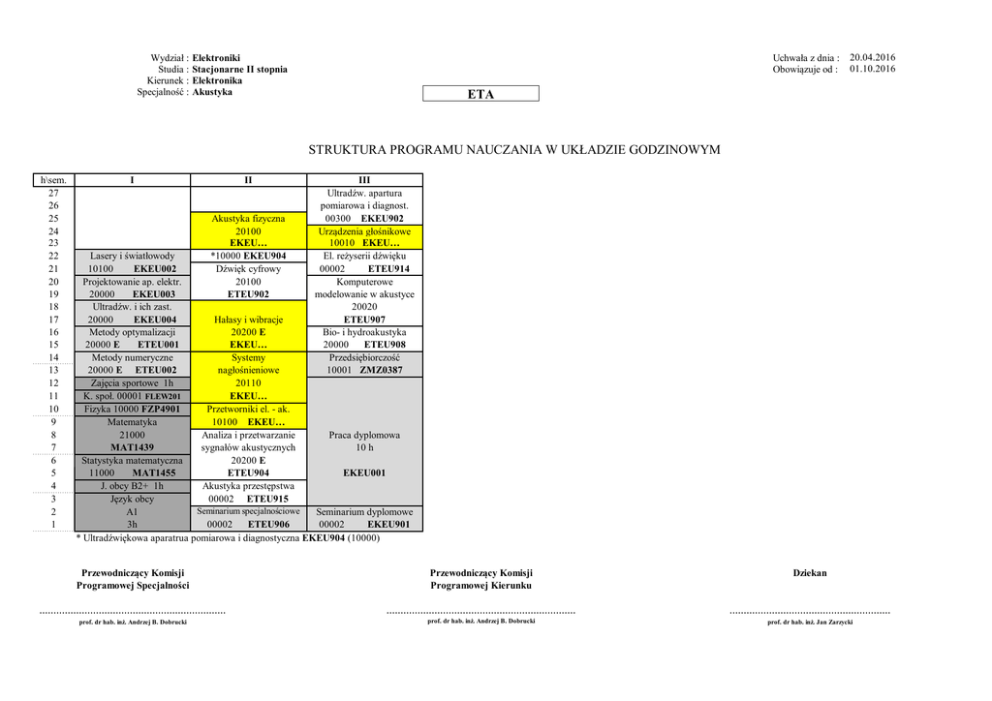 Wydział : Studia : Kierunek : Specjalność : Elektroniki Stacjonarne II stopnia Elektronika Akustyka Uchwała z dnia : Obowiązuje od : 20.04.2016 01.10.2016 ETA STRUKTURA PROGRAMU NAUCZANIA W UKŁADZIE GODZINOWYM h\sem. 27 26 25 24 23 22 21 20 19 18 17 16 15 14 13 12 11 10 9 8 7 6 5 4 3 2 1 I II Akustyka fizyczna 20100 EKEU… *10000 EKEU904 Dźwięk cyfrowy 20100 ETEU902 III Ultradźw. apartura pomiarowa i diagnost. 00300 EKEU902 Urządzenia głośnikowe 10010 EKEU… El. reżyserii dźwięku 00002 ETEU914 Komputerowe modelowanie w akustyce 20020 ETEU907 Bio- i hydroakustyka 20000 ETEU908 Przedsiębiorczość 10001 ZMZ0387 Lasery i światłowody 10100 EKEU002 Projektowanie ap. elektr. 20000 EKEU003 Ultradźw. i ich zast. 20000 EKEU004 Hałasy i wibracje Metody optymalizacji 20200 E 20000 E ETEU001 EKEU… Metody numeryczne Systemy 20000 E ETEU002 nagłośnieniowe 20110 Zajęcia sportowe 1h K. społ. 00001 FLEW201 EKEU… Fizyka 10000 FZP4901 Przetworniki el. - ak. Matematyka 10100 EKEU… 21000 Analiza i przetwarzanie Praca dyplomowa MAT1439 sygnałów akustycznych 10 h Statystyka matematyczna 20200 E 11000 MAT1455 ETEU904 EKEU001 J. obcy B2+ 1h Akustyka przestępstwa 00002 ETEU915 Język obcy Seminarium specjalnościowe A1 Seminarium dyplomowe 3h 00002 ETEU906 00002 EKEU901 * Ultradźwiękowa aparatrua pomiarowa i diagnostyczna EKEU904 (10000) Przewodniczący Komisji Programowej Specjalności Przewodniczący Komisji Programowej Kierunku Dziekan .................................................................. ................................................................... ......................................................... prof. dr hab. inż. Andrzej B. Dobrucki prof. dr hab. inż. Andrzej B. Dobrucki prof. dr hab. inż. Jan Zarzycki Wydział : Studia : Kierunek : Specjalność : Elektroniki Stacjonarne II stopnia Elektronika Akustyka Uchwała z dnia : Obowiązuje od : 20.04.2016 01.10.2016 ETA STRUKTURA PROGRAMU NAUCZANIA W UKŁADZIE PUNKTOWYM ECTS\ sem. 30 29 28 27 26 25 24 23 22 21 20 19 18 17 16 15 14 13 12 11 10 9 8 7 6 5 4 3 2 1 I Lasery i światłowody 3 Projektowanie aparatury elektronicznej 3 Ultradźwięki i ich zastosowanie 3 Metody optymalizacji 3 Metody numeryczne 3 Zajęcia sportowe 1 Komunikacja społeczna 2 Fizyka 1 Matematyka 5 Statystyka matematyczna 3 Język obcy B2+ 1 Język obcy A1 2 II III Ultradź. ap. pom. i diagn. Akustyka fizyczna 4 Ultradź. ap. pom. i diagn. 2 Dźwięk cyfrowy 4 Hałasy i wibracje 6 Systemy nagłośnieniowe ??? Przetworniki el. - ak. ??? 2 Urządzenia głośnikowe 2 Komputerowe modelowanie w akustyce 3 El. reżyserii dźwięku 2 Bio- i hydroakustyka 3 Przedsiębiorczość 3 Praca dyplomowa 12 Analiza i przetwarzanie sygnałów akustycznych 5 Akustyka przestępstwa 2 Seminarium specjalnościowe 2 Seminarium dyplomowe 3 Przewodniczący Komisji Programowej Specjalności Przewodniczący Komisji Programowej Kierunku Dziekan .................................................................. ................................................................... ............................................................... prof. dr hab. inż. Andrzej B. Dobrucki prof. dr hab. inż. Andrzej B. Dobrucki prof. dr hab. inż. Jan Zarzycki