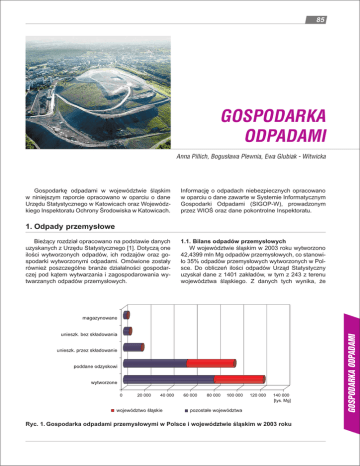 85 GOSPODARKA ODPADAMI Anna Pillich, Bogus³awa Plewnia, Ewa Glubiak - Witwicka Gospodarkê odpadami w województwie l¹skim w niniejszym raporcie opracowano w oparciu o dane Urzêdu Statystycznego w Katowicach oraz Wojewódzkiego Inspektoratu Ochrony rodowiska w Katowicach. Informacjê o odpadach niebezpiecznych opracowano w oparciu o dane zawarte w Systemie Informatycznym Gospodarki Odpadami (SIGOP-W), prowadzonym przez WIO oraz dane pokontrolne Inspektoratu. 1. Odpady przemys³owe 1.1. Bilans odpadów przemys³owych W województwie l¹skim w 2003 roku wytworzono 42,4399 mln Mg odpadów przemys³owych, co stanowi³o 35% odpadów przemys³owych wytworzonych w Polsce. Do obliczeñ iloci odpadów Urz¹d Statystyczny uzyska³ dane z 1401 zak³adów, w tym z 243 z terenu województwa l¹skiego. Z danych tych wynika, ¿e GOSPODARKA ODPADAMI Bie¿¹cy rozdzia³ opracowano na podstawie danych uzyskanych z Urzêdu Statystycznego [1]. Dotycz¹ one iloci wytworzonych odpadów, ich rodzajów oraz gospodarki wytworzonymi odpadami. Omówione zosta³y równie¿ poszczególne bran¿e dzia³alnoci gospodarczej pod k¹tem wytwarzania i zagospodarowania wytwarzanych odpadów przemys³owych. Ryc. 1. Gospodarka odpadami przemys³owymi w Polsce i województwie l¹skim w 2003 roku 86 Ryc. 2. Gospodarka odpadami przemys³owymi w województwie l¹skim w latach 1999-2003 utrzyma³a siê kilkuletnia tendencja zmniejszania iloci wytworzonych odpadów przemys³owych. W 2003 roku by³o to 99,3% iloci wytworzonej w 2002 roku. Sposób zagospodarowania wytworzonych w 2003 roku odpadów przedstawia ryc. 1. Od 1999 roku obserwuje siê znaczny spadek iloci odpadów unieszkodliwianych poprzez sk³adowanie na korzyæ odzyskiwania odpadów. W roku 1999 wykorzystano 79%, a sk³adowano 19% ca³oci wytworzonych odpadów przemys³owych. Odzyskowi poddano 40,8105 mln Mg odpadów tj. 97%, unieszkodliwiono 1,2411 mln Mg tj. 2,9%, w tym zesk³adowano 0,6075 mln Mg tj. 1,4%. Pozosta³e 0,3883 mln Mg wytworzonych odpadów czasowo zmagazynowano (ryc. 2). Iloci odpadów wytworzonych w poszczególnych powiatach województwa l¹skiego przedstawiono na ryc. 3. Podobnie jak w latach wczeniejszych najwiêcej odpadów powsta³o w Rudzie l¹skiej (9,9% wytworzonych), powiecie pszczyñskim (9,6%), Rybniku (9,3%), powiecie gliwickim (8,8%), Katowicach (8,5%), Jastrzêbiu Zdroju (8,4%), D¹browie Górniczej (7,9%), powiecie miko³owskim (6,7%) i wodzis³awskim (6,1%). £¹cznie w wymienionych powiatach i miastach na prawach powiatu wytworzono 75,2% odpadów. Najmniej odpadów przemys³owych wytworzono w powiecie lublinieckim 3,1 tys. Mg, Siemianowicach l¹skich 6,9 tys. Mg, ¯orach 9,1 tys. Mg i powiecie czêstochowskim 9,6 tys. Mg. W porównaniu do roku 2002 najwiêkszy wzrost iloci wytworzonych odpadów odnotowano w Chorzowie (o 33%), Gliwicach (o 30%), powiecie zawierciañskim (o 17,1%), Rudzie l¹skiej (o 16%) i powiecie raciborskim (o 16,2%). Najwiêkszy spadek iloci wytworzonych odpadów odnotowano w Bytomiu (o 32%), Piekarach l¹skich (o 34%) i Siemianowicach l¹skich (o 59%). 1.2. ród³a powstawania odpadów Bilans odpadów przemys³owych wytworzonych w województwie l¹skim wed³ug róde³ ich powstawania przedstawiono na podstawie Polskiej Klasyfikacji Dzia³alnoci (tabela 1). Podobnie jak w roku 2002 najwiêcej a¿ 76,2% odpadów przemys³owych - powsta³o w górnictwie, w produkcji metali 10,5% i w energetyce 9,6%. Przemys³ spo¿ywczy wytworzy³ 1% wszystkich wytworzonych odpadów przemys³owych. Pozosta³e bran¿e posiada³y mniej ni¿ jednoprocentowy udzia³ w wytwarzaniu odpadów. W porównaniu do roku poprzedniego najwiêkszy wzrost iloci powstaj¹cych odpadów wyst¹pi³ w: bran¿y zajmuj¹cej siê zagospodarowaniem odpadów - o 77%, produkcji wyrobów z pozosta³ych surowców niemetalicznych (g³ównie szk³a i wyrobów szklanych) o 43%, produkcji maszyn i aparatury elektrycznej, gdzie indziej niesklasyfikowanej (produkcja silników elektrycznych, pr¹dnic i transformatorów) - o 37%, produkcji metali o 25%, Natomiast znaczny spadek iloci wytworzonych odpadów nast¹pi³ w: budownictwie - o 74%, produkcji maszyn i urz¹dzeñ gdzie indziej niesklasyfikowanej - o 68%, w³ókiennictwie - o 66%, produkcji pozosta³ego sprzêtu transportowego (produkcja taboru kolejowego i tramwajowego) - o 48%. (Dane wed³ug Polskiej Klasyfikacji Dzia³alnoci). 87 Analizuj¹c dane ilociowe dotycz¹ce wytwarzania odpadów wg róde³ ich powstawania (klasyfikacja wg rozporz¹dzenia Ministra rodowiska z dnia 27 wrzenia 2001 r. w sprawie katalogu odpadów. (Dz. U. Nr 112, poz. 1206)), stwierdzono, ¿e podobnie jak w latach wczeniejszych, dominuj¹ odpady grupy 01 (od- pady powstaj¹ce przy poszukiwaniu, wydobywaniu, fizycznej i chemicznej przeróbce rud oraz innych kopalin) 76,4% wytworzonych odpadów (tabela 2); 18,8% wytworzonych odpadów to odpady grupy 10 (odpady z procesów termicznych). Pozosta³e grupy nie stanowi³y wiêcej ni¿ 5% wytworzonych odpadów przemys³o- Tabela 1. Gospodarka odpadami przemys³owymi w województwie l¹skim w 2003 roku [w tys. Mg] unieszkodliwione poddane odzyskowi magazynowane czasowo razem w tym sk³adowane 31531,2 757,5 420,2 29,3 - - - 10 Górnictwo wêgla kamiennego i brunatnego; 32318 wydobywanie torfu 14 Pozosta³e górnictwo i kopalnictwo 347 347 15 Produkcja artyku³ów spo¿ywczych napojów 442 412,4 27,5 24,5 2,1 17 W³ókiennictwo 3 3 - - - 19 Produkcja skór wyprawionych i wyrobów ze skór wyprawionych 3,6 1,7 1,9 1,9 - 20 Produkcja drewna i wyrobów z drewna 9,6 7,6 1,8 1,8 0,2 21 Produkcja masy celulozowej, papieru oraz wyrobów z papieru 25,8 23,1 1,7 1,7 1 23 Wytwarzanie koksu, produktów rafinacji ropy naftowej i paliw j¹drowych 20,1 3,8 15,8 1,4 0,5 24 Produkcja wyrobów chemicznych 28,1 4,1 3,2 - 25 Produkcja wyrobów gumowych i z tworzyw sztucznych 7,1 5,7 0,4 0,4 1 26 Produkcja wyrobów z surowców niemetalicznych pozosta³ych 94,7 63,6 26,4 24,3 4,7 27 Produkcja metali 4465,3 4369,4 35,7 20,2