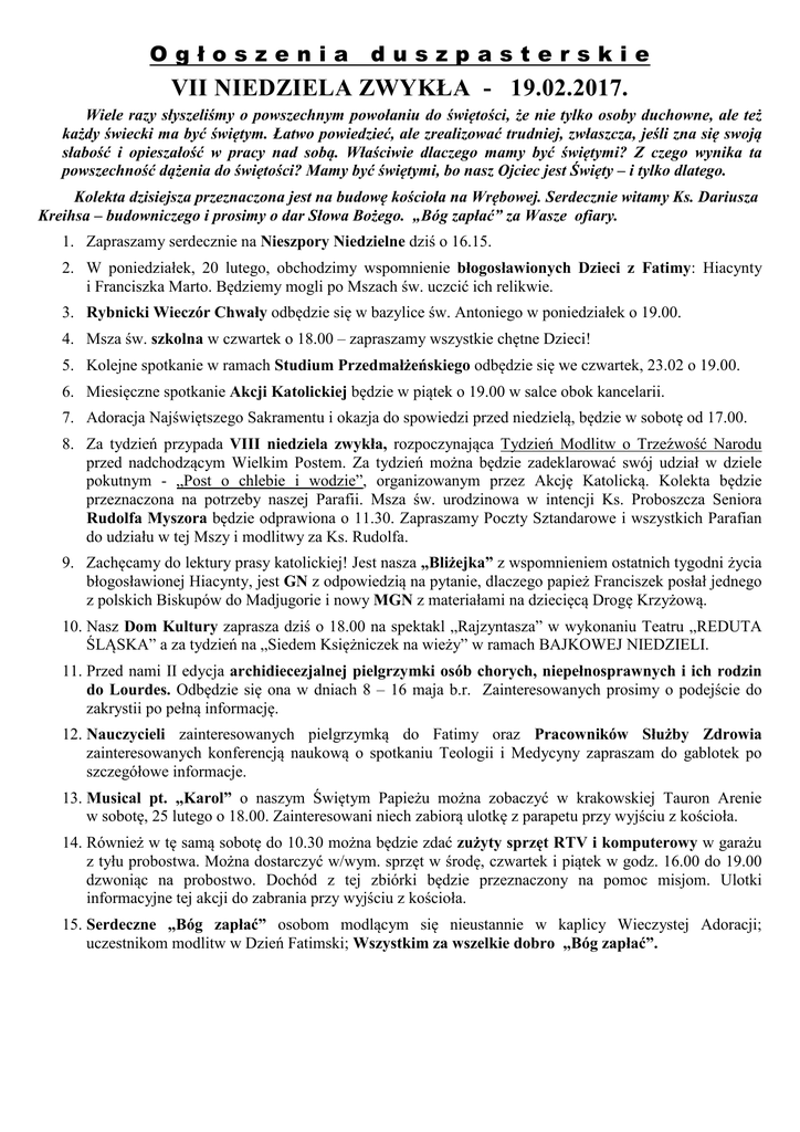 Ogłoszenia duszpasterskie VII NIEDZIELA ZWYKŁA - 19.02.2017. Wiele razy słyszeliśmy o powszechnym powołaniu do świętości, że nie tylko osoby duchowne, ale też każdy świecki ma być świętym. Łatwo powiedzieć, ale zrealizować trudniej, zwłaszcza, jeśli zna się swoją słabość i opieszałość w pracy nad sobą. Właściwie dlaczego mamy być świętymi? Z czego wynika ta powszechność dążenia do świętości? Mamy być świętymi, bo nasz Ojciec jest Święty – i tylko dlatego. Kolekta dzisiejsza przeznaczona jest na budowę kościoła na Wrębowej. Serdecznie witamy Ks. Dariusza Kreihsa – budowniczego i prosimy o dar Słowa Bożego. „Bóg zapłać” za Wasze ofiary. 1. Zapraszamy serdecznie na Nieszpory Niedzielne dziś o 16.15. 2. W poniedziałek, 20 lutego, obchodzimy wspomnienie błogosławionych Dzieci z Fatimy: Hiacynty i Franciszka Marto. Będziemy mogli po Mszach św. uczcić ich relikwie. 3. Rybnicki Wieczór Chwały odbędzie się w bazylice św. Antoniego w poniedziałek o 19.00. 4. Msza św. szkolna w czwartek o 18.00 – zapraszamy wszystkie chętne Dzieci! 5. Kolejne spotkanie w ramach Studium Przedmałżeńskiego odbędzie się we czwartek, 23.02 o 19.00. 6. Miesięczne spotkanie Akcji Katolickiej będzie w piątek o 19.00 w salce obok kancelarii. 7. Adoracja Najświętszego Sakramentu i okazja do spowiedzi przed niedzielą, będzie w sobotę od 17.00. 8. Za tydzień przypada VIII niedziela zwykła, rozpoczynająca Tydzień Modlitw o Trzeźwość Narodu przed nadchodzącym Wielkim Postem. Za tydzień można będzie zadeklarować swój udział w dziele pokutnym - „Post o chlebie i wodzie”, organizowanym przez Akcję Katolicką. Kolekta będzie przeznaczona na potrzeby naszej Parafii. Msza św. urodzinowa w intencji Ks. Proboszcza Seniora Rudolfa Myszora będzie odprawiona o 11.30. Zapraszamy Poczty Sztandarowe i wszystkich Parafian do udziału w tej Mszy i modlitwy za Ks. Rudolfa. 9. Zachęcamy do lektury prasy katolickiej! Jest nasza „Bliżejka” z wspomnieniem ostatnich tygodni życia błogosławionej Hiacynty, jest GN z odpowiedzią na pytanie, dlaczego papież Franciszek posłał jednego z polskich Biskupów do Madjugorie i nowy MGN z materiałami na dziecięcą Drogę Krzyżową. 10. Nasz Dom Kultury zaprasza dziś o 18.00 na spektakl „Rajzyntasza” w wykonaniu Teatru „REDUTA ŚLĄSKA” a za tydzień na „Siedem Księżniczek na wieży” w ramach BAJKOWEJ NIEDZIELI. 11. Przed nami II edycja archidiecezjalnej pielgrzymki osób chorych, niepełnosprawnych i ich rodzin do Lourdes. Odbędzie się ona w dniach 8 – 16 maja b.r. Zainteresowanych prosimy o podejście do zakrystii po pełną informację. 12. Nauczycieli zainteresowanych pielgrzymką do Fatimy oraz Pracowników Służby Zdrowia zainteresowanych konferencją naukową o spotkaniu Teologii i Medycyny zapraszam do gablotek po szczegółowe informacje. 13. Musical pt. „Karol” o naszym Świętym Papieżu można zobaczyć w krakowskiej Tauron Arenie w sobotę, 25 lutego o 18.00. Zainteresowani niech zabiorą ulotkę z parapetu przy wyjściu z kościoła. 14. Również w tę samą sobotę do 10.30 można będzie zdać zużyty sprzęt RTV i komputerowy w garażu z tyłu probostwa. Można dostarczyć w/wym. sprzęt w środę, czwartek i piątek w godz. 16.00 do 19.00 dzwoniąc na probostwo. Dochód z tej zbiórki będzie przeznaczony na pomoc misjom. Ulotki informacyjne tej akcji do zabrania przy wyjściu z kościoła. 15. Serdeczne „Bóg zapłać” osobom modlącym się nieustannie w kaplicy Wieczystej Adoracji; uczestnikom modlitw w Dzień Fatimski; Wszystkim za wszelkie dobro „Bóg zapłać”.