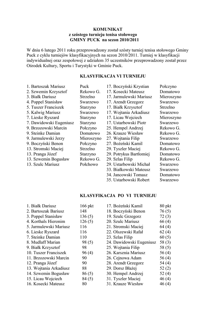 KOMUNIKAT z szóstego turnieju tenisa stołowego GMINY PUCK na