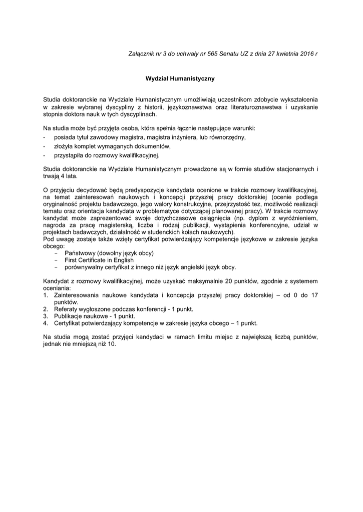 Załącznik nr 3 do uchwały nr 565 Senatu UZ z dnia 27 kwietnia 2016 r Wydział Humanistyczny Studia doktoranckie na Wydziale Humanistycznym umożliwiają uczestnikom zdobycie wykształcenia w zakresie wybranej dyscypliny z historii, językoznawstwa oraz literaturoznawstwa i uzyskanie stopnia doktora nauk w tych dyscyplinach. Na studia może być przyjęta osoba, która spełnia łącznie następujące warunki: - posiada tytuł zawodowy magistra, magistra inżyniera, lub równorzędny, - złożyła komplet wymaganych dokumentów, - przystąpiła do rozmowy kwalifikacyjnej. Studia doktoranckie na Wydziale Humanistycznym prowadzone są w formie studiów stacjonarnych i trwają 4 lata. O przyjęciu decydować będą predyspozycje kandydata ocenione w trakcie rozmowy kwalifikacyjnej, na temat zainteresowań naukowych i koncepcji przyszłej pracy doktorskiej (ocenie podlega oryginalność projektu badawczego, jego walory konstrukcyjne, przejrzystość tez, możliwość realizacji tematu oraz orientacja kandydata w problematyce dotyczącej planowanej pracy). W trakcie rozmowy kandydat może zaprezentować swoje dotychczasowe osiągnięcia (np. dyplom z wyróżnieniem, nagroda za pracę magisterską, liczba i rodzaj publikacji, wystąpienia konferencyjne, udział w projektach badawczych, działalność w studenckich kołach naukowych). Pod uwagę zostaje także wzięty certyfikat potwierdzający kompetencje językowe w zakresie języka obcego: - Państwowy (dowolny język obcy) - First Certificate in English - porównywalny certyfikat z innego niż język angielski język obcy. Kandydat z rozmowy kwalifikacyjnej, może uzyskać maksymalnie 20 punktów, zgodnie z systemem oceniania: 1. Zainteresowania naukowe kandydata i koncepcja przyszłej pracy doktorskiej – od 0 do 17 punktów. 2. Referaty wygłoszone podczas konferencji - 1 punkt. 3. Publikacje naukowe - 1 punkt. 4. Certyfikat potwierdzający kompetencje w zakresie języka obcego – 1 punkt. Na studia mogą zostać przyjęci kandydaci w ramach limitu miejsc z największą liczbą punktów, jednak nie mniejszą niż 10.