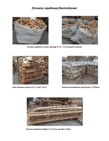 Drewno opałowe/kominkowe Drewno opałowe suche, big bag 65 zł + 20 zł kaucji za worek Kosz drewna (sosna ok 1,7 mp) 140 zł Drewno kominkowe buk/jesion 370/kosz Drewno opałowe długie 65 zł /mp; paczka 3-4mp Drewno kominkowe – rozpałkowe 20 zł Kora ogrodowa Wór kory big bag (ok. 1 mp) 70 zł Kora w workach ryflowanych (ok. 80l ) 8zł/worek
