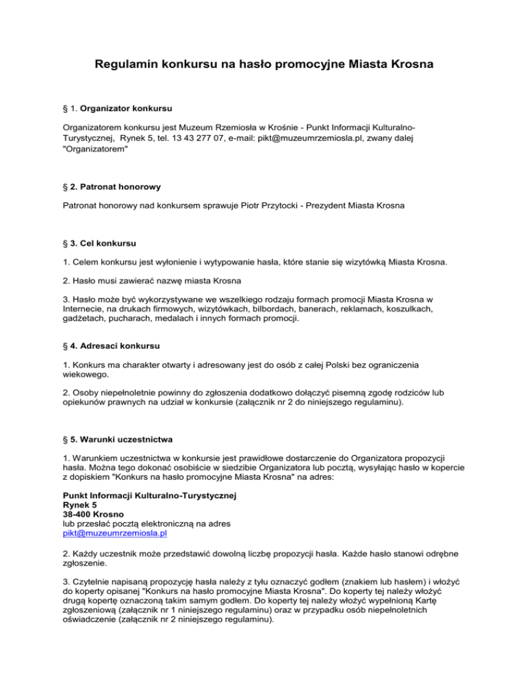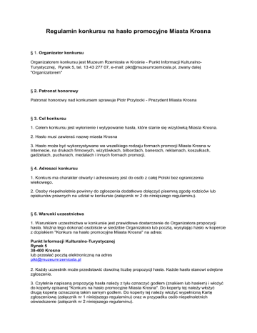 Regulamin konkursu na hasło promocyjne Miasta Krosna § 1. Organizator konkursu Organizatorem konkursu jest Muzeum Rzemiosła w Krośnie - Punkt Informacji KulturalnoTurystycznej, Rynek 5, tel. 13 43 277 07, e-mail: [email protected], zwany dalej "Organizatorem" § 2. Patronat honorowy Patronat honorowy nad konkursem sprawuje Piotr Przytocki - Prezydent Miasta Krosna § 3. Cel konkursu 1. Celem konkursu jest wyłonienie i wytypowanie hasła, które stanie się wizytówką Miasta Krosna. 2. Hasło musi zawierać nazwę miasta Krosna 3. Hasło może być wykorzystywane we wszelkiego rodzaju formach promocji Miasta Krosna w Internecie, na drukach firmowych, wizytówkach, bilbordach, banerach, reklamach, koszulkach, gadżetach, pucharach, medalach i innych formach promocji. § 4. Adresaci konkursu 1. Konkurs ma charakter otwarty i adresowany jest do osób z całej Polski bez ograniczenia wiekowego. 2. Osoby niepełnoletnie powinny do zgłoszenia dodatkowo dołączyć pisemną zgodę rodziców lub opiekunów prawnych na udział w konkursie (załącznik nr 2 do niniejszego regulaminu). § 5. Warunki uczestnictwa 1. Warunkiem uczestnictwa w konkursie jest prawidłowe dostarczenie do Organizatora propozycji hasła. Można tego dokonać osobiście w siedzibie Organizatora lub pocztą, wysyłając hasło w kopercie z dopiskiem "Konkurs na hasło promocyjne Miasta Krosna" na adres: Punkt Informacji Kulturalno-Turystycznej Rynek 5 38-400 Krosno lub przesłać pocztą elektroniczną na adres [email protected] 2. Każdy uczestnik może przedstawić dowolną liczbę propozycji hasła. Każde hasło stanowi odrębne zgłoszenie. 3. Czytelnie napisaną propozycję hasła należy z tyłu oznaczyć godłem (znakiem lub hasłem) i włożyć do koperty opisanej "Konkurs na hasło promocyjne Miasta Krosna". Do koperty tej należy włożyć drugą kopertę oznaczoną takim samym godłem. Do koperty tej należy włożyć wypełnioną Kartę zgłoszeniową (załącznik nr 1 niniejszego regulaminu) oraz w przypadku osób niepełnoletnich oświadczenie (załącznik nr 2 niniejszego regulaminu). 5. Propozycje hasła mogą być zgłaszane do konkursu wyłącznie przez ich autorów, którym przysługuje wyłączne prawo do korzystania z nich, a propozycja hasła nie jest obciążona żadnymi prawami autorskimi ani roszczeniami osób trzecich. § 6. Termin składania propozycji haseł 1. Propozycje można składać do dnia 14 sierpnia 2015 roku. 2. Za dzień oddania projektu hasła uważa się dzień wpływu do Punktu Informacji KulturalnoTurystycznej. 3. Propozycje dostarczone po terminie 14 sierpnia 2015 roku nie będą rozpatrywane przez Jury konkursu. § 7. Rozstrzygnięcie konkursu 1. O wyłonieniu zwycięzców konkursu zadecyduje powołane przez Organizatora Jury 2. Organizator przewiduje jedną nagrodę główną: https://www.facebook.com/pitu.pitu0/about. Nagroda zostanie uroczyście wręczona podczas inauguracji Festiwalu Karpackie Klimaty 21 sierpnia 2015 r.. 3. Organizator zastrzega sobie prawo do nierozstrzygnięcia konkursu, jeśli prace nie spełnią warunków regulaminu lub ich poziom nie będzie spełniał oczekiwań Organizatora 4. Decyzja Jury jest ostateczna. 5. Laureat konkursu zostanie odpowiednio wcześniej powiadomiony przez Organizatora pisemnie, telefonicznie lub mailem. 6. Organizator zastrzega sobie prawo do przyznania nagród i wyróżnień dodatkowych. § 8. Postanowienia końcowe 1. Dane osobowe dostarczone do Organizatora będą przetwarzane przez niego w celu realizacji konkursu, zgodnie z Ustawą z dnia 29.08.1997 roku o Ochronie Danych Osobowych; tekst jednolity: Dz. U. z 2002r. Nr 101, poz. 926 ze zm. 2. W przypadku otrzymania nagrody Uczestnik konkursu wyraża zgodę na publikowanie swoich danych. 3. Zwycięzca konkursu przeniesie autorskie prawa majątkowe do hasła promocyjnego Miasta Krosna na Muzeum Rzemiosła w Krośnie we wszelkich formach wykorzystania hasła. W tym celu sporządzona zostanie stosowna umowa. 4. Uczestnictwo w konkursie jest jednoznaczne z akceptacją jego regulaminu. 5. Niniejszy regulamin z załącznikami nr 1 i nr 2 dostępne są w siedzibie Organizatora oraz na stronach internetowych www.muzeumrzemiosla.pl oraz www.krosno.pl