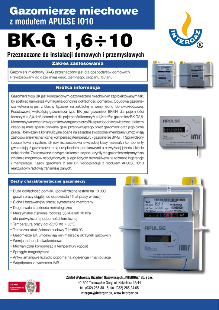 Gazomierze miechowe z modułem APULSE IO10 BK-G 1,6÷10 Przeznaczone do instalacji domowych i przemysłowych Zakres zastosowania Gazomierz miechowy BK-G przeznaczony jest dla gospodarstw domowych. Przystosowany do gazu miejskiego, ziemnego, propanu, butanu. Krótka informacja Gazomierz typu BK jest kompaktowym gazomierzem miechowym zaprojektowanym tak, by spełniać najwyższe wymagania odnośnie dokładności pomiarów. Obudowa gazomie rza wykonana jest z blachy łączonej na zakładkę w wersji jedno lub dwukróćcowej. Podstawową wielkością gazomierza typu BK jest gazomierz BK-G4 dla pojemności komory V = 2,0 dm3, natomiast dla pojemności komory V = l,2 dm3 to gazomierz BK-G2,5. MembranywmechanizmiepomiarowymgazomierzaBKsąswobodniezawieszone,efektem czego są małe spadki ciśnienia gazu przepływającego przez gazomierz oraz jego cicha praca. Rozwiązania konstrukcyjne oparte na zasadzie swobodnej membrany umożliwiają zastosowanie mechanicznej kompensacji temperatury - gazomierze BK-G...T. Sprawdzony i opatentowany system, jak również zastosowane wysokiej klasy materiały i komponenty gwarantują iż gazomierze te są urządzeniami pomiarowymi o najwyższej jakości i klasie dokładności. Zastosowane rozwiązania konstrukcyjne uczyniły ten gazomierz odpornym na działanie magnesów neodymowych, a jego liczydło niewrażliwym na rozmaite ingerencje i manipulacje. Każdy gazomierz z serii BK współpracuje z modułem APULSE IO10 realizującym radiową transmisję danych. Cechy charakterystyczne gazomierzy •Duża dokładność pomiaru (potwierdzone testem na 10 000 godzin pracy ciągłej, co odpowiada 15 lat pracy w sieci) •Cicha i bezawaryjna praca; syntetyczne membrany •Długotrwała stabilność metrologiczna •Maksymalne ciśnienie robocze 50 kPa lub 10 kPa dla podwyższonej odporności termicznej •Temperatura pracy od - 25°C do +55°C •Termiczna obciążalność budowy T1=650 °C •Gazomierze BK umożliwiają minimalizację skrzynek gazowych •Wersja jedno lub dwukróćcowa •Mechaniczna kompensacja temperatury (opcja) •Sprzęgło magnetyczne •Antywłamaniowe liczydło odporne na ingerencje i manipulacje •Współpraca z systemem IMR Zakład Wytwórczy Urządzeń Gazowniczych „INTERGAZ” Sp. z o.o. 42-600 Tarnowskie Góry, ul. Nakielska 42/44 tel. (032) 285 88 15, fax (032) 285 24 65 [email protected], www.intergaz.eu System IMR Przeznaczenie modułu APULSE IO10 Rejestrator APULSE I010 jest urządzeniem telemetrycznym w ramach systemu IMR (Integrated Meter Reading), służącym do rejestracji impulsów generowanych przez liczniki gazu produkcji Intergaz. Dedykowana konstrukcja gwarantuje obsługę typoszeregu gazomierzy miechowych: G1,6 – G10. Impulsy, zgodnie z konfiguracją, są przeliczane na jednostki objętości dając sumaryczny odczyt zużycia gazu. Ten parametr oraz inne dane pomiarowe i diagnostyczne są transmitowane drogą radiową do terminali inkasenckich (PSION, notebook) lub koncentratorów serii OKO. Każdy rejestrator posiada swój unikalny 8-cyfrowy numer identyfikacyjny (TID), pozwalający na równoczesny montaż wielu urządzeń na wspólnym obszarze (np. blokumieszkalnym). Moduł dostarczany przez producenta znajduje się w trybie uśpienia w celu oszczędzania energii. Uaktywnienie rejestratora APULSE I010 następuje poprzez zdjęcie naklejki zabezpieczającej. Moduł jest zsynchronizowany z liczydłem gazomierza. Cechy charakterystyczne APULSE IO10 • radiowa transmisja danych pomiarowych • interfejs optyczny do konfiguracji i odczytu danych archiwalnych • dwukierunkowy szyfrowany interfejs optyczny do konfiguracji i odczytu danych archiwalnych • wyświetlacz LCD • zakres temperatury pracy -25°C ÷ +50°C • dobowe i miesięczne archiwum pomiarów • godzinowy przepływ maksymalny • czas pracy z błędem • detekcja zewnętrznego pola magnetycznego • dane diagnostyczne pracy rejestratora i alarmy • transmisja danych w paśmie – 433,92 MHz • częstotliwość transmisji - co 90 sek. • max. zasięg 200 m • 10-letni czas pracy na baterii • stopień ochrony i szczelności IP40 • zgodność z normami i certyfikaty PN EN 50020 i PN EN 50014+AC, ATEX • współpraca z terminalami inkasenckimi Zakład Wytwórczy Urządzeń Gazowniczych „INTERGAZ” Sp. z o.o. 42-600 Tarnowskie Góry, ul. Nakielska 42/44 tel. (032) 285 88 15, fax (032) 285 24 65 [email protected], www.intergaz.eu Aiut Sp. z o.o. 44-100 Gliwice; ul. Wyczółkowskiego113 tel. +48.32.7754000 fax +48.32.7754001 [email protected] , http://www.imrgaz.com