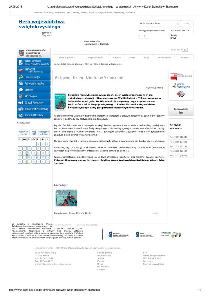 27.05.2015 Urząd Marszałkowski Województwa Świętokrzyskiego Wiadomości Aktywny Dzień Dziecka w Skansenie N a s tę p n a in fo rma c ja P o p rz e d n ia in fo rma c ja Imieniny: Armandy, Augustyna, Jana, Janiny, Juliana, Juliusza, Lucjana, Ludy, Magdaleny, Rodowita... Przejdź do menu strony Przejdź do wyszukiwarki Przejdź do treści Herb województwa świętokrzyskiego szukaj Wpisz szukaną frazę... Dodaj powiększ wyzeruj pomniejsz DLA NIEWIDOMYCH Zamek w Chęcinach P o ls k i Święty Krzyż E n g lis h Pałac Biskupów Krakowskich w Kielcach U M WŚ n a F a c e b o o k Lubię to! Strona główna Województwo Sejmik Zarząd Urząd Dla mediów 1 tys. Kontakt Jesteś tutaj: Strona główna Aktywny Dzień Dziecka w Skansenie Aktywny Dzień Dziecka w Skansenie wydrukuj stronę To będzie niezwykle intensywny dzień, pełen wielu przeznaczonych dla najmłodszych atrakcji Skansen Muzeum Wsi Kieleckiej w Tokarni zaprasza w Dzień Dziecka od godz. 10. Nie zabraknie aktywnego wypoczynku, zabaw, konkursów a także biegu przełajowego o Puchar Marszałka Województwa Świętokrzyskiego, który jest patronem honorowym wydarzenia. W programie Dnia Dziecka w Skansenie znalazły się warsztaty z plastyki obrzędowej, dawne gry i zabawy, zabawy w podchody czy partyzancka gra terenowa. Kalendarium Poprzedni miesiąc Pn Wt maj 2015 Następny miesiąc Śr Cz Pt So N 1 2 3 4 5 6 7 8 9 10 11 12 13 14 15 16 17 18 19 20 21 22 23 24 25 26 27 28 29 30 31 Będzie również mnóstwo sportowych atrakcji, bowiem głównym wydarzeniem będzie Bieg przełajowy o Puchar Marszałka Województwa Świętokrzyskiego. Dzieciaki będą mogły rywalizować również w turnieju gry w dwa ognie o Puchar Dyrektora MWK. Szczegóły zawodów (regulamin oraz karty zgłoszeniowe) znajdują się na stronie www.mwk.com.pl Archiwum wiadomości Nie zabraknie również występów zespołów dziecięcych, zabaw z animatorami czy konkursów z nagrodami. Rok 2010 (2788) Co ważne, tego dnia wstęp do skansenu dla wszystkich dzieci będzie bezpłatny. Do udziału w Dniu Dziecka zapraszane są również szkoły i przedszkola. Zabawa potrwa do godz. 15. Współorganizatorami przedsięwzięcia są Ludowe Zrzeszenie Sportowe oraz Szkolne Związki Sportowe. Patronat Honorowy nad wydarzeniem objął Marszałek Województwa Świętokrzyskiego, Adam Jarubas. Rok 2011 (2604) Rok 2009 (2719) Rok 2008 (2359) Rok 2007 (1809) Galeria zdjęć Data dodania: środa, 27 maja 2015r. cofnij W związku z nowelizacją Prawa zapisz i zamknij polityka prywatności Telekomunikacyjnego, informujemy, że nasz serwis internetowy korzysta z plików "cookies" (tzw. "ciasteczka"). Korzystanie z witryny bez zmiany ustawień dotyczących obsługi plików cookies oznacza, że akceptują Państwo korzystanie z nich na naszej stronie internetowej. W każdym czasie można dokonać zmiany ustawień dotyczących obsługi plików cookies. copyrights @ 2013 2015 Urząd Marszałkowski Województwa Świętokrzyskiego al. IX wieków Kielc 3 25516 Kielce tel.: 41 3421878 fax: 41 3445265 email: [email protected] Strona główna Województwo Sejmik Zarząd Urząd Dla mediów Kontakt http://www.sejmik.kielce.pl/item/45204aktywnydziendzieckawskansenie BIP Wrota Świętokrzyskie ITV Sejmik Kielce Facebook Polityka prywatności 1/1