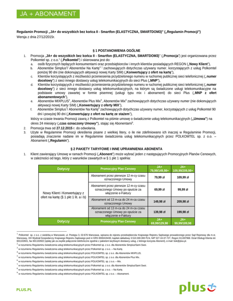 Regulamin Promocji „JA+ do wszystkich bez końca II - Smartfon (ELASTYCZNA, SMARTDOM3)” („Regulamin Promocji”) Wersja z dnia 27/12/2015r. 1. 2. 3. 1. § 1 POSTANOWIENIA OGÓLNE Promocja „JA+ do wszystkich bez końca II - Smartfon (ELASTYCZNA, SMARTDOM3)” („Promocja”) jest organizowana przez Polkomtel sp. z o.o.1 („Polkomtel”) i skierowana jest do: a. osób fizycznych będących konsumentami oraz przedsiębiorców i innych klientów posiadających REGON („Nowy Klient”), b. Abonentów Simplus2/ Abonentów Na Kartę3 ] zachowujących dotychczas używany numer, korzystających z usług Polkomtel poniżej 90 dni (nie dokonujących aktywacji nowej Karty SIM) („Konwertujący z ofert na kartę”), c. Klientów korzystających z możliwości przeniesienia przydzielonego numeru w ruchomej publicznej sieci telefonicznej („ numer docelowy”) z sieci innego dostawcy usług telekomunikacyjnych do sieci Plus („MNP”), d. Klientów korzystających z możliwości przeniesienia przydzielonego numeru w ruchomej publicznej sieci telefonicznej („ numer docelowy”) z sieci innego dostawcy usług telekomunikacyjnych, na którym są świadczone usługi telekomunikacyjne na podstawie umowy zawartej w formie pisemnej (usługi typu mix i abonament) do sieci Plus („MNP z ofert abonamentowych”), e. Abonentów MIXPLUS4, Abonentów Plus Mix5, Abonentów Mix6 zachowujących dotychczas używany numer (nie dokonujących aktywacji nowej Karty SIM) („Konwertujący z oferty MIX”), f. Abonentów Simplus7/ Abonentów Na Kartę8 zachowujących dotychczas używany numer, korzystających z usług Polkomtel 90 dni i powyżej 90 dni („Konwertujący z ofert na kartę ze stażem”), którzy w czasie trwania Promocji zawrą z Polkomtel na piśmie umowę o świadczenie usług telekomunikacyjnych („Umowa”) na okres 24 miesięcy („czas oznaczony Umowy”), stając się Abonentami9. Promocja trwa od 27.12.2015 r. do odwołania. Użyte w Regulaminie Promocji określenia pisane z wielkiej litery, o ile nie zdefiniowano ich inaczej w Regulaminie Promocji, posiadają znaczenie nadane im w Regulaminie świadczenia usług telekomunikacyjnych przez POLKOMTEL sp. z o.o. – Abonament („Regulamin”). § 2 PAKIETY TARYFOWE I INNE UPRAWNIENIA ABONENTA Klient zawierający Umowę w ramach Promocji („Abonent”) może wybrać jeden z następujących Promocyjnych Planów Cenowych, w zależności od tego, który z warunków zawartych w § 1 pkt 1 spełnia: Dotyczy Nowy Klient i Konwertujący z ofert na kartę (§ 1 pkt 1 lit. a i b) Dotyczy Promocyjny Plan Cenowy JA+ 79,99/149,98+ JA+ 109,99/209,98+ Abonament przez pierwsze 12 m-cy czasu oznaczonego Umowy 79,99 zł 109,99 zł Abonament przez pierwsze 12 m-cy czasu oznaczonego Umowy po opuście za włączenie e-Faktury 69,99 zł 99,99 zł Abonament od 13 m-ca do 24 m-ca czasu oznaczonego Umowy 149,98 zł 209,98 zł Abonament od 13 m-ca do 24 m-ca czasu oznaczonego Umowy po opuście za włączenie e-Faktury 139,98 zł 199,98 zł Promocyjny Plan Cenowy JA+ 69,99/129,98 JA+ 99,99/189,98 1 Polkomtel sp. z o.o. z siedzibą w Warszawie, ul. Postępu 3, 02-676 Warszawa, wpisana do rejestru przedsiębiorców Krajowego Rejestru Sądowego prowadzonego przez Sąd Rejonowy dla m.st. Warszawy, XIII Wydział Gospodarczy Krajowego Rejestru Sądowego pod nr KRS 0000419430, kapitał zakładowy 3.510.300.000 PLN, NIP 527-10-37-727, Regon 011307968. Dział Obsługi Klienta tel. 601102601, fax 601102602 (opłaty jak za zwykłe połączenie telefoniczne zgodnie z pakietem taryfowym dostawcy usług, z którego korzysta Abonent), e-mail: [email protected]. 2 w rozumieniu Regulaminu świadczenia usług telekomunikacyjnych przez Polkomtel sp. z o.o. dla Abonentów Simplus/Sami Swoi. 3 w rozumieniu Regulaminu świadczenia usług telekomunikacyjnych przez Polkomtel sp. z o.o. – Na Kartę. 4 w rozumieniu Regulaminu świadczenia usług telekomunikacyjnych przez POLKOMTEL sp. z o.o. dla Abonentów MIXPLUS. 5 w rozumieniu Regulaminu świadczenia usług telekomunikacyjnych przez POLKOMTEL sp. z o.o. dla Abonentów Plus Mix. 6 w rozumieniu Regulaminu świadczenia usług telekomunikacyjnych przez POLKOMTEL sp. z o.o. – Mix. 7 w rozumieniu Regulaminu świadczenia usług telekomunikacyjnych przez Polkomtel sp. z o.o. dla Abonentów Simplus/Sami Swoi. 8 w rozumieniu Regulaminu świadczenia usług telekomunikacyjnych przez Polkomtel sp. z o.o. – Na Kartę. 9 w rozumieniu Regulaminu świadczenia usług telekomunikacyjnych przez POLKOMTEL sp. z o.o. – Abonament. MNP, MNP z ofert abonamentowych, Konwertujący z oferty MIX i Konwertujący z ofert na kartę ze stażem (§ 1 pkt 1 lit. , c, d, e i f) 2. 3. 4. 5. Abonament przez pierwsze 12 m-cy czasu oznaczonego Umowy 69,99 zł 99,99 zł Abonament przez pierwsze 12 m-cy czasu oznaczonego Umowy po opuście za włączenie e-Faktury 59,99 zł 89,99 zł Abonament od 13 m-ca do 24 m-ca czasu oznaczonego Umowy 129,98 zł 189,98 zł Abonament od 13 m-ca do 24 m-ca czasu oznaczonego Umowy po opuście za włączenie e-Faktury 119,98 zł 179,98 zł Wszystkie podane w Regulaminie Promocji kwoty uwzględniają podatek od towarów i usług. Promocyjna opłata aktywacyjna wynosi 49 zł, a dla Abonentów spełniających warunki opisane w § 1 pkt. 1 lit. b lub e, lub f tj. Konwertujących z ofert na kartę i Konwertujących z oferty MIX, Konwertujący z ofert na kartę ze stażem promocyjna opłata aktywacyjna wynosi 0 zł. W ramach Promocji Abonent spełniający warunki opisane w § 1 pkt. 1 lit. d, tj. MNP z ofert abonamentowych otrzyma opust 100% na abonament przez 3 pierwsze pełne okresy rozliczeniowe od momentu aktywacji karty SIM/USIM w ramach Umowy Liczbę minut wliczonych w abonament oraz usługi/pakiety dodatkowe w poszczególnych Promocyjnych Planach Cenowych przedstawia tabela poniżej: JA+ 79,99/149,98+ JA+ 109,99/209,98+ JA+ 69,99/129,98 JA+ 99,99/189,98 Promocyjny Plan Cenowy Usługa „Połączenia bez limitu do wszystkich sieci ko