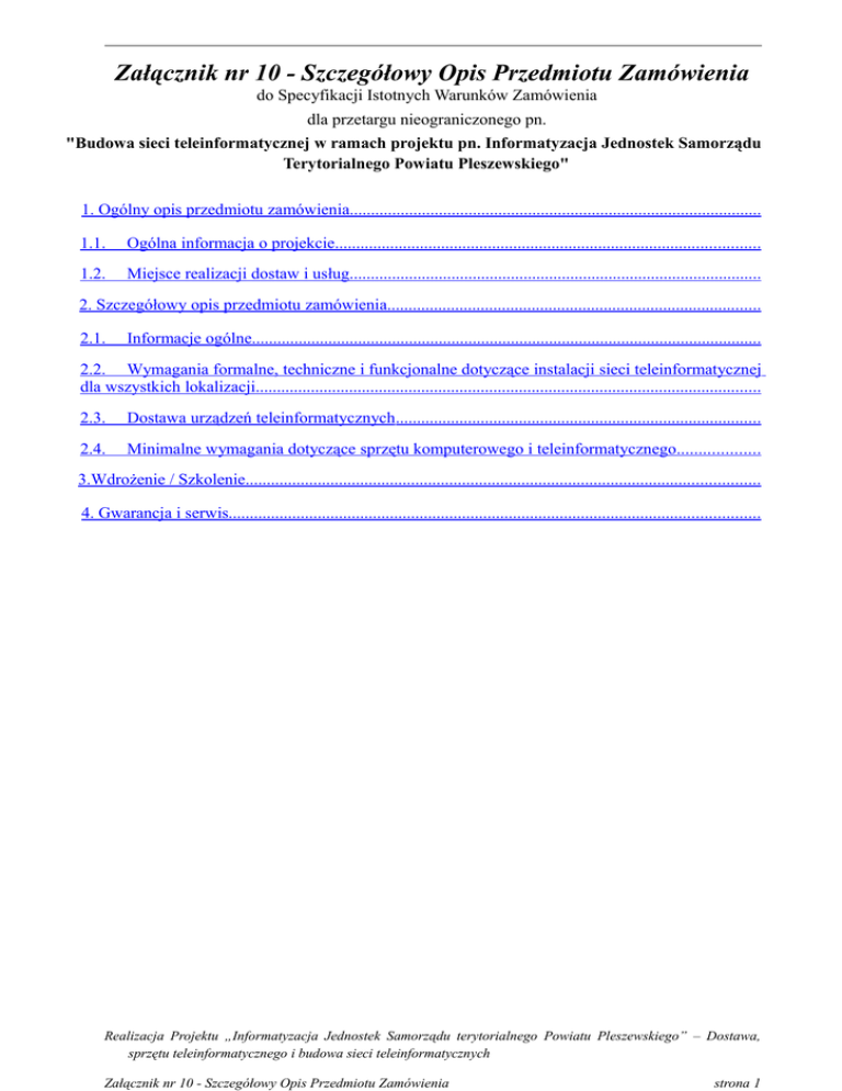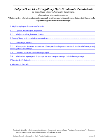 Załącznik nr 10 - Szczegółowy Opis Przedmiotu Zamówienia do Specyfikacji Istotnych Warunków Zamówienia dla przetargu nieograniczonego pn. "Budowa sieci teleinformatycznej w ramach projektu pn. Informatyzacja Jednostek Samorządu Terytorialnego Powiatu Pleszewskiego" 1. Ogólny opis przedmiotu zamówienia................................................................................................. 1.1. Ogólna informacja o projekcie.................................................................................................... 1.2. Miejsce realizacji dostaw i usług................................................................................................. 2. Szczegółowy opis przedmiotu zamówienia........................................................................................ 2.1. Informacje ogólne........................................................................................................................ 2.2. Wymagania formalne, techniczne i funkcjonalne dotyczące instalacji sieci teleinformatycznej dla wszystkich lokalizacji....................................................................................................................... 2.3. Dostawa urządzeń teleinformatycznych...................................................................................... 2.4. Minimalne wymagania dotyczące sprzętu komputerowego i teleinformatycznego................... 3.Wdrożenie / Szkolenie......................................................................................................................... 4. Gwarancja i serwis............................................................................................................................. Realizacja Projektu „Informatyzacja Jednostek Samorządu terytorialnego Powiatu Pleszewskiego” – Dostawa, sprzętu teleinformatycznego i budowa sieci teleinformatycznych Załącznik nr 10 - Szczegółowy Opis Przedmiotu Zamówienia strona 1 Słownik pojęć 1. Uczestnik projektu Uczestnik projektu „Informatyzacja Jednostek Samorządu Terytorialnego Powiatu Pleszewskiego” – Dostawa, instalacja i wdrożenie oprogramowania, modernizacja infrastruktury sprzętowej i teleinformatycznej oraz usługi szkoleniowe. Uczestnicy projektu zostali wyszczególnieni w punkcie 1.2 poniżej. Lider Powiat Pleszewski Ogólny opis przedmiotu zamówienia 1.1. Ogólna informacja o projekcie 1. Cały projekt obejmuje wdrożenie w urzędach platformy elektronicznej w postaci zintegrowanego i jednolitego systemu informatycznego obejmującego: a)elektroniczny obieg i wymianę dokumentów, b)elektroniczną archiwizację dokumentów, c)świadczenie elektronicznych usług dla ludności elektronicznego (załatwianie spraw przez Internet), z wykorzystaniem podpisu d)modernizację sprzętowej infrastruktury informatycznej gwarantującą sukces i trwałość wdrożenia, e)stworzenie bezpiecznego systemu transmisji danych, opartego o nowoczesne technologie łączy szerokopasmowych, transmisji bezprzewodowych oraz bezpieczny intranet. 2. Realizacja projektu ma zapewnić rozwiązanie szeregu problemów urzędu i podległych mu jednostek organizacyjnych, poprzez zaspokojenie następujących potrzeb: a)obsługę kancelarii i sekretariatów oraz wydziałów urzędu w zakresie elektronicznego obiegu dokumentów, b)obsługę wymiany informacji i dokumentów elektronicznych z innymi urzędami, jednostkami organizacyjnymi, podmiotami gospodarczymi i obywatelami w Polsce i Unii Europejskiej z wykorzystaniem technologii łączy szerokopasmowych, c)podniesienie bezpieczeństwa przechowywania i przesyłu danych (e-security), d)przyspieszenie rozwoju elektronicznych usług dla ludności poprzez uruchomienie załatwiania spraw przez Internet, e)automatyzację procesu przygotowywania i przekazywania treści do internetowego Biuletynu Informacji Publicznej, f)stworzenie podstaw działania systemu do pełnej obsługi zamówień publicznych w Internecie, g)uruchomienie procesu tworzenia regionalnych elektronicznych baz danych. 3. Niniejsze zamówienie obejmuje: a)Dostawę i wdrożenie sprzętu teleinformatycznego, w tym wykonanie okablowania sieci teleinformatycznych, b)Wdrożenia oraz szkolenia dla użytkowników, liderów oraz administratorów. 1.2. Miejsce realizacji dostaw i usług 4. Dostawy i usługi realizowane będą w następujących jednostkach samorządu terytorialnego: a) Starostwo Powiatowe w Pleszewie, ul. Poznańska 79, 63-300 Pleszew, b) Urząd Miasta i Gminy Pleszew, 63-300 Pleszew, Rynek 1, c) Urząd Gminy Gizałki ul. Kaliska 28, 63-308 Gizałki, d) Urząd Gminy Gołuchów ul. Lipowa 1, 63-322 Gołuchów, e) Urząd Gminy Chocz, ul. Rynek 1, 63-313 Chocz, f) Urząd Gminy w Czerminie, 63-304 Czermin 47, g) Urząd Gminy ul. Rynek 14, 63-330 Dobrzyca. 2. Szczegółowy opis przedmiotu zamówienia 2.1. Informacje ogólne Przedmiotem zamówienia jest modernizacja infrastruktury teleinformatycznej dla urzędów: Powiat Pleszewski, Gmina Pleszew, Gminy Gizałki, Gminy Gołuchów, Gminy Chocz, Gmina Czermin, Gmina Dobrzyca. 1. Wykonawca dokona realizacji w określonych obiektach urzędów przeznaczonych na budowę lub modernizację systemu sieci informatycznej LAN z zachowaniem opisanego poniżej standardu wykonania i ilości punktów logicznego dostępu do sieci. 2. W urzędach, w których wymagane jest wykonanie sieci teleinformatycznej niezbędne jest wykonanie niezależnego węzła głównego pozwalającego na realizację połączeń w sieci LAN oraz współdzielone dla wszystkich lokalnych jednostek komputerowych wyjście do sieci Internetu. 3. Okablowanie powinno być wykonane systemem naściennym w korytach z tworzywa sztucznego. 4. Wykonawca dokona doposażenia węzła głównego w takie urządzenia, które pozwolą na prawidłową pracę z wykorzystaniem Internetu dla jednocześnie pracujących wszystkich jednostek komputerowych oraz zapewnią prawidłowe działanie ze stykiem urządzenia ( brzegowe urządzenie komuni