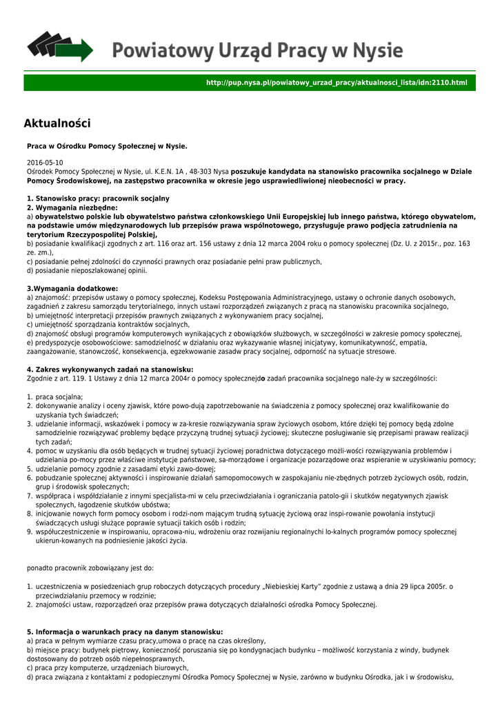 http://pup.nysa.pl/powiatowy_urzad_pracy/aktualnosci_lista/idn:2110.html Aktualności Praca w Ośrodku Pomocy Społecznej w Nysie. 2016-05-10 Ośrodek Pomocy Społecznej w Nysie, ul. K.E.N. 1A , 48-303 Nysa poszukuje kandydata na stanowisko pracownika socjalnego w Dziale Pomocy Środowiskowej, na zastępstwo pracownika w okresie jego usprawiedliwionej nieobecności w pracy. 1. Stanowisko pracy: pracownik socjalny 2. Wymagania niezbędne: a) obywatelstwo polskie lub obywatelstwo państwa członkowskiego Unii Europejskiej lub innego państwa, którego obywatelom, na podstawie umów międzynarodowych lub przepisów prawa wspólnotowego, przysługuje prawo podjęcia zatrudnienia na terytorium Rzeczypospolitej Polskiej, b) posiadanie kwalifikacji zgodnych z art. 116 oraz art. 156 ustawy z dnia 12 marca 2004 roku o pomocy społecznej (Dz. U. z 2015r., poz. 163 ze. zm.), c) posiadanie pełnej zdolności do czynności prawnych oraz posiadanie pełni praw publicznych, d) posiadanie nieposzlakowanej opinii. 3.Wymagania dodatkowe: a) znajomość: przepisów ustawy o pomocy społecznej, Kodeksu Postępowania Administracyjnego, ustawy o ochronie danych osobowych, zagadnień z zakresu samorządu terytorialnego, innych ustawi rozporządzeń związanych z pracą na stanowisku pracownika socjalnego, b) umiejętność interpretacji przepisów prawnych związanych z wykonywaniem pracy socjalnej, c) umiejętność sporządzania kontraktów socjalnych, d) znajomość obsługi programów komputerowych wynikających z obowiązków służbowych, w szczególności w zakresie pomocy społecznej, e) predyspozycje osobowościowe: samodzielność w działaniu oraz wykazywanie własnej inicjatywy, komunikatywność, empatia, zaangażowanie, stanowczość, konsekwencja, egzekwowanie zasadw pracy socjalnej, odporność na sytuacje stresowe. 4. Zakres wykonywanych zadań na stanowisku: Zgodnie z art. 119. 1 Ustawy z dnia 12 marca 2004r o pomocy społecznejdo zadań pracownika socjalnego należy w szczególności: 1. praca socjalna; 2. dokonywanie analizy i oceny zjawisk, które powodują zapotrzebowanie na świadczenia z pomocy społecznej oraz kwalifikowanie do uzyskania tych świadczeń; 3. udzielanie informacji, wskazówek i pomocy w zakresie rozwiązywania spraw życiowych osobom, które dzięki tej pomocy będą zdolne samodzielnie rozwiązywać problemy będące przyczyną trudnej sytuacji życiowej; skuteczne posługiwanie się przepisami prawaw realizacji tych zadań; 4. pomoc w uzyskaniu dla osób będących w trudnej sytuacji życiowej poradnictwa dotyczącego możliwości rozwiązywania problemów i udzielania pomocy przez właściwe instytucje państwowe, samorządowe i organizacje pozarządowe oraz wspieranie w uzyskiwaniu pomocy; 5. udzielanie pomocy zgodnie z zasadami etyki zawodowej; 6. pobudzanie społecznej aktywności i inspirowanie działań samopomocowych w zaspokajaniu niezbędnych potrzeb życiowych osób, rodzin, grup i środowisk społecznych; 7. współpraca i współdziałanie z innymi specjalistami w celu przeciwdziałania i ograniczania patologii i skutków negatywnych zjawisk społecznych, łagodzenie skutków ubóstwa; 8. inicjowanie nowych form pomocy osobom i rodzinom mającym trudną sytuację życiową oraz inspirowanie powołania instytucji świadczących usługi służące poprawie sytuacji takich osób i rodzin; 9. współuczestniczenie w inspirowaniu, opracowaniu, wdrożeniu oraz rozwijaniu regionalnychi lokalnych programów pomocy społecznej ukierunkowanych na podniesienie jakości życia. ponadto pracownik zobowiązany jest do: 1. uczestniczenia w posiedzeniach grup roboczych dotyczących procedury „Niebieskiej Karty” zgodnie z ustawą a dnia 29 lipca 2005r. o przeciwdziałaniu przemocy w rodzinie; 2. znajomości ustaw, rozporządzeń oraz przepisów prawa dotyczących działalności ośrodka Pomocy Społecznej. 5. Informacja o warunkach pracy na danym stanowisku: a) praca w pełnym wymiarze czasu pracy,umowa o pracę na czas określony, b) miejsce pracy: budynek piętrowy, konieczność poruszania się po kondygnacjach budynku – możliwość korzystania z windy, budynek dostosowany do potrzeb osób niepełnosprawnych, c) praca przy komputerze, urządzeniach biurowych, d) praca związana z kontaktami z podopiecznymi Ośrodka Pomocy Społecznej w Nysie, zarówno w budynku Ośrodka, jak i w środowisku, e) praca wymaga umiejętnego współdziałania z osobami i rodzinami, z psychologiem, terapeutami oraz innymi osobami i instytucjami, z którymi wymagany będzie kontakt z uwagi na charakter pracy. 6. Wymagane dokumenty: a) list motywacyjny, b) życiorys (CV) z przebiegiem nauki i pracy zawodowej, c) kopie dokumentów potwierdzających wykształcenie, d) kopie dokumentów potwierdzających przebieg zatrudnienia (kopie świadectw pracy, referencji, opinii, zaświadczeń o odbytych kursach , szkoleniach), e) oświadczenie o posiadaniu pełnej zdolności do czynności prawnych i korzystaniu z pełni praw publicznych, f) oświadczenie kandydata o braku skazania prawomocnym wyrokiem sądu za umyślne przestępstwo ścigane z oskarżenia publicznego i za umyślne przestępstwo skarbowe, g) kwestionariusz osobowy. Dokumenty należy składać osobiście lub za pośrednictwem poczty) do dnia 13.05.2016r. do godziny 12.00 w siedzibie OPS w Nysie przy ul. K.E.N 1A. , pokój nr 39,( sekretariat) w zamkniętej kopercie z dopiskiem „Ogłoszenie o zatrudnieniu na zastępstwo na stanowisko: pracownik socjalny”. Osoby zostaną powiadomione telefonicznie, pocztą elektroniczną lub listownie o terminie przeprowadzenia rozmowy w sprawie zatrudnienia. Wymagane dokumenty aplikacyjne: list motywacyjny, CV (z uwzględnieniem dokładnego przebiegu kariery zawodowej), kwestionariusz osobowy powinny być opatrzone klauzulą: "Wyrażam zgodę na przetwarzanie moich danych osobowych zawartych w ofercie dla potrzeb niezbędnych do realizacji procesu rekrutacji zgodnie z ustawą z dnia 29 sierpnia 199
