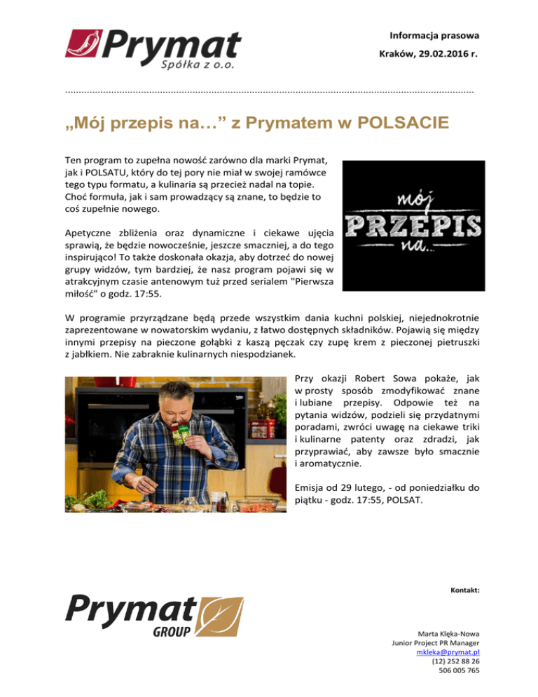 Informacja prasowa Kraków, 29.02.2016 r. ....................................................................................................................................................... „Mój przepis na…” z Prymatem w POLSACIE Ten program to zupełna nowość zarówno dla marki Prymat, jak i POLSATU, który do tej pory nie miał w swojej ramówce tego typu formatu, a kulinaria są przecież nadal na topie. Choć formuła, jak i sam prowadzący są znane, to będzie to coś zupełnie nowego. Apetyczne zbliżenia oraz dynamiczne i ciekawe ujęcia sprawią, że będzie nowocześnie, jeszcze smaczniej, a do tego inspirująco! To także doskonała okazja, aby dotrzeć do nowej grupy widzów, tym bardziej, że nasz program pojawi się w atrakcyjnym czasie antenowym tuż przed serialem "Pierwsza miłość" o godz. 17:55. W programie przyrządzane będą przede wszystkim dania kuchni polskiej, niejednokrotnie zaprezentowane w nowatorskim wydaniu, z łatwo dostępnych składników. Pojawią się między innymi przepisy na pieczone gołąbki z kaszą pęczak czy zupę krem z pieczonej pietruszki z jabłkiem. Nie zabraknie kulinarnych niespodzianek. Przy okazji Robert Sowa pokaże, jak w prosty sposób zmodyfikować znane i lubiane przepisy. Odpowie też na pytania widzów, podzieli się przydatnymi poradami, zwróci uwagę na ciekawe triki i kulinarne patenty oraz zdradzi, jak przyprawiać, aby zawsze było smacznie i aromatycznie. Emisja od 29 lutego, - od poniedziałku do piątku - godz. 17:55, POLSAT. Kontakt: Marta Klęka-Nowa Junior Project PR Manager [email protected] (12) 252 88 26 506 005 765