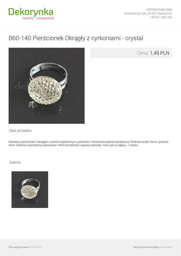 INFOBIS Rafał Głąb Mickiewicza 42a, 43-331 Dankowice +48 601 662 442 B60-140 Pierścionek Okrągły z cyrkoniami - crystal Cena: 1,49 PLN Opis produktu Metalowy pierścionek z okrągłym oczkiem wypełnionym cyrkoniami. Pierścionek pięknie się błyszczy! Średnica oczka 16mm, grubość 4mm. Średnica wewnętrzna pierścionka 16mm (możliwość regulacji obwodu). Kolor jak na zdjęciu. 1 sztuka. Galeria Plik wygenerowano: 07-03-2017 Powered by TCPDF (www.tcpdf.org) Oprogramowanie sklepu: AptusShop