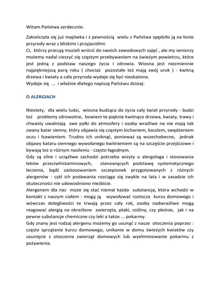 Witam Państwa serdecznie. Zakończyła się już majówka i z pewnością wielu z Państwa spędziło ją na łonie przyrody wraz z bliskimi i przyjaciółmi. Ci, którzy pracują musieli wrócić do swoich zawodowych zajęć , ale my seniorzy możemy nadal cieszyć się częstym przebywaniem na świeżym powietrzu, które jest jedną z podstaw naszego życia i zdrowia. Wiosna jest niezmiennie najpiękniejszą porą roku ( chociaż pozostałe też mają swój urok ) - kwitną drzewa i kwiaty a cała przyroda wydaje się być nieskażona. Wydaje się ... i właśnie dlatego napiszę Państwu dzisiaj: O ALERGIACH Niestety, dla wielu ludzi, wiosna budząca do życia cały świat przyrody - budzi też problemy zdrowotne, bowiem te pięknie kwitnące drzewa, kwiaty, trawy i chwasty uwalniają swe pyłki do atmosfery i osoby wrażliwe na nie mają tak zwany katar sienny, który objawia się częstym kichaniem, kaszlem, swędzeniem oczu i łzawieniem. Trudno ich uniknąć, ponieważ są wszechobecne, jednak objawy kataru siennego wywołanego kwitnieniem są na szczęście przejściowe i bywają też o różnym nasileniu - często łagodnym. Gdy są silne i uciążliwe zachodzi potrzeba wizyty u alergologa i stosowania leków przeciwhistaminowych, stanowiących podstawę systematycznego leczenia, bądź zastosowaniem szczepionek przygotowanych z różnych alergenów - cykl ich podawania rozciąga się zwykle na lata i w zasadzie ich skuteczności nie udowodniono niezbicie. Alergenem dla nas może się stać niemal każda substancja, która wchodzi w kontakt z naszym ciałem : mogą ją wywoływać roztocza kurzu domowego i wówczas dolegliwości te trwają przez cały rok, osoby nadwrażliwe mogą reagować alergią na określone zwierzęta, ptaki, rośliny, czy pleśnie, jak i na pewne substancje chemiczne czy leki a także ... pokarmy. Gdy znany jest rodzaj alergenu możemy go usunąć z nasze otoczenia poprzez : częste sprzątanie kurzu domowego, unikanie w domu świeżych kwiatów czy usunięcie z otoczenia zwierząt domowych lub wyeliminowanie pokarmu z pożywienia. Gdy jednak nie mamy tej świadomości, szczególnie w przypadku pokarmów lub leków, może dojść do ciężkiej i zagrażającej życiu reakcji alergicznej - wstrząsu anafilaktycznego. Alergia oznacza nadmierną i niewłaściwą reakcję układu odpornościowego w odpowiedzi na obcą substancję . Prawidłowo działający układ odpornościowy broni nas przed substancjami szkodliwymi, ale dlaczego broni nas również przed substancjami dla nas tak pożytecznymi, a nawet niezbędnymi do życia, jak pokarmy, tego już często nie rozumiemy. Otóż, wg klasycznej definicji za alergię uważa się patologiczną, zmienioną jakościowo odpowiedź układu immunologicznego na substancję z natury obojętną czy nawet pożyteczną dla naszego zdrowia. Istnieje kilka typów takich reakcji. Większość z nich wiąże się z wytworzeniem przeciwciał - specyficznych białek, które pełnią funkcję markerów substancji niepożądanej. I tak w reakcji natychmiastowej ( typu I ) biorą udział immunoglobuliny typu IgE, wytworzone wcześniej przez limfocyty w odpowiedzi na pierwszy kontakt z alergenem i umocowane na powierzchni innych komórek układu immunologicznego - tak zwanych komórek tucznych. Komórki te zawierają liczne ziarnistości a w nich zmagazynowane substancje - przede wszystkim histaminę - które pełnią w naszym organiźmie funkcję broni chemicznej do szybkiego użycia w razie sygnału alarmowego . Takim sygnałem jest ponowne pojawienie się intruza , czyli alergenu w organiźmie: IgE wyłapują go bezbłędnie i pobudzają komórki tuczne do opróżnienia swoich arsenałów. Proces ten nosi nazwę degranulacji, a uwolniona z ziarnistości histamina wywołuje szereg reakcji zapalno - uczuleniowych, takich jak: pokrzywkę skórną, łzawienie oczu, katar, napadowy skurcz oskrzeli a w razie silnej i uogólnionej odpowiedzi - np. po ukąszeniu owada i rzadziej - po zjedzeniu pewnych pokarmów - może dojść do wspomnianego już wstrząsu anafilaktycznego , który jest stanem bezpośredniego zagrożenia życia. Jednak nie każda odpowiedź alergiczna przebiega w ten sposób. Większość alergii pokarmowych, m. in.: na orzeszki, skorupiaki, niektóre warzywa , owoce czy zboża - nie ujawnia się natychmiast , ale z opóźnieniem rzędu od jednej godziny do trzech dni. W tych opóźnionych reakcjach biorą udział inne przeciwciała, tym razem z klasy IgG. W przeciwieństwie do IgE nie mają one związku z komórkami tucznymi ich zadanie polega na wychwytywaniu specyficznych antygenów i tworzeniu z nimi nierozerwalnych "par" skupiających się w większe kompleksy, które następnie są unieszkodliwiane przez inne komórki, zwłaszcza granulocyty obojętnochłonne ( neutrofile ), w mechaniźmie fagocytozy. Alergie tego typu są oczywiście znacznie trudniejsze do wykrycia, ponieważ ujawniają się nie tylko później ale i w mniej spektakularny sposób i można pomylić je np. ze zwykłą niestrawnością. Intensywność reakcji z udziałem IgG zależy przede wszystkim od liczby wspomnianych już kompleksów immunologicznych. Jeśli ich unicestwianie przebiega dostatecznie sprawnie, organizm jako całość nie ponosi większej szkody. Jeśli jednak jest ich zbyt dużo, mogą się odkładać w tkankach, blokować naczynia włosowate i powodować różne zaburzenia w organiźmie. Znane powiedzenie, że " nieszczęścia chodzą zwykle parami " bardzo pasuje do alergii, gdyż i ona z reguły nie ogranicza się tylko do jednej substancji. W porze pylenia traw na katar sienny zapada więcej mieszkańców zanieczyszczonych miast niż wsi , mimo, że stężenie pyłków jest znacznie większe na obszarach pozamiejskich. Najprawdopodobniej odpowiada za to mechanizm tak zwanej "krzyżowej" nadwrażliwości: pobudzony układ immunologiczny ludzi uczulonych na dymy przemysłowe, spaliny i kurz, reaguje po prostu silniej na inn