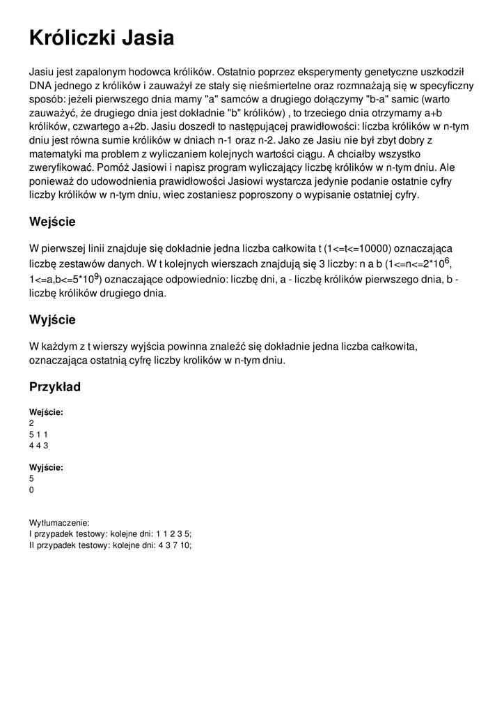 Króliczki Jasia Jasiu jest zapalonym hodowca królików. Ostatnio poprzez eksperymenty genetyczne uszkodził DNA jednego z królików i zauważył ze stały się nieśmiertelne oraz rozmnażają się w specyficzny sposób: jeżeli pierwszego dnia mamy "a" samców a drugiego dołączymy "b-a" samic (warto zauważyć, że drugiego dnia jest dokładnie "b" królików) , to trzeciego dnia otrzymamy a+b królików, czwartego a+2b. Jasiu doszedł to następującej prawidłowości: liczba królików w n-tym dniu jest równa sumie królików w dniach n-1 oraz n-2. Jako ze Jasiu nie był zbyt dobry z matematyki ma problem z wyliczaniem kolejnych wartości ciągu. A chciałby wszystko zweryfikować. Pomóż Jasiowi i napisz program wyliczający liczbę królików w n-tym dniu. Ale ponieważ do udowodnienia prawidłowości Jasiowi wystarcza jedynie podanie ostatnie cyfry liczby królików w n-tym dniu, wiec zostaniesz poproszony o wypisanie ostatniej cyfry. Wejście W pierwszej linii znajduje się dokładnie jedna liczba całkowita t (1<=t<=10000) oznaczająca liczbę zestawów danych. W t kolejnych wierszach znajdują się 3 liczby: n a b (1<=n<=2*106, 1<=a,b<=5*109) oznaczające odpowiednio: liczbę dni, a - liczbę królików pierwszego dnia, b liczbę królików drugiego dnia. Wyjście W każdym z t wierszy wyjścia powinna znaleźć się dokładnie jedna liczba całkowita, oznaczająca ostatnią cyfrę liczby krolików w n-tym dniu. Przykład Wejście: 2 511 443 Wyjście: 5 0 Wytłumaczenie: I przypadek testowy: kolejne dni: 1 1 2 3 5; II przypadek testowy: kolejne dni: 4 3 7 10;