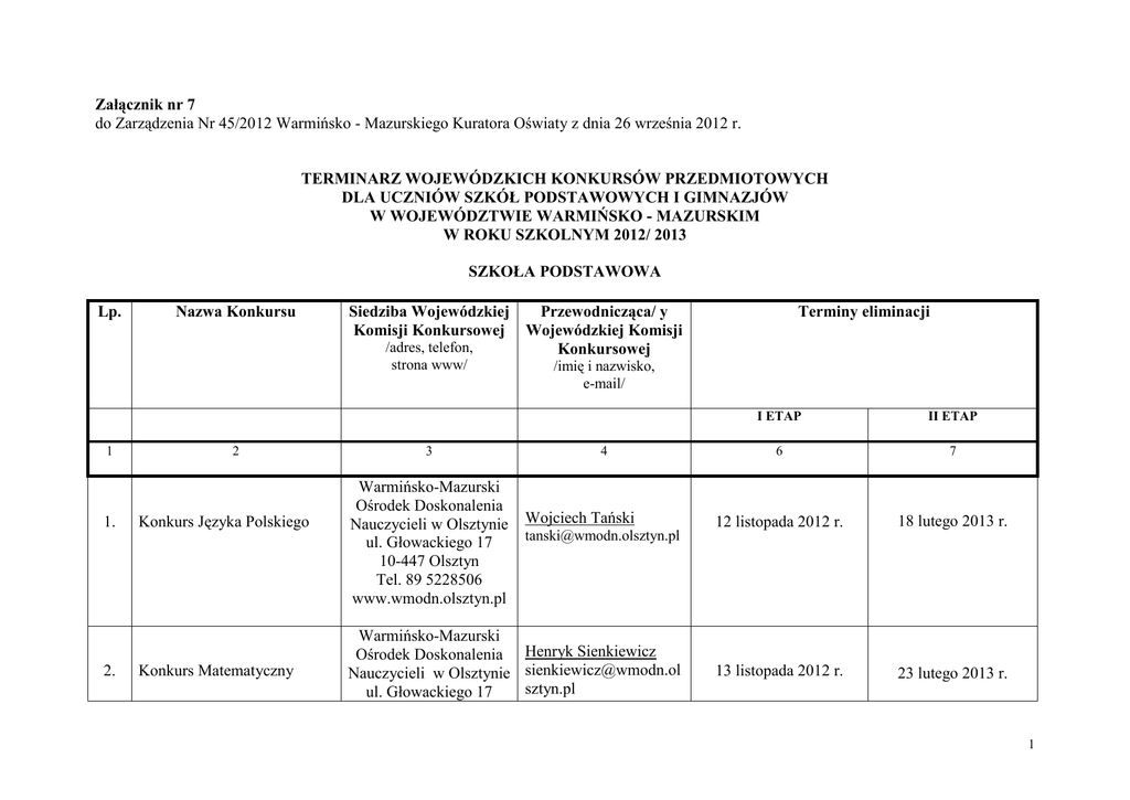 Załącznik nr 7 do Zarządzenia Nr 45/2012 Warmińsko - Mazurskiego Kuratora Oświaty z dnia 26 września 2012 r. TERMINARZ WOJEWÓDZKICH KONKURSÓW PRZEDMIOTOWYCH DLA UCZNIÓW SZKÓŁ PODSTAWOWYCH I GIMNAZJÓW W WOJEWÓDZTWIE WARMIŃSKO - MAZURSKIM W ROKU SZKOLNYM 2012/ 2013 SZKOŁA PODSTAWOWA Lp. Nazwa Konkursu Siedziba Wojewódzkiej Komisji Konkursowej /adres, telefon, strona www/ 1 1. 2. 2 Konkurs Języka Polskiego Konkurs Matematyczny 3 Warmińsko-Mazurski Ośrodek Doskonalenia Nauczycieli w Olsztynie ul. Głowackiego 17 10-447 Olsztyn Tel. 89 5228506 www.wmodn.olsztyn.pl Przewodnicząca/ y Wojewódzkiej Komisji Konkursowej Terminy eliminacji /imię i nazwisko, e-mail/ 4 Wojciech Tański [email protected] Warmińsko-Mazurski Ośrodek Doskonalenia Henryk Sienkiewicz Nauczycieli w Olsztynie [email protected] sztyn.pl ul. Głowackiego 17 I ETAP II ETAP 6 7 12 listopada 2012 r. 18 lutego 2013 r. 13 listopada 2012 r. 23 lutego 2013 r. 1 10-447 Olsztyn Tel. 89 5228501 www.wmodn.olsztyn.pl 3. Konkurs Historyczny Olsztyńska Szkoła Wyższa im. J. Rusieckiego w Olsztynie ul. Bydgoska 33 10-243 Olsztyn Tel. 89 5268722 4. Konkurs Przyrodniczy www.osw.olsztyn.pl Mazurski Ośrodek Doskonalenia Nauczycieli w Ełku ul. Gen. Wł. Sikorskiego 5A 19-300 Ełk tel. 87 6211071 www.modn.elk.pl 5. Konkurs Języka Angielskiego Grupa OSB s.c. Bożena Ziomek i Adam Ziomek ul. Warszawska 105/4H 10-701 Olsztyn Tel. 89 5424274 Maciej Szczyglak [email protected] 14 listopada 2012 r. 20 lutego 2013 r. Regina Merchelska e-mail: [email protected] 15 listopada 2012 r. 21 lutego 2013 r. Daria Kowalczyk 16 listopada 2012 r. 02 marca 2013 r. biuro@kolegiumjezykowe .edu.pl www.kolegiumjezykowe.edu. pl 2 GIMNAZJUM Lp. 1 1. 2. Nazwa Konkursu 2 Konkurs Języka Polskiego Konkurs Języka Niemieckiego Siedziba Wojewódzkiej Komisji Konkursowej /adres, telefon, strona www/ 3 Warmińsko-Mazurski Ośrodek Doskonalenia Nauczycieli w Olsztynie ul. Głowackiego 17 10-447 Olsztyn Tel. 89 5228506 www.wmodn.olsztyn.pl Polskie Stowarzyszenie Nauczycieli Języka Niemieckiego Oddział w Olsztynie, ul. Okopowa 25, 10-075 Olsztyn Tel. 89 5228518 Przewodnicząca/ y Wojewódzkiej Komisji Konkursowej /imię i nazwisko, e-mail/ 4 Elżbieta Jermacz Terminy eliminacji I ETAP II ETAP 6 7 12 listopada 2012 r. 18 lutego 2013 r. 19 listopada 2012 r. 25 lutego 2013 r. 16 listopada 2012 r. 02 marca 2013 r. [email protected] Jadwiga Piskorska [email protected] www.olsztyn.deutsch.info. pl 3. Konkurs Języka Angielskiego Grupa OSB s.c. Bożena Ziomek i Adam Ziomek ul. Warszawska 105/4H Marcin Poroszewski biuro@kolegiumjezykowe. 3 10-701 Olsztyn Tel. 89 5424274 edu.pl www.kolegiumjezykowe.edu. pl 4. 5. 6. 7. Konkurs Języka Francuskiego Konkurs Języka Rosyjskiego Konkurs Geograficzny Konkurs Historyczny Stowarzyszenie Nauczycieli Języka Francuskiego PROFEUROPE, oddział w Olsztynie ul. Dąbrowszczaków 39,Ip. 10-542 Olsztyn tel. 512495398 Uniwersytet Warmińsko-Mazurski Studium Języków Obcych ul. Obrońców Tobruku 3 10-719 Olsztyn Tel. 89 5233814 www.uwm.edu.pl Olsztyńska Szkoła Wyższa im. J. Rusieckiego ul. Bydgoska 33 10-243 Olsztyn Tel. 89 5268722 www.osw.olsztyn.pl Warmińsko-Mazurski Ośrodek Doskonalenia Nauczycieli w Elblągu ul. Wojska Polskiego 1 82-300 Elbląg Tel. 55 6435252 wew. 36 Jan Horbacz [email protected] 20 listopada 2012 r. 26 lutego 2013 r. Nina Zielińska [email protected] 21 listopada 2012 r. 27 lutego 2013 r. Zofia Wojtkowicz (przedstawiciel OSW – Agnieszka Świerczyńska) [email protected] 22 listopada 2012r. 28 lutego 2013 r. 14 listopada 2012 r. 20 lutego 2013 r. Irena Poździech [email protected] 4 8. Konkurs Biologiczny 9. Konkurs Chemiczny 10. 11. Konkurs Fizyczny Konkurs Matematyczny Warmińsko-Mazurski Ośrodek Doskonalenia Nauczycieli Anna Mościcka w Olsztynie [email protected] ul. Głowackiego 17 10-447 Olsztyn Tel. 89 5228520 www.wmodn.olsztyn.pl Warmińsko-Mazurski Ośrodek Doskonalenia Nauczycieli w Elblągu Krzysztof Błaszczak [email protected] ul. Wojska Polskiego 1 82-300 Elbląg Tel. 55 6435252 wew. 36 www.wmodn.elblag.pl Warmińsko-Mazurski Ośrodek Doskonalenia Nauczycieli w Olsztynie ul. Głowackiego 17 10-447 Olsztyn Tel. 89 5228520 www.wmodn.olsztyn.pl Uniwersytet WarmińskoMazurski Wydział Matematyki i Informatyki ul. Słoneczna 54, p. E 0/7 10-710 Olsztyn tel.: (89) 524 60 33 Leszek Kalinowski 15 listopada 2012 r. 21 lutego 2013 r. 23 listopada 2012 r. 1 marca 2013 r. 26 listopada 2012 r. 4 marca 2013 r. 13 listopada 2012 r. 19 lutego 2013 r. [email protected] n.pl dr Stanisław Drozda [email protected] www.uwm.edu.pl 5