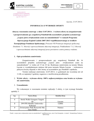 Łęczna, 21.07.2011r. INFORMACJA O WYBORZE OFERTY dotyczy rozeznania cenowego z dnia 13.07.2011r. i wyboru oferty na zorganizowanie i przeprowadzenie gry zespołowej Paintball dla uczestników projektu systemowego „Lepsze jutro zwiększeniem szans na samodzielność” w ramach Programu Operacyjnego Kapitał Ludzki 2007-2013 współfinansowanego ze środków Europejskiego Funduszu Społecznego, Priorytet VII Promocja integracji społecznej, Działanie 7.1. Rozwój i upowszechnianie aktywnej integracji, Poddziałanie 7.1.2. Rozwój i upowszechnianie aktywnej integracji przez powiatowe centra pomocy rodzinie. 1. Opis przedmiotu zamówienia: Zorganizowanie i przeprowadzenie gry zespołowej Paintball dla 16 uczestników projektu systemowego „Lepsze jutro zwiększeniem szans na samodzielność” w wieku od 15 do 25 lat. Realizacja zamówienia na terenie Miasta Łęczna w wyodrębnionym miejscu lub poza terenem Miasta Łęczna - wykonawca pokrywa koszty dojazdu w obie strony za uczestników gry Paintball i opiekuna. Termin realizacji zmówienia: 22.07.2011r. w godzinach nie wcześniej niż od 11.00, co najmniej 2 godziny zegarowe z możliwością przedłużenia. 2. Wybór oferty - wybrano ofertę: 100% najkorzystniejsza cena brutto za wykonanie zamówienia. 3. Uzasadnienie: We wskazanym w rozeznaniu terminie wpłynęły 3 oferty, w tym wymogi formalne spełniły 3: Lp. Nazwa firmy 1 Strefa Walki Grzegorz Targoński 299 FPS Monika Tarkowska Kukuryk Zwierzyniec-Park Rozrywki Mariusz Siejko 2 3 Siedziba firmy Łęczna Lublin Niemce Projekt „Lepsze jutro zwiększeniem szans na samodzielność” współfinansowany przez Unię Europejską w ramach Europejskiego Funduszu Społecznego Firma Strefa Walki Grzegorza Targońskiego z siedzibą w Łęcznej za wykonanie zamówienia zaproponowała najniższą kwotę brutto, nie przekraczającą założonej kwoty, zgodnie z harmonogramem budżetu projektu. W/w firma spełnia wymogi zawarte w rozeznaniu cenowym, co rokuje, iż odpowiedzialnie i solidnie wykona zadanie będące przedmiotem zamówienia w ramach realizacji projektu systemowego „Lepsze jutro zwiększeniem szans na samodzielność”. Projekt „Lepsze jutro zwiększeniem szans na samodzielność” współfinansowany przez Unię Europejską w ramach Europejskiego Funduszu Społecznego