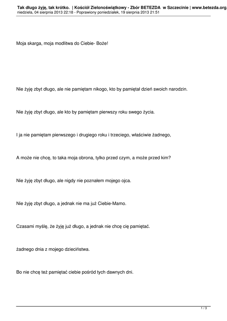 Tak długo żyję, tak krótko. | Kościół Zielonoświątkowy - Zbór BETEZDA w Szczecinie | www.betezda.org. niedziela, 04 sierpnia 2013 22:18 - Poprawiony poniedziałek, 19 sierpnia 2013 21:51 Moja skarga, moja modlitwa do Ciebie- Boże! Nie żyję zbyt długo, ale nie pamiętam nikogo, kto by pamiętał dzień swoich narodzin. Nie żyję zbyt długo, ale kto by pamiętam pierwszy roku swego życia. I ja nie pamiętam pierwszego i drugiego roku i trzeciego, właściwie żadnego, A może nie chcę, to taka moja obrona, tylko przed czym, a może przed kim? Nie żyję zbyt długo, ale nigdy nie poznałem mojego ojca. Nie żyję zbyt długo, a jednak nie ma już Ciebie-Mamo. Czasami myślę, że żyję już długo, a jednak nie chcę cię pamiętać. żadnego dnia z mojego dzieciństwa. Bo nie chcę też pamiętać ciebie pośród tych dawnych dni. 1/3 Tak długo żyję, tak krótko. | Kościół Zielonoświątkowy - Zbór BETEZDA w Szczecinie | www.betezda.org.p niedziela, 04 sierpnia 2013 22:18 - Poprawiony poniedziałek, 19 sierpnia 2013 21:51 Bólu, głodu, strachu, ucieczek z domu bez miłości, tych złych dotyków, Twoich nóg na moich pośladkach, pięści na mojej twarzy, Niezliczonych siniaków na całym moim ciele i ten cienki skórzany pasek u wejścia. Czasami myślę, że żyję już długo, a jednak nie chcę cię pamiętać, żadnego dnia z mojego dzieciństwa, ojczymie. Mogę śmiało powiedzieć, nie żyję zbyt długo, Bo ledwie dwadzieścia lat, pomijając te czterdzieści wcześniej. Ale co to było ? Do dziś nie umiem powiedzieć, na pewno nie życie. Ty jesteś Bogiem sieroty, czy dlatego mnie dostrzegłeś, Sierotę, który nie radził sobie ze swoim życiem, a propos, co to znaczy życie? Wołałem, a Tyś mnie wysłuchał, wyciągnąłeś mnie z mojego błota, I wprowadziłeś mnie do swego Domu. 2/3 Tak długo żyję, tak krótko. | Kościół Zielonoświątkowy - Zbór BETEZDA w Szczecinie | www.betezda.org.p niedziela, 04 sierpnia 2013 22:18 - Poprawiony poniedziałek, 19 sierpnia 2013 21:51 Uczyłem się Ciebie Boże dwadzieścia lat, i nie nauczyłem. Pochwyć mnie na nowo, bo inaczej zginę. Panie Jezu ratuj mnie! bo bez Ciebie Boże tak naprawdę nic nie ma znaczenia. 3/3