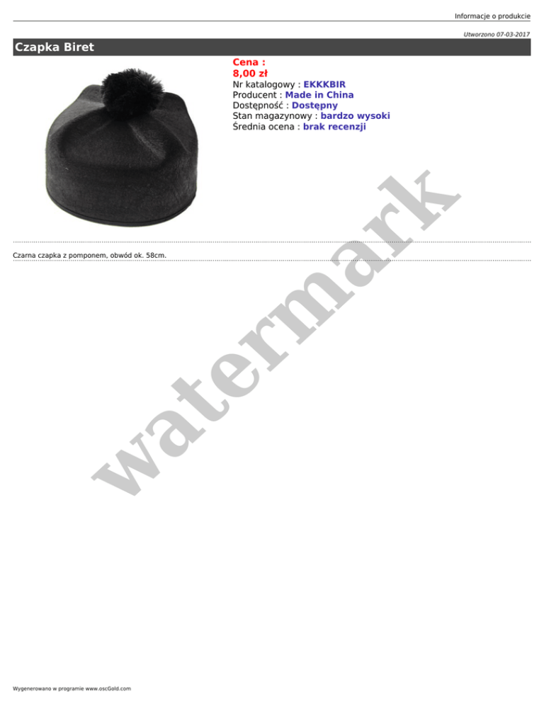 Informacje o produkcie Utworzono 07-03-2017 Czapka Biret Cena : 8,00 zł er m ar k Nr katalogowy : EKKKBIR Producent : Made in China Dostępność : Dostępny Stan magazynowy : bardzo wysoki Średnia ocena : brak recenzji w at Czarna czapka z pomponem, obwód ok. 58cm. Wygenerowano w programie www.oscGold.com