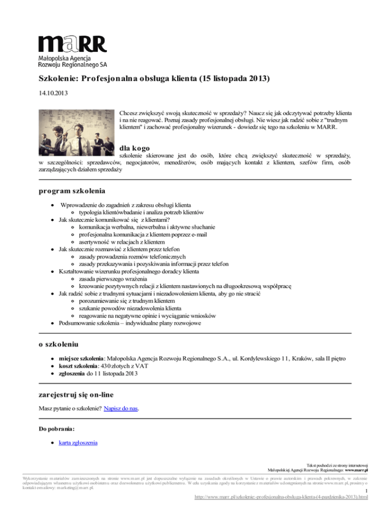 Szkolenie: Profesjonalna obsługa klienta (15 listopada 2013) 14.10.2013 Chcesz zwiększyć swoją skuteczność w sprzedaży? Naucz się jak odczytywać potrzeby klienta i na nie reagować. Poznaj zasady profesjonalnej obsługi. Nie wiesz jak radzić sobie z "trudnym klientem" i zachować profesjonalny wizerunek - dowiedz się tego na szkoleniu w MARR. dla kogo szkolenie skierowane jest do osób, które chcą zwiększyć skuteczność w sprzedaży, w szczególności: sprzedawców, negocjatorów, menedżerów, osób mających kontakt z klientem, szefów firm, osób zarządzających działem sprzedaży program szkolenia Wprowadzenie do zagadnień z zakresu obsługi klienta typologia klientówbadanie i analiza potrzeb klientów Jak skutecznie komunikować się z klientami? komunikacja werbalna, niewerbalna i aktywne słuchanie profesjonalna komunikacja z klientem poprzez e-mail asertywność w relacjach z klientem Jak skutecznie rozmawiać z klientem przez telefon zasady prowadzenia rozmów telefonicznych zasady przekazywania i pozyskiwania informacji przez telefon Kształtowanie wizerunku profesjonalnego doradcy klienta zasada pierwszego wrażenia kreowanie pozytywnych relacji z klientem nastawionych na długookresową współpracę Jak radzić sobie z trudnymi sytuacjami i niezadowoleniem klienta, aby go nie stracić porozumiewanie się z trudnym klientem szukanie powodów niezadowolenia klienta reagowanie na negatywne opinie i wyciąganie wniosków Podsumowanie szkolenia – indywidualne plany rozwojowe o szkoleniu miejsce szkolenia: Małopolska Agencja Rozwoju Regionalnego S.A., ul. Kordylewskiego 11, Kraków, sala II piętro koszt szkolenia: 430 złotych z VAT zgłoszenia do 11 listopada 2013 zarejestruj się on-line Masz pytanie o szkolenie? Napisz do nas. Do pobrania: karta zgłoszenia Tekst pochodzi ze strony internetowej Małopolskiej Agencji Rozwoju Regionalnego: www.marr.pl Wykorzystanie m ateriałów zam ieszczonych na stronie www.m arr.pl jest dopuszczalne wyłącznie na zasadach określonych w Ustawie o prawie autorskim i prawach pokrewnych, w zakresie odpowiadającym własnem u użytkowi osobistem u oraz dozwolonem u użytkowi publicznem u. W celu uzyskania zgody na korzystanie z m ateriałów udostępnionych na stronie www.m arr.pl, prosim y o kontakt e-m ailowy: m arketing@m arr.pl. 1 http://www.marr.pl/szkolenie:-profesjonalna-obsluga-klienta-(4-pazdzienika-2013).html