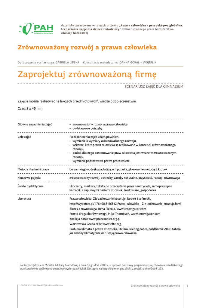Materiały opracowane w ramach projektu „Prawa człowieka – perspektywa globalna. Scenariusze zajęć dla dzieci i młodzieży” dofinansowanego przez Ministerstwo Edukacji Narodowej Zrównoważony rozwój a prawa człowieka Opracowanie scenariusza: Gabriela Lipska Konsultacje metodyczne: Joanna Góral – Wojtalik Zaprojektuj zrównoważoną firmę Scenariusz zajęć dla gimnazjum Zajęcia można realizować na lekcjach przedmiotowych1: wiedza o społeczeństwie. Czas: 2 x 45 min Główne zagadnienia zajęć – zrównoważony rozwój a prawa człowieka – podstawowe potrzeby Cele zajęćPo zakończeniu zajęć uczeń powinien: – wymienić 3 wymiary zrównoważonego rozwoju, – wskazać, które prawa człowieka są realizowane w koncepcji zrównoważonego rozwoju, – podać, dlaczego poszanowanie praw człowieka jest ważne w zrównoważonym rozwoju, – wymienić podstawowe prawa pracownicze. Metody i techniki pracy burza mózgów, dyskusja, latające flipczarty, głosowanie metodą 3 kropek Kluczowe pojęcia zrównoważony rozwój, potrzeby, zasoby naturalne, przyszłość, rozwój, równowaga Środki dydaktyczneFlipczarty, markery, teksty do przeczytania przez nauczyciela, samoprzylepne karteczki z zapisanymi hasłami człowiek, środowisko, gospodarka LiteraturaPrawa człowieka. Złe zachowanie kosztuje, Robert Stefanicki, http://wyborcza.pl/1,76498,6116542,Prawa_czlowieka__Zle_zachowanie_kosztuje.html Biznes a równowaga, Irena Piccola, www.crnavigator.com Prosta droga do równowagi, Mike Thompson, www.crnavigator.com Koalicja Karat www.pracakobiet.org.pl Warszawska Grupa eFTe www.efte.org Problem klimatu a prawa człowieka, Oxfam Briefing paper, październik 2008 tabela jak zmiany klimatyczne naruszają prawa człowieka. Za Rozporządzeniem Ministra Edukacji Narodowej z dnia 23 grudnia 2008 r. w sprawie podstawy programowej wychowania przedszkolnego oraz kształcenia ogólnego w poszczególnych typach szkół. Dostępne na http://bip.men.gov.pl/akty_projekty.php#20081223. 1 Copyright Polska Akcja Humanitarna Zrównoważony rozwój a prawa człowieka Przebieg zajęć Zajęcia nr 1 Czas Co trzeba zrobić? Materiały 5 min Poproś uczniów, żeby stanęli w kręgu twarzą do środka. Nalep im na plecy karteczki. Na każdym rodzaju karteczek powinno się znaleźć inne hasło. Zapowiedz uczniom, że mają odnaleźć osoby z taką samą karteczką. Uczniowie nie mogą się ze sobą porozumiewać, ani rysować lub pisać podpowiedzi. Gdy znajdą swoją grupę, niech zajmą odpowiednią część sali. Karteczki samoprzylepne w 3 kolorach: np. żółta z hasłem człowiek, zielona z hasłem przyroda, czerwona z hasłem gospodarka 5 min Zapytaj uczniów. Jak im się podobała zabawa? Czy było łatwo znaleźć osoby ze swojej grupy? Dlaczego? Skąd wiedzieli do jakiej grupy należą? 5 min Przeczytajcie wspólnie hasła z karteczek. Przedstaw na tablicy Materiał pomocniczy nr 3 schemat (możesz go skopiować z materiałów dla nauczyciela). Wyjaśnij uczniom, że rozwój zrównoważony oznacza, że między tymi elementami powinna być zachowana równowaga. To znaczy, że chcąc polepszyć swoje życie, nie powinniśmy tego robić kosztem środowiska naturalnego ani innych ludzi, koszty niektórych wyborów są często ukryte. Zachęć uczniów by przykleili swoje karteczki w odpowiednim miejscu schematu. 5 min Zapytaj uczniów, czy chcieliby stworzyć firmę, w której można coś produkować jednocześnie dbając o właściwe wykorzystanie surowców naturalnych, ochronę środowiska przed zanieczyszczeniem i toksynami oraz gdzie pracownicy mają zagwarantowane godne warunki pracy. 10 min Zapowiedz uczniom, że do końca lekcji oraz na następnych zajęciach będziecie pracowali nad stworzeniem etycznej firmy działającej zgodnie z zasadami zrównoważonego rozwoju i szanującą prawa człowieka. Wybór rodzaju działalności zależy od uczniów. Powinni jednak wspólnie ustalić jako klasa w jakiej branży działa firma. Daj uczniom czas na wspólne wybranie branży np. przez głosowanie. Każdy uczeń podaje swój pomysł na karteczce, zapisujecie wyniki na tablicy. Następnie wybieracie 3 najczęściej się pojawiające propozycje. Zapisz je na tablicy 7 min Uczniowie w parach zastanawiają się nad 1 z trzech propozycji na tablicy, następnie nad uzasadnieniem swojego wyboru w jednym zdaniu. Ponownie głosujecie, która z 3 propozycji powinna wygrać. Poproś chętnych uczniów o uzasadnienie. Gdy wybrany zostanie rodzaj działalności firmy, pogratuluj uczniom podjęcia decyzji i dojścia do porozumienia. 8 min Uczniowie dobierają się w grupy, na które byli podzieleni na Flipczart lub kartka A4 początku zajęć. Do końca zajęć zastanawiają się nad wyborem nazwy firmy, wielkością, oraz umiejscowieniem. Grupy prezentują swoje pomysły na flipczartach. Zrównoważony rozwój a prawa człowieka Uwagi To ćwiczenie ma tylko służyć krótkiej refleksji nad komunikacja w grupie nie poświęcaj na nie zbyt wiele czasu Ważne jest by wytłumaczyć uczniom, że cała klasa będzie pracowała nad kodeksem jednej wspólnej firmy, nie chodzi więc w głosowaniu o jak najwięcej pomysłów, ale wybranie jednej branży. Zachowaj materiały na następną lekcję Copyright Polska Akcja Humanitarna Zajęcia nr 2 Czas Co trzeba zrobić? Materiały 5 min Przypomnijcie sobie poprzednie zajęcia oraz jakie decyzje zostały podjęte. Możesz poprosić chętną osobę o krótką prezentację – przypomnienie jak nazywa się firma, czym się zajmuje, ilu ma pracowników i gdzie się mieści. Flipczart z opisem firmy z poprzedniej lekcji, schemat zrównoważonego rozwoju – Materiał pomocniczy nr 3 5 min Rozdaj uczniom zapisane na paskach papieru wybrane prawa człowieka. Poproś by zastanowili się, do którego z 3 elementów (człowiek, gospodarka, środowisko) pasują dane prawa. Materiał pomocniczy nr 4 (pocięty w paski) 15 min Gdy grupy już się uformowały, zapowiedz uczni