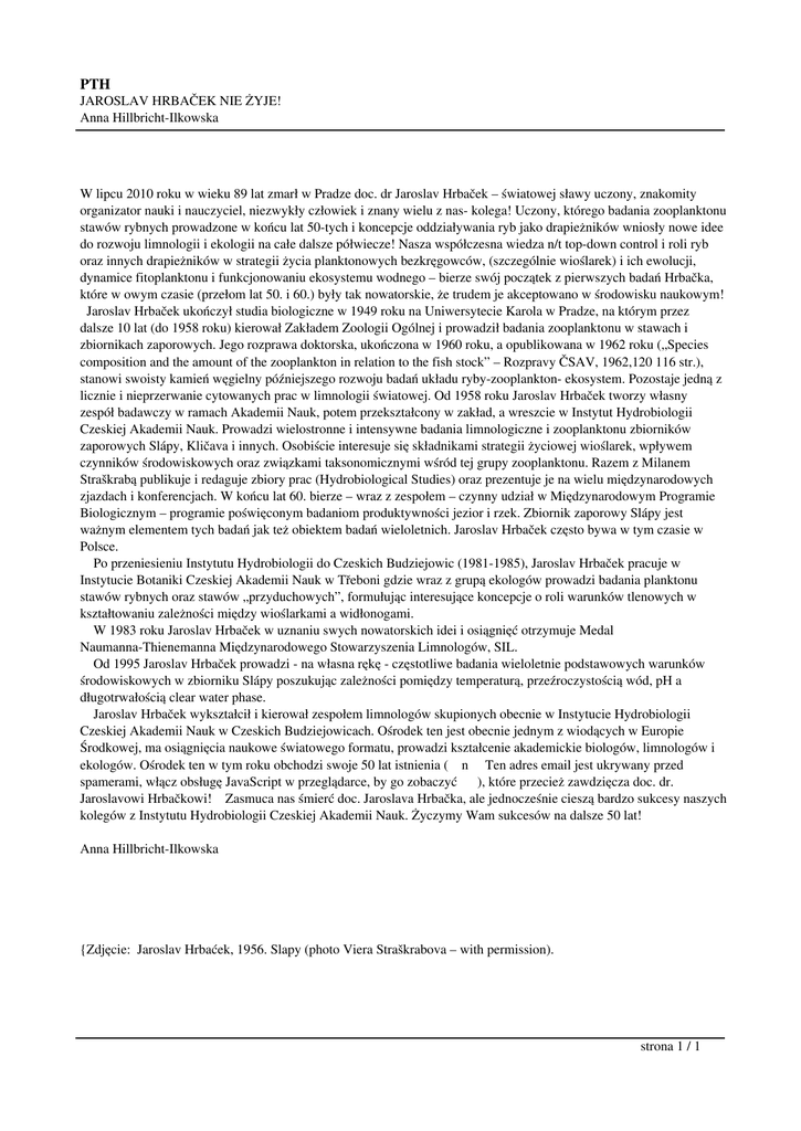 W lipcu 2010 roku w wieku 89 lat zmarł w Pradze doc. dr Jaroslav Hrbaček – światowej sławy uczony, znakomity