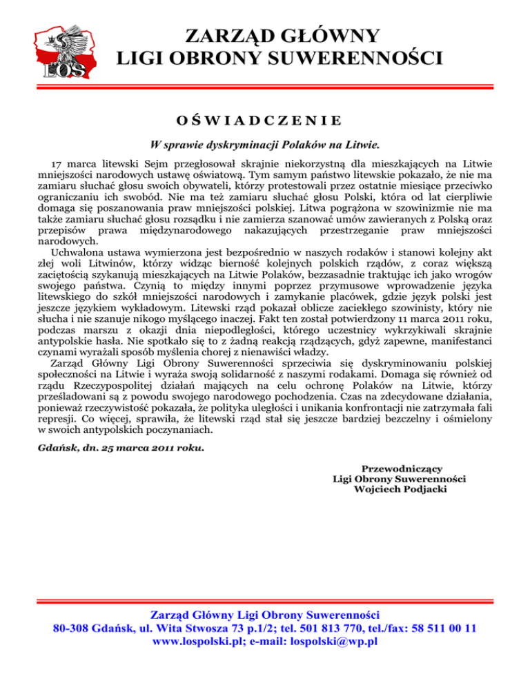 ZARZĄD GŁÓWNY LIGI OBRONY SUWERENNOŚCI OŚWIADCZENIE W sprawie dyskryminacji Polaków na Litwie. 17 marca litewski Sejm przegłosował skrajnie niekorzystną dla mieszkających na Litwie mniejszości narodowych ustawę oświatową. Tym samym państwo litewskie pokazało, że nie ma zamiaru słuchać głosu swoich obywateli, którzy protestowali przez ostatnie miesiące przeciwko ograniczaniu ich swobód. Nie ma też zamiaru słuchać głosu Polski, która od lat cierpliwie domaga się poszanowania praw mniejszości polskiej. Litwa pogrążona w szowinizmie nie ma także zamiaru słuchać głosu rozsądku i nie zamierza szanować umów zawieranych z Polską oraz przepisów prawa międzynarodowego nakazujących przestrzeganie praw mniejszości narodowych. Uchwalona ustawa wymierzona jest bezpośrednio w naszych rodaków i stanowi kolejny akt złej woli Litwinów, którzy widząc bierność kolejnych polskich rządów, z coraz większą zaciętością szykanują mieszkających na Litwie Polaków, bezzasadnie traktując ich jako wrogów swojego państwa. Czynią to między innymi poprzez przymusowe wprowadzenie języka litewskiego do szkół mniejszości narodowych i zamykanie placówek, gdzie język polski jest jeszcze językiem wykładowym. Litewski rząd pokazał oblicze zaciekłego szowinisty, który nie słucha i nie szanuje nikogo myślącego inaczej. Fakt ten został potwierdzony 11 marca 2011 roku, podczas marszu z okazji dnia niepodległości, którego uczestnicy wykrzykiwali skrajnie antypolskie hasła. Nie spotkało się to z żadną reakcją rządzących, gdyż zapewne, manifestanci czynami wyrażali sposób myślenia chorej z nienawiści władzy. Zarząd Główny Ligi Obrony Suwerenności sprzeciwia się dyskryminowaniu polskiej społeczności na Litwie i wyraża swoją solidarność z naszymi rodakami. Domaga się również od rządu Rzeczypospolitej działań mających na celu ochronę Polaków na Litwie, którzy prześladowani są z powodu swojego narodowego pochodzenia. Czas na zdecydowane działania, ponieważ rzeczywistość pokazała, że polityka uległości i unikania konfrontacji nie zatrzymała fali represji. Co więcej, sprawiła, że litewski rząd stał się jeszcze bardziej bezczelny i ośmielony w swoich antypolskich poczynaniach. Gdańsk, dn. 25 marca 2011 roku. Przewodniczący Ligi Obrony Suwerenności Wojciech Podjacki Zarząd Główny Ligi Obrony Suwerenności 80-308 Gdańsk, ul. Wita Stwosza 73 p.1/2; tel. 501 813 770, tel./fax: 58 511 00 11 www.lospolski.pl; e-mail: [email protected]