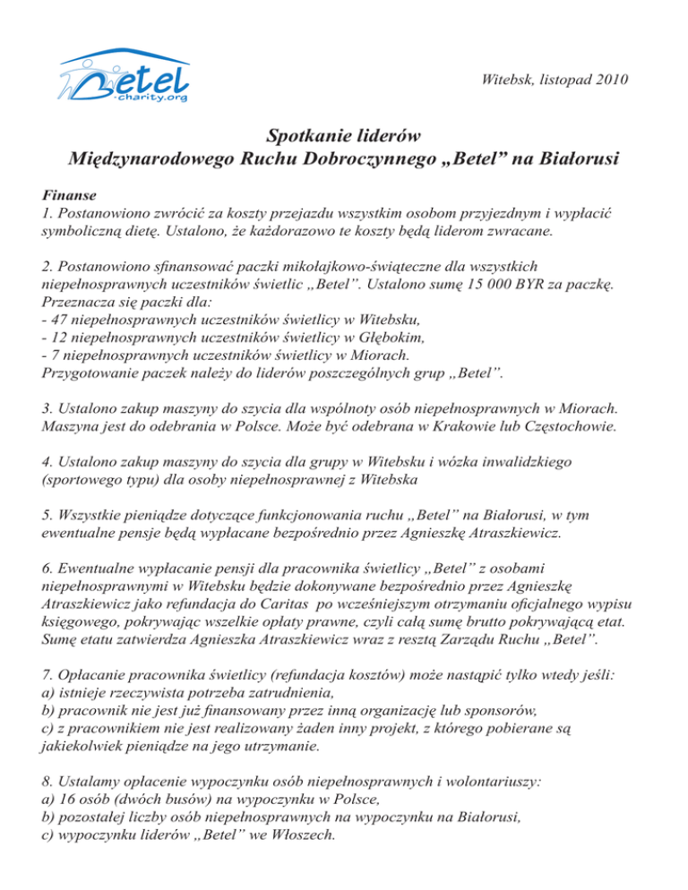 Witebsk, listopad 2010 Spotkanie liderów Międzynarodowego Ruchu Dobroczynnego „Betel” na Białorusi Finanse 1. Postanowiono zwrócić za koszty przejazdu wszystkim osobom przyjezdnym i wypłacić symboliczną dietę. Ustalono, że każdorazowo te koszty będą liderom zwracane. 2. Postanowiono sfinansować paczki mikołajkowo-świąteczne dla wszystkich niepełnosprawnych uczestników świetlic „Betel”. Ustalono sumę 15 000 BYR za paczkę. Przeznacza się paczki dla: - 47 niepełnosprawnych uczestników świetlicy w Witebsku, - 12 niepełnosprawnych uczestników świetlicy w Głębokim, - 7 niepełnosprawnych uczestników świetlicy w Miorach. Przygotowanie paczek należy do liderów poszczególnych grup „Betel”. 3. Ustalono zakup maszyny do szycia dla wspólnoty osób niepełnosprawnych w Miorach. Maszyna jest do odebrania w Polsce. Może być odebrana w Krakowie lub Częstochowie. 4. Ustalono zakup maszyny do szycia dla grupy w Witebsku i wózka inwalidzkiego (sportowego typu) dla osoby niepełnosprawnej z Witebska 5. Wszystkie pieniądze dotyczące funkcjonowania ruchu „Betel” na Białorusi, w tym ewentualne pensje będą wypłacane bezpośrednio przez Agnieszkę Atraszkiewicz. 6. Ewentualne wypłacanie pensji dla pracownika świetlicy „Betel” z osobami niepełnosprawnymi w Witebsku będzie dokonywane bezpośrednio przez Agnieszkę Atraszkiewicz jako refundacja do Caritas po wcześniejszym otrzymaniu oficjalnego wypisu księgowego, pokrywając wszelkie opłaty prawne, czyli całą sumę brutto pokrywającą etat. Sumę etatu zatwierdza Agnieszka Atraszkiewicz wraz z resztą Zarządu Ruchu „Betel”. 7. Opłacanie pracownika świetlicy (refundacja kosztów) może nastąpić tylko wtedy jeśli: a) istnieje rzeczywista potrzeba zatrudnienia, b) pracownik nie jest już finansowany przez inną organizację lub sponsorów, c) z pracownikiem nie jest realizowany żaden inny projekt, z którego pobierane są jakiekolwiek pieniądze na jego utrzymanie. 8. Ustalamy opłacenie wypoczynku osób niepełnosprawnych i wolontariuszy: a) 16 osób (dwóch busów) na wypoczynku w Polsce, b) pozostałej liczby osób niepełnosprawnych na wypoczynku na Białorusi, c) wypoczynku liderów „Betel” we Włoszech. 9. Na remont ewentualnie przejętego domu przeznaczamy w roku 2011 sumę 10 000 $. W latach kolejnych następne finanse wedle potrzeby i ustaleń. 10. Pieniądze z kasy „Betel” wypłacane są tylko na konkretne dzieła „Betel” i tylko na ludzi związanych z „Betel”. 11. Wszystkie wydatkowane pieniądze muszą być rozliczone. Pierwsze rozliczenie wędruje do szefowej „Betel „ na Białorusi, zaś od niej do zatwierdzenia do zarządu centralnego „Betel”. Wydatki muszą być potwierdzone co najmniej rachunkami, paragonami. W razie niemożności ich uzyskania, konieczne jest oświadczenie o ich wydatkowaniu na określony cel z uwzględnieniem z jakiego powodu nie można było odebrać potwierdzenia. Dom 1. Przewidywane jest przejęcie domu w Głębokim. Jeśli ks. Proboszcz z Głębokiego przejmie taki dom, to wtedy uruchamiamy w nim Dom z Osobami Niepełnosprawnymi. 2. Organizacją domu zajmie się Inna Wojciechowicz. 3. Zarząd międzynarodowego ruchu dobroczynnego „Betel” rezerwuje finanse na ten cel. Wypoczynek 1. W bieżącym roku organizowany jest wypoczynek: a) dla liderów ruchu dobroczynnego „Betel” na Białorusi. Wypoczynek w domach wakacyjnych „Betel” we Włoszech. Ilość maksymalna uczestników 8 osób. b) dla wszystkich osób niepełnosprawnych, członków świetlic „Betel”: - wypoczynek w Polsce, w Krynicy Zdrój z wizytą w Krakowie. Ilość osób 16. - wypoczynek na Białorusi. Pozostałe osoby niepełnosprawne, które nie będą brały udziału w wypoczynku w Polsce. 2. Zgłoszenia przyjmuje szefowa „Betel” na Białorusi do stycznia 2011 roku. 3. Koszty pokrywa centralnie ruch „Betel”. Struktury 1. Zarząd centralny Ruchu „Betel” 2. Zarząd międzynarodowy ruchu „Betel” 3. Przewodniczący Ruchu „Betel” na Białorusi – Agnieszka Atraszkiewicz 4. Dyrektor Regionu Głębokiego – Inna Wojciechowicz, 5. Dyrektor dzieł „Betel” w Kościele Greko-Katolickim – ks. Aleksander Shybeka 6. Grupa w Miorach – Anna Wojskowicz Strony www. 1. Postanawiamy utworzenie odrębnych stron www. Na Białorusi. 2. Wersje językowe: - język rosyjski, - język polski, - język włoski, - język angielski. 1. Tłumaczenie na język rosyjski przejmuje Agnieszka Atraszkiewicz. 2. Tłumaczenie na język włoski przejmuje Francesca Lioce. 3. Tłumaczenie na język polski przejmuje Marcin Mysłek. 4. Na stronach powinny się znaleźć: a) rys historyczny ruchu „Betel” na Białorusi, b) poszczególne świetlice „Betel”, c) poszczególne dzieła „Betel” na Białorusi, d) Sylwetki, e) Statuetka Ecce Homo dla osób z Białorusi, f) filmy zrealizowane na terenie wspólnot na Białorusi g) materiały do pobrania, czyli: - ankiety, - dokumenty, - sprawozdania ze spotkań Zarządu, - sprawozdania ze spotkań liderów „Betel” na Białorusi, - poszczególne wytyczne. Pozostałe uzupełniające: 1. Spotkanie Liderów „Betel” przewidywane jest na październik 2011 roku Postanowienia końcowe: 1. Sprawozdanie ze spotkania Liderów jest upublicznione i zostaje przekazane do: - strony www.betel-charity.org - Zarządu Ruchu „Betel” - Poszczególnych liderów Ruchu „Betel” na Białorusi, - Caritas Diecezji Witebskiej, - Parafii Greko-Katolickiej na Białorusi - inne według uznania. 2. Do sprawozdania jest dołączona historia ruchu „Betel” na Białorusi”. Opracowanie: Agnieszka Atraszkiewicz Andrzej Kalinowski