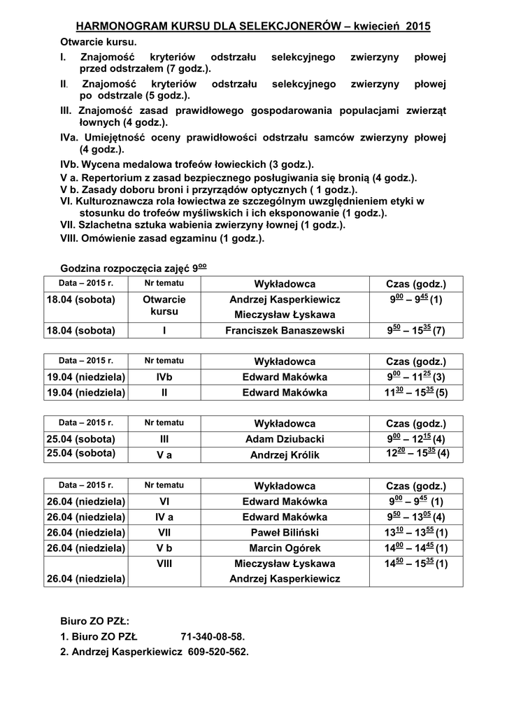 HARMONOGRAM KURSU DLA SELEKCJONERÓW – kwiecień 2015 Otwarcie kursu. I. Znajomość kryteriów odstrzału selekcyjnego zwierzyny płowej przed odstrzałem (7 godz.). II. Znajomość kryteriów odstrzału selekcyjnego zwierzyny płowej po odstrzale (5 godz.). III. Znajomość zasad prawidłowego gospodarowania populacjami zwierząt łownych (4 godz.). IVa. Umiejętność oceny prawidłowości odstrzału samców zwierzyny płowej (4 godz.). IVb. Wycena medalowa trofeów łowieckich (3 godz.). V a. Repertorium z zasad bezpiecznego posługiwania się bronią (4 godz.). V b. Zasady doboru broni i przyrządów optycznych ( 1 godz.). VI. Kulturoznawcza rola łowiectwa ze szczególnym uwzględnieniem etyki w stosunku do trofeów myśliwskich i ich eksponowanie (1 godz.). VII. Szlachetna sztuka wabienia zwierzyny łownej (1 godz.). VIII. Omówienie zasad egzaminu (1 godz.). Godzina rozpoczęcia zajęć 9oo Data – 2015 r. Nr tematu Wykładowca Czas (godz.) 18.04 (sobota) Otwarcie kursu Andrzej Kasperkiewicz Mieczysław Łyskawa 900 – 945 (1) 18.04 (sobota) I Franciszek Banaszewski 950 – 1535 (7) Data – 2015 r. Nr tematu Wykładowca Czas (godz.) 19.04 (niedziela) IVb Edward Makówka 900 – 1125 (3) 19.04 (niedziela) II Edward Makówka 1130 – 1535 (5) Data – 2015 r. Nr tematu Wykładowca Czas (godz.) III Adam Dziubacki Va Andrzej Królik 900 – 1215 (4) 1220 – 1535 (4) Data – 2015 r. Nr tematu Wykładowca Czas (godz.) 26.04 (niedziela) VI Edward Makówka 900 – 945 (1) 26.04 (niedziela) IV a Edward Makówka 950 – 1305 (4) 26.04 (niedziela) VII Paweł Biliński 1310 – 1355 (1) 26.04 (niedziela) Vb Marcin Ogórek 1400 – 1445 (1) VIII Mieczysław Łyskawa Andrzej Kasperkiewicz 1450 – 1535 (1) 25.04 (sobota) 25.04 (sobota) 26.04 (niedziela) Biuro ZO PZŁ: 1. Biuro ZO PZŁ 71-340-08-58. 2. Andrzej Kasperkiewicz 609-520-562.