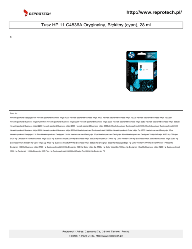 http://www.reprotech.pl/ Tusz HP 11 C4836A Oryginalny, Błękitny (cyan), 28 ml 0 Tusz do: Hewlett-packard Designjet 100 Hewlett-packard Business Inkjet 1000 Hewlett-packard Business Inkjet 1100 Hewlett-packard Business Inkjet 1200d Hewlett-packard Business Inkjet 1200dtn Hewlett-packard Business Inkjet 1200dtwn Hewlett-packard Business Inkjet 2200 Hewlett-packard Business Inkjet 2230 Hewlett-packard Business Inkjet 2250 Hewlett-packard Business Inkjet 2250tn Hewlett-packard Business Inkjet 2280 Hewlett-packard Business Inkjet 2300 Hewlett-packard Business Inkjet 2300dtn Hewlett-packard Business Inkjet 2300n Hewlett-packard Business Inkjet 2600 Hewlett-packard Business Inkjet 2800 Hewlett-packard Business Inkjet 2800dt Hewlett-packard Business Inkjet 2800dtn Hewlett-packard Color Inkjet Cp 1700 Hewlett-packard Designjet 10ps Hewlett-packard Designjet 110 Plus Hewlett-packard Designjet 120 Nr Hewlett-packard Designjet 20ps Hewlett-packard Designjet 50ps Hewlett-packard Designjet 70 Hp Officejet 9130 Hp Officejet 9120 Hp Officejet 9110 Hp Business Inkjet 2200 Hp Business Inkjet 2250 Hp Business Inkjet 2250tn Hp Inkjet Cp 1700/d Hp Color Printer 1700 Hp Business Inkjet 2230 Hp Business Inkjet 2280 Hp Business Inkjet 2600dn Hp Color Inkjet Cp 1700 Hp Business Inkjet 2600 Hp Business Inkjet 2280tn Hp Designjet 20ps Hp Designjet 50ps Hp Color Printer 1700d Hp Color Printer 1700ps Hp Designjet 100 Hp Business Inkjet 1100 Hp Business Inkjet 2300 Hp Designjet 120 Hp Color Inkjet Cp 1700d Hp Color Inkjet Cp 1700ps Hp Designjet 10ps Hp Business Inkjet 1200 Hp Business Inkjet 1000 Hp Designjet 110 Hp Designjet 110 Plus Hp Business Inkjet 2800 Hp Officejet Pro K 850 Hp Designjet 70 Reprotech - Adres: Czerwona 7a, 33-101 Tarnów, Polska Telefon: 14/630-04-87, http://www.reprotech.pl/