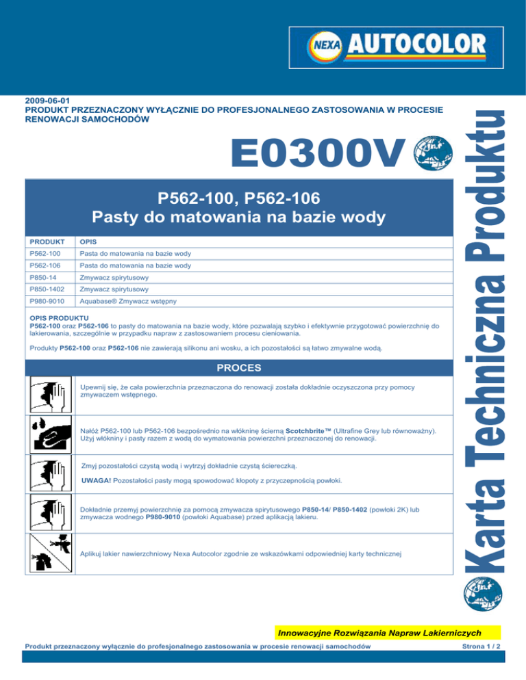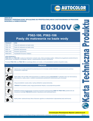 2009-06-01 PRODUKT PRZEZNACZONY WYŁĄCZNIE DO PROFESJONALNEGO ZASTOSOWANIA W PROCESIE RENOWACJI SAMOCHODÓW E0300V P562-100, P562-106 Pasty do matowania na bazie wody PRODUKT OPIS P562-100 Pasta do matowania na bazie wody P562-106 Pasta do matowania na bazie wody P850-14 Zmywacz spirytusowy P850-1402 Zmywacz spirytusowy P980-9010 Aquabase® Zmywacz wstępny OPIS PRODUKTU P562-100 oraz P562-106 to pasty do matowania na bazie wody, które pozwalają szybko i efektywnie przygotować powierzchnię do lakierowania, szczególnie w przypadku napraw z zastosowaniem procesu cieniowania. Produkty P562-100 oraz P562-106 nie zawierają silikonu ani wosku, a ich pozostałości są łatwo zmywalne wodą. PROCES Upewnij się, że cała powierzchnia przeznaczona do renowacji została dokładnie oczyszczona przy pomocy zmywaczem wstępnego. Nałóż P562-100 lub P562-106 bezpośrednio na włókninę ścierną Scotchbrite™ (Ultrafine Grey lub równoważny). Użyj włókniny i pasty razem z wodą do wymatowania powierzchni przeznaczonej do renowacji. Zmyj pozostałości czystą wodą i wytrzyj dokładnie czystą ściereczką. UWAGA! Pozostałości pasty mogą spowodować kłopoty z przyczepnością powłoki. Dokładnie przemyj powierzchnię za pomocą zmywacza spirytusowego P850-14/ P850-1402 (powłoki 2K) lub zmywacza wodnego P980-9010 (powłoki Aquabase) przed aplikacją lakieru. Aplikuj lakier nawierzchniowy Nexa Autocolor zgodnie ze wskazówkami odpowiedniej karty technicznej Innowacyjne Rozwiązania Napraw Lakierniczych Produkt przeznaczony wyłącznie do profesjonalnego zastosowania w procesie renowacji samochodów Strona 1 / 2 Nexa Autocolor P562-100, P562-106 Pasty do matowania na bazie wody E0300V LOTNE ZWIĄZKI ORGANICZNE Niniejsze produkty nie zostały objęte Dyrektywą EU 2004/42 i w związku z tym nie zostały sklasyfikowane, jako produkty zawierający Lotne Związki Organiczne. Produkt przeznaczony tylko do profesjonalnego użytku w procesie renowacji samochodów osobowych. ZDROWIE I BEZPIECZEŃSTWO BEZWZGLĘDNIE ZAPOZNAJ SIĘ Z KARTĄ CHARAKTERYSTYKI CHEMICZNEJ PRODUKTU. PRODUKTY SĄ PRZEZNACZONE WYŁĄCZNIE DO PROFESJONALNEGO UŻYTKU. Dane w karcie technicznej zamieszczono wyłącznie w celach informacyjnych. Każdy, kto stosuje produkt bez zasięgnięcia dalszych informacji i profesjonalnego przeszkolenia, czyni to na własną odpowiedzialność. Dlatego też PPG Industries Poland Sp. z o. o. nie bierze odpowiedzialności za skutki zastosowania produktu lub wynikające z tego zastosowania straty czy szkody materialne i niematerialne. Informacje zawarte w tym dokumencie mogą ulec zmianie, zgodnie z naszą polityką stałego doskonalenia produktów oraz najnowszą wiedzą techniczną. Parametry produktów są zależne od czynników zewnętrznych, takich jak: grubość nakładanych warstw, temperatura otoczenia, poziom wilgotności czy szybkość wymiany powietrza w kabinie lakierniczej. Obowiązkiem użytkownika jest podjęcie wszelkich niezbędnych działań, aby zapewnić zastosowanie produktu zgodnie z przeznaczeniem. Więcej informacji znajduje się w Kartach Charakterystyki Chemicznej Produktów, dostępnych pod adresem: www.nexaautocolor.com PPG Industries Poland Sp. z o. o. (Oddział w Warszawie) Ul. Bodycha 47 05-816 Warszawa-Michałowice Poland Phone: +48 22 753 03 10 Fax: +48 22 753 03 13 Innowacyjne Rozwiązania Napraw Lakierniczych Produkt przeznaczony wyłącznie do profesjonalnego zastosowania w procesie renowacji samochodów Strona 2 / 2