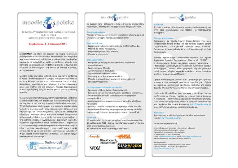Do dyskusji na te i pokrewne tematy zapraszamy pracowników naukowych, dydaktyków i nauczycieli szkól wszystkich stopni. III MIÊDZYNARODOWA KONFERENCJA NAUKOWA MOODLEMOOT POLSKA 2011 Czêstochowa, 3 - 4 listopada 2011 r. MoodleMoot na staùe juý zagoúciù na mapie konferencji poúwiæconych nauczaniu on-line. MoodleMoot jest miejscem wymiany doúwiadczeñ miùoúników, uýytkowników i praktyków nauczania na odlegùoúã w ogóle, a platformy Moodle jako narzædzia w szczególnoúci. Podobne spotkania odbywajà sie cyklicznie w wielu krajach - od dwóch lat równieý w Polsce, w Czæstochowie Moodle, choã z pewnoúcià jest najbardziej popularnà platformà w Polsce i prawdopodobnie w Europie, jest tylko narzædziem, za pomocà którego tworzone sà i dostarczane kursy on-line. Narzædziem wszechstronnym, lubianym i wykorzystywanym przez nas chætnie, ale nie jedynym. Podczas tegorocznego Moot'a spróbujemy spojrzeã trochæ poza i ponad platformæ Moodle. Dlatego w³aúnie tematem przewodnim tegorocznego spotkania MoodleMoot Polska jest debata nad rozwijaniem kompetencji nauczyciela i ucznia pracujàcych w úrodowisku elektronicznym. Wybór tej tematyki podyktowany jest ogromnà popularnoúcià technik e-learningowych przy jednoczesnej tendencji do intuicyjnego ich wykorzystywania. Tymczasem efektywny e-learning wymaga caùego wachlarza nowych kompetencji technicznych, dydaktycznych, spoùecznych czy organizacyjnych. Umiejætnoúã doboru i wykorzystania dostæpnych narzædzi, tworzenia odpowiednich zadañ dydaktycznych, organizacji czasu czy teý funkcjonowania w spoùecznoúci wirtualnej to tylko kilka czynników warunkujàcych skutecznoúã pracy i nauki on-line. Na ile sà to kompetencje przyswajane samoistnie? W jaki sposób moýna wspomóc ich rozwój? Jaki jest ich wpùyw na efektywnoúã e-learningu? Tematyka spotkania Podczas wykladów, prezentacji i warsztatów chcemy zwróciæ szczególn¹ uwagê na nastêpuj¹ce zagadnienia: Sesja techniczna: - Zagadnienia zwi¹zane z administracj¹ platform¹ Moodle, - Moodle od strony nauczyciela, - Przyk³ady wykorzystania Moodle, - Moodle w projektach. Sesja dydaktyczna: - Kompetencje nauczycieli i studentów w œrodowisku e-learningowym, - Spojrzenie poza Moodle, Open Educational Resources, - Ograniczenia kszta³cenia online, - E-learning w projektach europejskich, - Moodle w szko³ach podstawowych, gimnazjalnych i ponadgizmnazjalnych. Propozycje warsztatów dla nauczycieli: - tworzenie sylabusa kursu e-learningowego, - tworzenie kursu e-learningowego na podstawie scenariusza, - wykorzystanie narzêdzi Moodle w pracach zespo³ów nauczycielskich, - projekt edukacyjny z wykorzystaniem narzêdzia WebQuest na Moodle, - edukacja czytelnicza i medialna z wykorzystaniem Moodle, - kursy blended learningowe przygotowuj¹ce do egzaminów zewnêtrznych (egzamin gimnazjalny, egzamin maturalny). Terminarz 15 wrzeœnia 2011 – termin nadsy³ania streszczenia artyku³ów, 15 paŸdziernika 2011 – termin nadsy³ania gotowych artyku³ów oraz prezentacji w postaci ppt, 31 paŸdziernika 2011 – zamkniêcie rejestracji. Publikacja Artykuùy zgùoszone na konferencjæ zostanà poddane recenzji, po czym bædà wydrukowane jako rozdziaù w recenzowanej monografii. Warunki uczestnictwa Zapraszamy do Czæstochowy! Gospodarzem Trzeciego MoodleMoot Polska bædzie po raz kolejny Wyýsza Szkoùa Lingwistyczna, która jednak zmieniùa swojà siedzibæ. Zapraszamy do nowego budynku przy ul. Nadrzecznej 7, 42-200 Czæstochowa. Podczas tegorocznego MoodleMoot wspieraæ nas bêdzie Regionalny Oœrodek Doskonalenia Nauczycieli „WOM” w Czêstochowie. Dziêki specjalnej ofercie warsztatów i konsultacji skierowanych do nauczycieli wszystkich etapów edukacyjnych Oœrodek chce przyczyniæ siê do promocji kszta³cenia na odleg³oœæ w polskich szko³ach z wykorzystaniem platformy e-learningowej Moodle." Opùata konferencyjna wynosi 90zù i obejmuje poczæstunek podczas przerw kawowych oraz koszty organizacyjne. Opùata nie obejmuje wieczornego spotkania, noclegów ani kosztu dojazdu. Wiæcej informacji na stronie: http://moodlemoot.pl. Tradycyjnie MoodleMoot jako pierwsza i, jak dotàd, jedyna konferencja w Polsce, bædzie w caùoúci transmitowana w Internecie - i tradycyjnie zawdziæczamy to firmie Elluminate, za co serdecznie dziækujemy. Udziaù w obradach przez Internet jest bezpùatny. Na stronie konferencji http://moodlemoot.pl moýecie Pañstwo obejrzeã poprzednie spotkania. Rejestracja Rejestracja na konferencjæ odbywa sie elektronicznie na stronie http://moodlemoot.pl. Serdecznie zapraszamy!!! Centrum Zastosowañ Technologii Informacyjnych w Edukacji Zakùad Nowoczesnych Technologii w Edukacji Wyýsza Szkoùa Lingwistyczna w Czæstochowie, ul. Nadrzeczna 7, 42-200 Czæstochowa e-mail: [email protected] WWW: http://www.moodlemoot.pl sekretarz konferencji: mgr Mariusz Damian Wlekliñski Wspóùorganizator: Regionalny Oœrodek Doskonalenia Nauczycieli "WOM" Aleja Jana Paw³a II 126/130, 42-202 Czêstochowa http://www.womczest.edu.pl