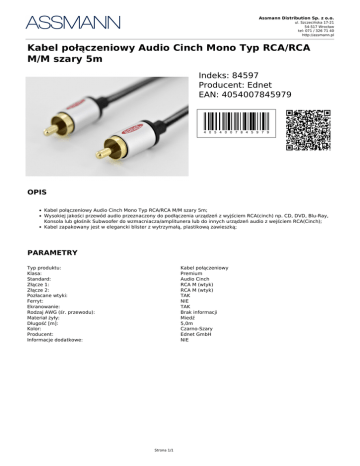Karta produktu: Kabel połączeniowy Audio Cinch Mono