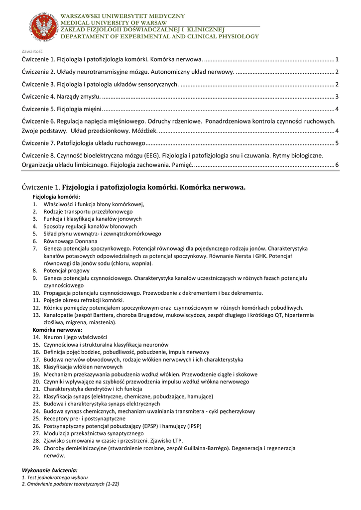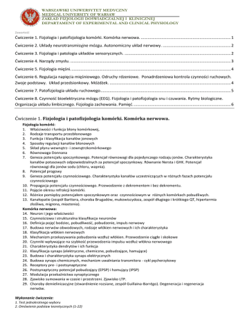 WARSZAWSKI UNIWERSYTET MEDYCZNY MEDICAL UNIVERSITY OF WARSAW ZAKŁAD FIZJOLOGII DOŚWIADCZALNEJ I KLINICZNEJ DEPARTAMENT OF EXPERIMENTAL AND CLINICAL PHYSIOLOGY Zawartość Ćwiczenie 1. Fizjologia i patofizjologia komórki. Komórka nerwowa. .............................................................................. 1 Ćwiczenie 2. Układy neurotransmisyjne mózgu. Autonomiczny układ nerwowy. ........................................................... 2 Ćwiczenie 3. Fizjologia i patologia układów sensorycznych. ............................................................................................ 2 Ćwiczenie 4. Narządy zmysłu. ........................................................................................................................................... 3 Ćwiczenie 5. Fizjologia mięśni. .......................................................................................................................................... 4 Ćwiczenie 6. Regulacja napięcia mięśniowego. Odruchy rdzeniowe. Ponadrdzeniowa kontrola czynności ruchowych. Zwoje podstawy. Układ przedsionkowy. Móżdżek. ......................................................................................................... 4 Ćwiczenie 7. Patofizjologia układu ruchowego ................................................................................................................. 5 Ćwiczenie 8. Czynność bioelektryczna mózgu (EEG). Fizjologia i patofizjologia snu i czuwania. Rytmy biologiczne. Organizacja układu limbicznego. Fizjologia zachowania. Pamięć. .................................................................................... 6 Ćwiczenie 1. Fizjologia i patofizjologia komórki. Komórka nerwowa. Fizjologia komórki: 1. Właściwości i funkcja błony komórkowej, 2. Rodzaje transportu przezbłonowego 3. Funkcja i klasyfikacja kanałów jonowych 4. Sposoby regulacji kanałów błonowych 5. Skład płynu wewnątrz- i zewnątrzkomórkowego 6. Równowaga Donnana 7. Geneza potencjału spoczynkowego. Potencjał równowagi dla pojedynczego rodzaju jonów. Charakterystyka kanałów potasowych odpowiedzialnych za potencjał spoczynkowy. Równanie Nersta i GHK. Potencjał równowagi dla jonów sodu (chloru, wapnia). 8. Potencjał progowy 9. Geneza potencjału czynnościowego. Charakterystyka kanałów uczestniczących w różnych fazach potencjału czynnościowego 10. Propagacja potencjału czynnościowego. Przewodzenie z dekrementem i bez dekrementu. 11. Pojęcie okresu refrakcji komórki. 12. Różnice pomiędzy potencjałem spoczynkowym oraz czynnościowym w różnych komórkach pobudliwych. 13. Kanałopatie (zespół Barttera, choroba Brugadów, mukowiscydoza, zespół długiego i krótkiego QT, hipertermia złośliwa, migrena, miastenia). Komórka nerwowa: 14. Neuron i jego właściwości 15. Czynnościowa i strukturalna klasyfikacja neuronów 16. Definicja pojęć bodziec, pobudliwość, pobudzenie, impuls nerwowy 17. Budowa nerwów obwodowych, rodzaje włókien nerwowych i ich charakterystyka 18. Klasyfikacja włókien nerwowych 19. Mechanizm przekazywania pobudzenia wzdłuż włókien. Przewodzenie ciągłe i skokowe 20. Czynniki wpływające na szybkość przewodzenia impulsu wzdłuż włókna nerwowego 21. Charakterystyka dendrytów i ich funkcja 22. Klasyfikacja synaps (elektryczne, chemiczne, pobudzające, hamujące) 23. Budowa i charakterystyka synaps elektrycznych 24. Budowa synaps chemicznych, mechanizm uwalniania transmitera - cykl pęcherzykowy 25. Receptory pre- i postsynaptyczne 26. Postsynaptyczny potencjał pobudzający (EPSP) i hamujący (IPSP) 27. Modulacja przekaźnictwa synaptycznego 28. Zjawisko sumowania w czasie i przestrzeni. Zjawisko LTP. 29. Choroby demielinizacyjne (stwardnienie rozsiane, zespół Guillaina-Barrégo). Degeneracja i regeneracja nerwów. Wykonanie ćwiczenia: 1. Test jednokrotnego wyboru 2. Omówienie podstaw teoretycznych (1-22) ZAKŁAD FIZJOLOGII DOŚWIADCZALNEJ I KLINICZNEJ, I WYDZIAŁ LEKARSKI Ćwiczenie 2. Układy neurotransmisyjne mózgu. Autonomiczny układ nerwowy. Neurotransmitery 1. Acetylocholina 2. Aminy katecholowe 3. Serotonina 4. Aminokwasy pobudzające 5. Tlenek azotu (NO) 6. Kwas gamma-aminomasłowy (GABA) Dla neurotransmiterów tych zostaną omówione następujące zagadnienia: Synteza i unieczynnianie Receptory pre- i postsynaptyczne Lokalizacja i projekcje neuronów wytwarzających dany neurotransmiter w ośrodkowym układzie nerwowym Udział neurotransmiterów w regulacji procesów fizjologicznych i stanów emocjonalnych Konsekwencje zaburzeń przekaźnictwa w obrębie poszczególnych układów neurotransmisyjnych mózgu Autonomiczny układ nerwowy: 1. Budowa autonomicznego układu nerwowego (AUN) 2. Neuroprzekaźniki AUN 3. Zwoje układu autonomicznego. Przekazywanie pobudzenia w zwojach autonomicznych. Procesy hamowania w zwojach. Plastyczność zwojów autonomicznych. 4. Cześć współczulna AUN Ośrodki układu współczulnego obszar przedni boczno-przyśrodkowej części rdzenia przedłużonego (RVLM); obszar tylny bocznoprzyśrodkowej części rdzenia przedłużonego (CVLM); jądro A5, jądra szwu, istota szara okołowodociągowa, jądro przykomorowe i nadwzrokowe przedzwojowe neurony współczulne Zwojowe neurony współczulne i zakończenia synaptyczne: budowa, neurotransmitery, receptory pre- i postsynaptyczne Działanie części współczulnej AUN na narządy 5. Cześć przywspółczulna AUN Ośrodki układu współczulnego i neurony przedzwojowe jądra nerwów czaszkowych III, VII, IX i X ośrodki części krzyżowej rdzenia kręgowego Zwojowe neurony przywspółczulne i zakończenia synaptyczne: budowa, neurotransmitery, receptory pre- i postsynaptyczne Działanie części przywspółczulnej AUN na narządy 2. Objawy zaburzeń czynności AUN w oparciu o przykłady: Zatrucie atropiną, muskaryną oraz związkami fosforoorganicznymi. Zespół Hornera. Zespół nadmiernej potliwości. Wykonanie ćwicz