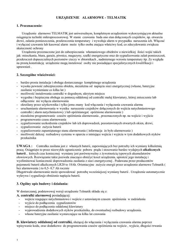 URZĄDZENIE ALARMOWE - TELMATIK 1. Przeznaczenie: Urządzenie alarmowe TELMATIK jest uniwersalnym, kompletnym urządzeniem wykorzystującym aktualne osiągnięcia techniki mikroprocesorowej. W stanie czuwania bada ono stan dołączonych czujników, np. otwarcia drzwi, zalania pomieszczenia, przekroczenia temperatury i wywołuje alarm w przypadku naruszenia ich. Włączać i wyłączać czuwanie lub kasować alarm może tylko osoba znająca właściwy kod, co zdecydowanie zwiększa skuteczność ochrony Urządzenie przeznaczone jest do zabezpieczania włamaniowego obiektów o niewielkiej ilości wejść takich jak: mieszkania, biura, garaże, piwnice, magazyny, szafki energetyczne oraz do sygnalizowania zalań pomieszczeń, przekroczeń dopuszczalnych poziomów cieczy w zbiornikach , nadmiernego wzrostu temperatury itp. Ze względu na prostą konstrukcję urządzenie mogą instalować osoby nie posiadające specjalistycznych kwalifikacji i uprawnień . 2. Szczególne właściwości: - bardzo prosta instalacja i obsługa dostarczanego kompletnego urządzenia - wysoka pewność zabezpieczenia obiektu, niezależna od napięcia sieci energetycznej (własne, bateryjne zasilanie wymieniane co kilka lat ) - możliwość instalowania centralki w dogodnym, ukrytym miejscu - wygodna i bezpieczna obsługa za pomocą oddalonej od centralki małej klawiatury, której zniszczenie lub odłączenie nie wyłącza alarmowania - określany przez użytkownika i tylko jemu znany kod włączania i wyłączania czuwania alarmu - uruchamianie alarmowania w wyniku naruszenie czujników dołączonych do wejścia natychmiastowego centralki ( alarm natychmiastowy ) lub opóźnianego( opóźnione alarmowanie ) - niezależne programowanie czasów opóźnienia alarmowania , przeznaczonych np. na wejście i wyjście - programowanie czasu alarmowania - sygnalizowanie uszkodzenia czujników lub ich doprowadzeń, pozostawionych otwartych okien, drzwi, - sygnalizowanie zużycia baterii - sygnalizowanie zapamiętanego stanu alarmowania ( informacja że było alarmowanie ) - możliwość dalszej rozbudowy systemu w oparciu o istniejące wejścia i wyjścia w tym dodatkowych styków przekaźnika UWAGA : Centralka zasilana jest z własnych baterii, zapewniających bez potrzeby ich wymiany kilkuletnią pracę. Osiągnięto to przez niezwykłe ograniczenie poboru prądu i stosowanie bardzo wydajnych alkalicznych baterii , których czas koniecznej wymiany jest porównywalny z żywotnością typowych akumulatorów ołowiowych. Rozwiązanie takie pozwala znacząco obniżyć koszt urządzenia, uprościć jego instalację i wyeliminować konieczność doprowadzenia zasilania z sieci energetycznej . Podawana przez producentów pojemność baterii alkalicznych LR20 to 18Ah. Orientacyjne zużycie energii przez urządzenie alarmowe Telmatik ( bez alarmowania ) to 0,5- 0,7 Ah rocznie Długotrwałe alarmowanie może spowodować potrzebę wcześniejszej wymiany baterii . Urządzenie automatycznie wykrywa i sygnalizuje obniżenie napięcia baterii. 3. Ogólny opis budowy i działania: W dostarczanej, podstawowej wersji urządzenie Telmatik składa się z: A. centralki alarmowej posiadającej: - wejście reagujące natychmiastowo i wejście z ustawianym czasem opóźnienia w zadziałaniu wyjście do podłączenia sygnalizatorów miejsce do podłączenia oddalonej klawiatury wyprowadzenia dodatkowych styków przekaźnika, do ewentualnej rozbudowy urządzenia. własne bateryjne zasilanie wystarczające na kilka lat czuwania B. klawiatury oddalonej od centralki, służącej do włączania i wyłączania czuwania alarmu poprzez wpisywanie kodu, oraz dodatkowo do programowania czasów opóźnienia na wejście , wyjście, długości trwania 1 alarmu, wpisywania indywidualnego kodu uprawniającego ( hasła ),. Klawiatura wyposażona jest w kontrolny sygnalizator akustyczny. Zniszczenie klawiatury nie wyłącza alarmowania C. syrenki alarmowej W komplecie dostarczana jest syrenka piezoceramiczna - 105dB/150mA/6-12V. Małe wymiary pozwalają na jej proste ukrycie lub montowanie w otworze ściennym z zastosowaniem kratki ochronnej. Oferowana syrenka odporna jest na zewnętrzne warunki atmosferyczne i może być montowana na zewnątrz budynku. UWAGA: Do centralki można bezpośrednio włączać dwie syrenki takie jak dostarczana w komplecie, lub inne niż oferowane, o umiarkowanym poborze prądu. Orientacyjny dopuszczalny pobór prądu przez sygnalizatory wynosi 400mA. Kolejne sygnalizatory można uruchamiać wyprowadzonymi stykami przekaźnika pomocniczego D. czujnika kontaktronowego dostarczanego w komplecie. Można dołączać inne czujniki, działające na zasadzie rozwarcia obwodu takie jak: pętle z folii lub cienkiego drutu, czujniki ruchu wyposażone w własne źródło zasilania, stykowe czujniki poziomu cieczy, bimetaliczne czujniki temperatury itp. Do wejść centralki można dołączać również wyjścia zdalnych sterowań ( pilotów radiowych ) dla budowy funkcji alarmów napadowych itp. W stanie czuwania alarmu, kontrolowana jest ciągłość przepływu prądu przez nadzorowane linie. Nawet krótkotrwałe rozwarcie nadzorowanych obwodów przez otwarcie lub wyważenie drzwi wejściowych ( powodujących odsunięcie magnesu od styków czujnika ), otwarcie okien, wykrycie naruszenia przez inne czujniki lub przecięcie przewodów doprowadzających powoduje natychmiastowy lub opóźniony alarm. 4. Obsługa urządzenia TELMATIK: - przed wyjściem z pomieszczenia należy włączyć czuwanie alarmu przez wprowadzenie kodu z klawiatury po włączeniu czuwania alarmu należy otworzyć drzwi i wyjść z pomieszczenia w czasie krótszym niż wcześniej zaprogramowanym „czasie na wyjście”. Odliczanie tego czasu sygnalizowane jest krótkimi sygnałami z klawiatury - naruszenie ( w stanie czuwania ) czujnika z opóźnionym alarmowaniem ( typowo są to drzwi wejściowe ) powoduje odliczanie „czasu na wejście” i o ile alarm nie zostanie w tym czas