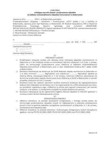 UMOWA ustalająca warunki dostaw i przyjmowania odpadów do Zakładu Unieszkodliwiania Odpadów Komunalnych w Białymstoku zawarta w dniu ……………… 2015 r. w Białymstoku pomiędzy: Przedsiębiorstwem Usługowo – Handlowo – Produkcyjnym „LECH” Spółka z o.o. z siedzibą w Białymstoku, wpisaną przez Sąd Rejonowy w Białymstoku XII Wydział Gospodarczy KRS w Rejestrze Przedsiębiorców Krajowego Rejestru Sądowego pod numerem 0000097008, NIP 542-020-03-81, REGON: 050001472, kapitał zakładowy 37.072.936,00 PLN, reprezentowaną przez: 1. Michała Witolda Stefanowicza – Prezesa Zarządu 2. Alinę Pisiecką – Wiceprezes Zarządu zwanym w treści umowy Odbiorcą a: …………………………………………………………………………………………………, wpis do EDG / KRS ……….., NIP ……………….. , REGON ……………………… , reprezentowaną przez: 1. ………………... – 2. …………........... zwanym dalej Dostawcą. §1 PRZEDMIOT UMOWY 1. Przedmiotem niniejszej umowy jest dostawa przez Dostawcę odpadów wymienionych w Załączniku nr 1 do niniejszej umowy w minimalnych ilościach ustalonych w § 5 pkt 1 umowy, celem ich termicznego przekształcenia przez Odbiorcę w Zakładzie Unieszkodliwiania Odpadów Komunalnych w Białymstoku, przy ul. Gen. Władysława Andersa 40 F (dalej: ZUOK w Białymstoku). 2. Dostawca zobowiązuje się dostarczać do ZUOK Białystok odpady wymienione w Załączniku nr 1 w ilości minimum …………… Mg/tydzień, oraz maksimum …………… Mg/tydzień zgodnie ze złożoną Ofertą, stanowiącą Załącznik nr 2 do umowy, natomiast Odbiorca zobowiązuje się termicznie przekształcić odpady dostarczone przez Odbiorcę w ZUOK w Białymstoku w zamian za opłatę ustaloną w § 6 ust. 1 umowy. 3. Dostawca może bez żadnych ujemnych skutków prawnych przekazać do zagospodarowania większe ilości Odpadów niż określone ust.2 nie więcej jednak niż o 20% wskazanych tam ilości, po uprzednim uzgodnieniu tego z Odbiorcą na piśmie pod rygorem nieważności, jak również mniejsze, o ile wykaże, iż zmniejszenie nastąpiło na skutek działania siły wyższej. 4. Dostawca zobowiązuje się do zapewnienia ciągłości dostaw odpadów w ilościach zgodnych z umową w całym okresie obowiązywania umowy. §2 OŚWIADCZENIA ODBIORCY 1. Odbiorca oświadcza, że posiada pozwolenie zintegrowane, z którego wynika prawo do termicznego przekształcania odpadów innych niż niebezpieczne o zdolności przetwarzania ponad 3 tony na godzinę odpadów szczegółowo wymienionych w Załączniku nr 1 do umowy, stanowiącym jej integralną część. 2. Odbiorca oświadcza, że posiada wdrożony i funkcjonujący Zintegrowany System Zarządzania zgodnie z normą PN-EN ISO 9001:2009, PN-EN ISO 14001:2005 oraz PN-N-18001:2004. Strona 1 z 5 1. 2. 3. 4. 5. §3 OŚWIADCZENIA DOSTAWCY Dostawca oświadcza, że posiada zezwolenia właściwych organów na gospodarowanie odpadami, które będą dostarczane do ZUOK w Białymstoku w zakresie transportu odpadów. Dostawca oświadcza, że ponosi pełną odpowiedzialność za transport odpadów zgodnie z obowiązującymi wymaganiami w zakresie ochrony środowiska oraz bezpieczeństwa życia i zdrowia ludzi. Dostawca przyjmuje do wiadomości, że odpadów niewymienionych w Załączniku nr 1 do umowy Odbiorca nie będzie przyjmował oraz, że Odbiorca ma prawo odmówić przyjęcia większej ilości odpadów, niż ………. Mg/tydzień, wskazanych w Ofercie Dostawcy stanowiącej Załącznik nr 2 umowy, jako maksymalna ilość tygodniowa z zastrzeżeniem §1 ust. 3 umowy. Dostawca przyjmuje do wiadomości, że Odbiorca może odmówić przyjęcia lub wstrzymać czasowo przyjmowanie odpadów w ramach niniejszej umowy bez jakichkolwiek skutków prawnych i/lub finansowych dla Odbiorcy, w przypadku wystąpienia w szczególności: a) konieczności zatrzymania instalacji, w szczególności w celu niezbędnych regulacji, zmian i poprawek, b) awarii instalacji, c) wahania wartości opałowej dostarczanych odpadów, d) siły wyższej. Z uwagi na postanowienia § 2 umowy, w zakresie współpracy z Odbiorcą, Dostawca zobowiązuje się do przestrzegania przepisów prawa dotyczących ochrony środowiska oraz bezpieczeństwa i higieny pracy. §4 OBOWIĄZKI ODBIORCY Odbiorca zobowiązuje się do: 1/ Przyjmowania odpadów we wszystkie dni robocze od poniedziałku do piątku w godzinach: od 6.00 do 22.00, przy czym godzina 21.30 jest ostatnią możliwą godziną wjazdu do ZUOK w Białymstoku, oraz w soboty w godzinach od 7.00 do 15.00 , przy czym godzina 14:30 jest ostatnią możliwą godziną wjazdu do ZUOK w Białymstoku, w uzasadnionych i uzgodnionych pomiędzy Stronami przypadkach, możliwe jest ustalenie innych godzin przyjęcia odpadów, 2/ Zapewnienia sprawnego systemu ważenia i klasyfikowania odpadów dostarczonych przez Dostawcę, 3/ Przygotowania i wskazania Dostawcy miejsca przeznaczonego do wyładunku odpadów, 4/ Pisemnego potwierdzenia przyjęcia odpadów od Dostawcy na miesięcznej karcie przekazania odpadów (KPO) wystawionej przez Dostawcę, wystawienia dokumentów księgowych, tj. faktury VAT w ostatnim dniu miesiąca na podstawie dokumentów wagowych zawierających rodzaj, kod i ilość dostarczanych odpadów w danym miesiącu, 5/ Zapewnienia utwardzonego dojazdu do miejsca wyładunku odpadów i placu manewrowego, na którym Dostawca będzie mógł dokonywać manewrów związanych z dojazdem i wyładunkiem zgodnie z zasadami bezpieczeństwa i wymogami przepisów ruchu drogowego, 6/ Właściwego oznaczenia dróg wewnętrznych i technologicznych na terenie ZUOK w Białymstoku, 7/ Gdy temperatura powietrza jest powyżej 0 °C do zapewnienia do dezynfekcji kół pojazdów opuszczających ZUOK w Białymstoku, §5 OBOWIĄZKI DOSTAWCY Dostawca zobowiązuje się do: 1/ Dostarczania odpadów wymienionych w Załączniku nr 1 w ilości minimum ……………Mg/tydzień, zgodnie