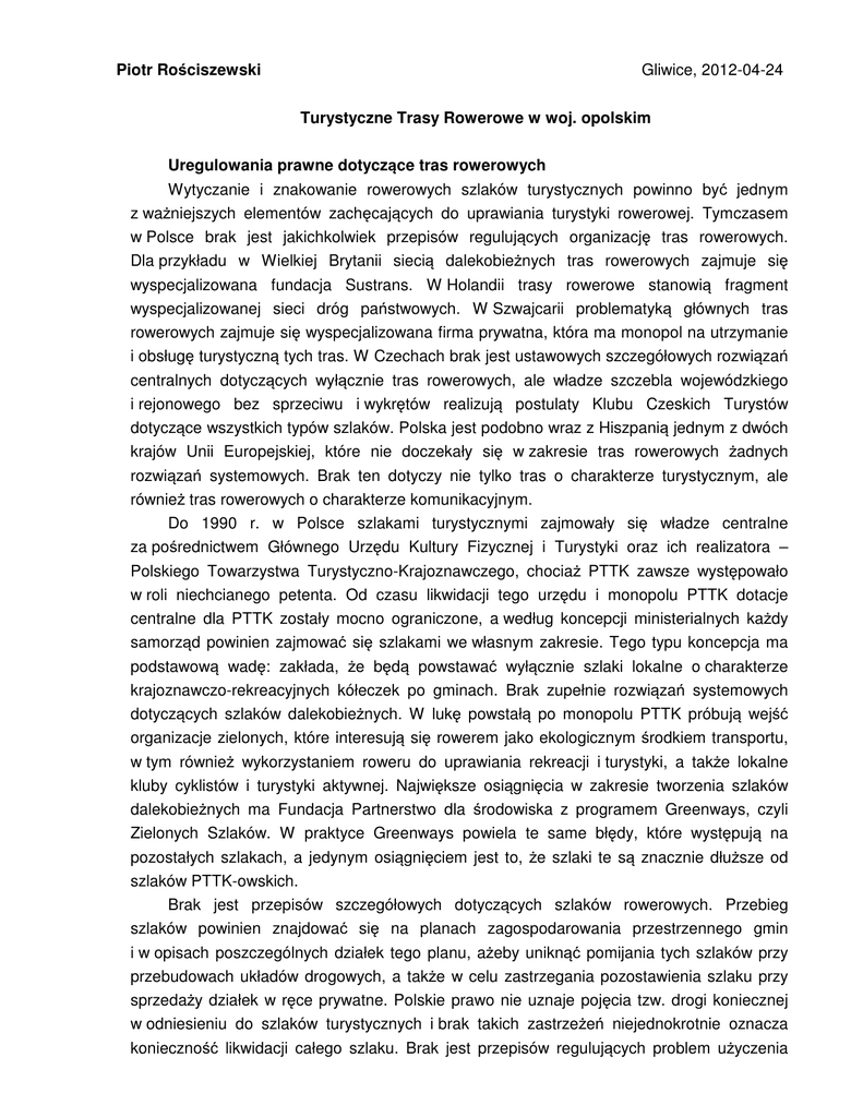 Piotr Rościszewski Gliwice, 2012-04-24 Turystyczne Trasy Rowerowe w woj. opolskim Uregulowania prawne dotyczące tras rowerowych Wytyczanie i znakowanie rowerowych szlaków turystycznych powinno być jednym z ważniejszych elementów zachęcających do uprawiania turystyki rowerowej. Tymczasem w Polsce brak jest jakichkolwiek przepisów regulujących organizację tras rowerowych. Dla przykładu w Wielkiej Brytanii siecią dalekobieżnych tras rowerowych zajmuje się wyspecjalizowana fundacja Sustrans. W Holandii trasy rowerowe stanowią fragment wyspecjalizowanej sieci dróg państwowych. W Szwajcarii problematyką głównych tras rowerowych zajmuje się wyspecjalizowana firma prywatna, która ma monopol na utrzymanie i obsługę turystyczną tych tras. W Czechach brak jest ustawowych szczegółowych rozwiązań centralnych dotyczących wyłącznie tras rowerowych, ale władze szczebla wojewódzkiego i rejonowego bez sprzeciwu i wykrętów realizują postulaty Klubu Czeskich Turystów dotyczące wszystkich typów szlaków. Polska jest podobno wraz z Hiszpanią jednym z dwóch krajów Unii Europejskiej, które nie doczekały się w zakresie tras rowerowych żadnych rozwiązań systemowych. Brak ten dotyczy nie tylko tras o charakterze turystycznym, ale również tras rowerowych o charakterze komunikacyjnym. Do 1990 r. w Polsce szlakami turystycznymi zajmowały się władze centralne za pośrednictwem Głównego Urzędu Kultury Fizycznej i Turystyki oraz ich realizatora – Polskiego Towarzystwa Turystyczno-Krajoznawczego, chociaż PTTK zawsze występowało w roli niechcianego petenta. Od czasu likwidacji tego urzędu i monopolu PTTK dotacje centralne dla PTTK zostały mocno ograniczone, a według koncepcji ministerialnych każdy samorząd powinien zajmować się szlakami we własnym zakresie. Tego typu koncepcja ma podstawową wadę: zakłada, że będą powstawać wyłącznie szlaki lokalne o charakterze krajoznawczo-rekreacyjnych kółeczek po gminach. Brak zupełnie rozwiązań systemowych dotyczących szlaków dalekobieżnych. W lukę powstałą po monopolu PTTK próbują wejść organizacje zielonych, które interesują się rowerem jako ekologicznym środkiem transportu, w tym również wykorzystaniem roweru do uprawiania rekreacji i turystyki, a także lokalne kluby cyklistów i turystyki aktywnej. Największe osiągnięcia w zakresie tworzenia szlaków dalekobieżnych ma Fundacja Partnerstwo dla środowiska z programem Greenways, czyli Zielonych Szlaków. W praktyce Greenways powiela te same błędy, które występują na pozostałych szlakach, a jedynym osiągnięciem jest to, że szlaki te są znacznie dłuższe od szlaków PTTK-owskich. Brak jest przepisów szczegółowych dotyczących szlaków rowerowych. Przebieg szlaków powinien znajdować się na planach zagospodarowania przestrzennego gmin i w opisach poszczególnych działek tego planu, ażeby uniknąć pomijania tych szlaków przy przebudowach układów drogowych, a także w celu zastrzegania pozostawienia szlaku przy sprzedaży działek w ręce prywatne. Polskie prawo nie uznaje pojęcia tzw. drogi koniecznej w odniesieniu do szlaków turystycznych i brak takich zastrzeżeń niejednokrotnie oznacza konieczność likwidacji całego szlaku. Brak jest przepisów regulujących problem użyczenia 2 dróg prywatnych na cele publiczne, a odpowiedzialność za szkody powstałe w wyniku takiego użyczenia nie jest ściśle określona. PTTK jako jedyne w Polsce opracowało kadłubową instrukcję oznakowania szlaków rowerowych, ale brak jest szczegółowych uregulowań prawnych z zasadami ich stosowania. Obecnie teoretycznie np. trzech niezależnych organizatorów tras rowerowych może w tym samym miejscu skrzyżować swoje szlaki w tym samym kolorze, nikt tego nie koordynuje i nikt za to nie odpowiada. Na wspólnych odcinkach kilku tras znaki powinny być umieszczane wspólnie, ale w przypadku dwóch administratorów tras nie wiadomo kto ma komu ustąpić. Kilka lat temu Ministerstwo Infrastruktury, nie pytając PTTK o zdanie, dwukrotnie zmieniło obowiązujące wzory znaków szlaków rowerowych. Zmieniono np. kształt kierownicy i siodełka piktogramu roweru oraz zróżnicowano kierunki usytuowania roweru, dodano do znaków czarną ramkę. Zabroniono stosowania znaków nieodblaskowych. Oczywiście kosztami zmian wynikających z tego tytułu obarczono administratorów szlaków, a z uwagi na małą wagę problemu na wielu szlakach znajdują się na przemian znaki ze starymi i nowymi piktogramami rowerów, pasków i strzałek. Brak jest jakichkolwiek uregulowań prawnych dotyczących klasyfikacji szlaków rowerowych ze standardami różnych typów w zależności od rodzaju i wielkości ruchu rowerowego, a także w zależności od parametrów technicznych trasy. Dla powstającej sieci tras rowerowych Ściany Wschodniej eksperci GDDKiA zaproponowali adaptowanie tymczasowo wzorów duńskich, najczęściej stosowanych w Europie. Współpraca pomiędzy samorządami a PTTK Chociaż PTTK jako jedyna organizacja w Polsce szkoli i zrzesza znakarzy, tj. osoby znające problematykę znakowania szlaków turystycznych, to samorządy rzadko korzystają ze współpracy z tym Towarzystwem. Przyczyna braku tej współpracy wynika ze złych nawyków obu stron. Wielu urzędników nie lubi, jak ktoś im psuje szyki i nie pozwala zlecać wykonywania prac osobom, które się na tym kompletnie nie znają, ale robią to taniej niż PTTK lub pod dyktando wydumanych życzeń urzędników. W ten sposób powstają kolejne kilometry statystycznych szlaków, które nikomu do niczego nie służą oprócz wypełniania kolejnych pozycji w sprawozdaniach, a na dodatek nigdy właściwie nie są promowane, nie są konserwowane i poprawiane, zwłaszcza w przypadku zmian personalnych w urzędach, które te szlaki popełniły. PTTK z kolei nie umie opanować organizacyjnie problematyki znakowania szlaków, a zwłaszcza nowej dziedziny, jaką są szlaki rowerowe. Zas