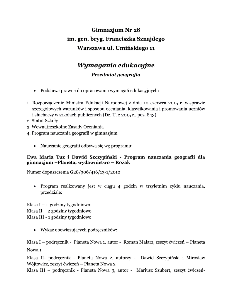 Gimnazjum Nr 28 im. gen. bryg. Franciszka Sznajdego Warszawa ul. Umińskiego 11 Wymagania edukacyjne Przedmiot geografia Podstawa prawna do opracowania wymagań edukacyjnych: 1. Rozporządzenie Ministra Edukacji Narodowej z dnia 10 czerwca 2015 r. w sprawie szczegółowych warunków i sposobu oceniania, klasyfikowania i promowania uczniów i słuchaczy w szkołach publicznych (Dz. U. z 2015 r., poz. 843) 2. Statut Szkoły 3. Wewnątrzszkolne Zasady Oceniania 4. Program nauczania geografii w gimnazjum Nauczanie geografii odbywa się wg programu: Ewa Maria Tuz i Dawid Szczypiński - Program nauczania geografii dla gimnazjum –Planeta, wydawnictwo – Rożak Numer dopuszczenia G28/306/416/13-1/2010 Program realizowany jest w ciągu 4 godzin w trzyletnim cyklu nauczania, przedziale: Klasa I – 1 godziny tygodniowo Klasa II – 2 godziny tygodniowo Klasa III - 1 godziny tygodniowo Wykaz obowiązujących podręczników: Klasa I – podręcznik - Planeta Nowa 1, autor - Roman Malarz, zeszyt ćwiczeń – Planeta Nowa 1 Klasa II- podręcznik - Planeta Nowa 2, autorzy - Dawid Szczypiński i Mirosław Wójtowicz, zeszyt ćwiczeń – Planeta Nowa 2 Klasa III – podręcznik - Planeta Nowa 3, autor - Mariusz Szubert, zeszyt ćwiczeń- Planeta Nowa 3 Środki dydaktyczne ucznia do pracy indywidualnej podręcznik, zeszyt ćwiczeń, zeszyt przedmiotowy, atlas, zestaw map konturowych I. PODSTAWOWE ZASADY OCENIANIA Ocenie podlegają umiejętności i wiedza określona programem nauczania Ocenianie odbywa się w stopniach szkolnych w skali od 1 do 6 Stosowana jest ocena cząstkowa za prace na lekcji w formie plusów i minusów. Za pięć plusów – ocena bardzo dobra, za pięć minusów – ocena niedostateczna Oceny są jawne Uczeń ma prawo zgłosić w ciągu półrocza dwa razy nieprzygotowanie Nieprzygotowanie powinno być zgłoszone przez ucznia po sprawdzeniu obecności, jednak nie dotyczy to zapowiedzianego sprawdzianu bądź kartkówki. Uczeń ma obowiązek zaliczenia zapowiedzianych sprawdzianów na ocenę pozytywną. W przypadku nieobecności ucznia, ma on obowiązek zaliczyć sprawdzian w ciągu dwóch tygodni od terminu jego przeprowadzenia, ew. w ciągu tygodnia od powrotu do szkoły. W przypadku gdy uczeń nie zgłosi się na zaliczenie otrzymuje ocenę niedostateczną. Uczeń ma prawo do poprawy oceny ze sprawdzianu w terminie do dwóch tygodni od rozdania prac. Uczeń poprawia sprawdzian tylko raz i nie więcej niż 2 sprawdziany z oceną niedostateczną w półroczu. Formy kontroli bieżącej tj.: kartkówki, odpowiedzi ustne, prace domowe podlegają poprawie- oceny niedostateczne i dopuszczające. Każdy uczeń ma prawo do otrzymania dodatkowych ocen, które może uzyskać, biorąc udział w konkursach, wykonując i przygotowując dodatkowe zadanie, opracowując referaty na temat określony przez nauczyciela lub tworząc własny projekt pracy (po uzgodnieniu z nauczycielem) Ocena śródroczna jest wystawiana na podstawie wszystkich ocen cząstkowych obejmujących prace ucznia w całym semestrze. Nie jest jednak średnią arytmetyczną tych ocen, ze względu na wagę ocen., np.: sprawdzian, test – waga 2, pozostałe waga – 1. W przypadku uzyskania oceny niedostatecznej na I półrocze, uczeń jest zobowiązany zaliczyć materiał z I półrocza na ocenę dopuszczającą w terminie ustalonym z nauczycielem. Wskazówki dotyczące minimum obowiązującego do zaliczenia materiału są przez nauczyciela przekazane uczniowi pisemnie. Zaliczenie materiału odbywa się w formie pisemnej, w uzasadnionych przypadkach materiał może być rozłożony na mniejsze partie. W przypadku zagrożenia otrzymaniem oceny niedostatecznej na II półrocze uczeń jest zobowiązany zaliczyć materiał z II półrocza na ocenę dopuszczającą w terminie przed Radą Klasyfikacyjną. Wskazówki dotyczące minimum obowiązującego do zaliczenia materiału są przez nauczyciela przekazane uczniowi pisemnie. Zaliczenie materiału odbywa się w formie pisemnej. W przypadku uzyskania oceny niedostatecznej na I półrocze, nie zaliczenia w sposób opisany wyżej materiału z tego półrocza oraz uzyskania oceny niedostatecznej na II półrocze uczeń otrzymuje ocenę roczną niedostateczną. Uczniowie z dysfunkcjami oceniani są wg odrębnych zasad zalecanych przez PPP II. Pomiar osiągnięć uczniów odbywa się za pomocą następujących narzędzi: Wypowiedzi ustne (3 ostatnie tematy, a w przypadku lekcji powtórzeniowych cały dział programowy) Prace klasowe po zakończonym dziale programowym Testy (nauczycielskie i standaryzowane) Egzaminy próbne wewnątrzszkolne Aktywność na lekcji (system plusów, minusów) Zadania domowe Praca pozalekcyjna Prowadzenie zeszytu przedmiotowego i zeszytu ćwiczeń/uczeń ma obowiązek prowadzić zeszyt przedmiotowy, w którym powinny znajdować się zapisy: nr lekcji, data i temat, notatki, zapisy poleceń ustnych lub pisemnych prac domowych, zeszyt powinien być prowadzony systematycznie, w przypadku nieobecności ucznia w szkole, powinien go uzupełnić Kartkówki z 3 ostatnich tematów III. Kryteria oceny przy realizacji konkretnych zadań 1. Prace klasowe a) Prace pisemne obejmują sprawdziany i kartkówki. Sprawdziany są obowiązkowe i zapowiedziane b) Sprawdzian poprzedza lekcja powtórzeniowa, utrwalająca poznane wiadomości i umiejętności c) Sprawdziany są obowiązkowe, uczniowie nieobecni w szkole mają dwa tygodnie na zaliczenie, w przeciwnym wypadku uczeń otrzymuje ocenę niedostateczną e) Kartkówki są niezapowiedziane i sprawdzają wiedzę i umiejętności bieżące i obejmują trzy tematy f) Prace pisemne (testy, sprawdziany, prace klasowe) są przechowywane do końca każdego roku szkolnego g) W przypadku gdy uczeń ściąga podczas pisania sprawdzianu, praca zostaje odebrana a uczeń otrzymuje ocenę niedostateczną i) Testy kompetencji i egzaminy próbne mogą być oceniane, ale ocena nie może mieć wpływu na ocenę śródroczną lub roczną. j) Oc
