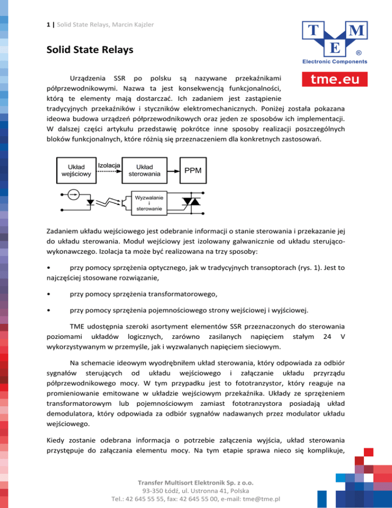 1 | Solid State Relays, Marcin Kajzler Solid State Relays Urządzenia SSR po polsku są nazywane przekaźnikami półprzewodnikowymi. Nazwa ta jest konsekwencją funkcjonalności, którą te elementy mają dostarczać. Ich zadaniem jest zastąpienie tradycyjnych przekaźników i styczników elektromechanicznych. Poniżej została pokazana ideowa budowa urządzeń półprzewodnikowych oraz jeden ze sposobów ich implementacji. W dalszej części artykułu przedstawię pokrótce inne sposoby realizacji poszczególnych bloków funkcjonalnych, które różnią się przeznaczeniem dla konkretnych zastosowań. Zadaniem układu wejściowego jest odebranie informacji o stanie sterowania i przekazanie jej do układu sterowania. Moduł wejściowy jest izolowany galwanicznie od układu sterującowykonawczego. Izolacja ta może być realizowana na trzy sposoby: • przy pomocy sprzężenia optycznego, jak w tradycyjnych transoptorach (rys. 1). Jest to najczęściej stosowane rozwiązanie, • przy pomocy sprzężenia transformatorowego, • przy pomocy sprzężenia pojemnościowego strony wejściowej i wyjściowej. TME udostępnia szeroki asortyment elementów SSR przeznaczonych do sterowania poziomami układów logicznych, zarówno zasilanych napięciem stałym 24 V wykorzystywanym w przemyśle, jak i wyzwalanych napięciem sieciowym. Na schemacie ideowym wyodrębniłem układ sterowania, który odpowiada za odbiór sygnałów sterujących od układu wejściowego i załączanie układu przyrządu półprzewodnikowego mocy. W tym przypadku jest to fototranzystor, który reaguje na promieniowanie emitowane w układzie wejściowym przekaźnika. Układy ze sprzężeniem transformatorowym lub pojemnościowym zamiast fototranzystora posiadają układ demodulatora, który odpowiada za odbiór sygnałów nadawanych przez modulator układu wejściowego. Kiedy zostanie odebrana informacja o potrzebie załączenia wyjścia, układ sterowania przystępuje do załączania elementu mocy. Na tym etapie sprawa nieco się komplikuje, Transfer Multisort Elektronik Sp. z o.o. 93-350 Łódź, ul. Ustronna 41, Polska Tel.: 42 645 55 55, fax: 42 645 55 00, e-mail: [email protected] 2 | Solid State Relays, Marcin Kajzler ponieważ elementy SSR dzielą się na dwa typy, w zależności od zachowania, po otrzymaniu sygnału wzywającego do załączenia obciążenia. Układ wyzwalająco sterujący, który załącza obciążenie natychmiast, nazywa się random fire (turn-on) lub asynchronus turn-on i jest używany w przypadku przekaźników pracujących z napięciem przemiennym na wyjściu. Następstwem natychmiastowego załączenia jest pojawienie się dużych prądów, jeśli element SSR załączy zasilanie w okolicach szczytu sinusoidy napięcia. Przetężenie takie (inrush current) jest szczególnie duże (wartość prądu sięga dziesięciokrotności prądu znamionowego), kiedy mamy do czynienia z rozruchem silników lub obciążeniem pojemnościowym. Natychmiastowe załączenie występuje w elementach przeznaczonych do pracy z obciążeniami o charakterze stałym. Drugi rodzaj układu sterującego, przeznaczony wyłącznie do pracy z napięciami przemiennymi, załącza obciążenie wtedy, gdy wartość napięcia na obciążeniu przechodzi przez zero (Zero Voltage Switching „ZVS”). Wtedy dopiero załącza się półprzewodnik mocy. Podejście takie powoduje, że nie występuje wspomniany wcześniej udar prądowy wynikający z załączenia obciążenia w szczycie sinusoidy napięcia zasilającego. Należy tu wspomnieć, że przekaźniki półprzewodnikowe typu ZVS nie mogą być stosowane do sterowania silnikami trójfazowymi, ponieważ załączenie wszystkich trzech faz zasilania nie następuje równocześnie, co jest konieczne do prawidłowego rozruchu silnika. Ostatnim elementem urządzenia SSR jest przyrząd półprzewodnikowy mocy, który przewodzi prąd obciążenia. Dla obciążeń o charakterze stałoprądowym elementami wykonawczymi mogą być tranzystory MOSFET, IGBT lub BJT, które mogą pracować również z obciążeniami przemiennymi, wymaga to jednak połączenia w stopniu wyjściowym dwóch takich elementów antyrównolegle ze względu na ich unipolarność. Tranzystory mogą przejść do stanu blokowania niezwłocznie po otrzymaniu wyłączającego sygnału sterującego. Triaki i tyrystory przeznaczone są wyłącznie do obciążeń przemiennych, co wiąże się z faktem, że elementy te potrafią przejść do stanu blokowania i rozłączyć obciążenie jedynie podczas przejścia wartości prądu obciążenia przez zero. Ponieważ triak, podobnie jak tranzystor, jest przyrządem unipolarnym, aby uzyskać przewodzenie przekaźnika w dwu kierunkach należy połączyć dwa takie elementy antyrównolegle. Na rysunku przedstawiającym przykładową realizację przekaźnika w stopniu wyjściowym znajduje się triak. Skoro znamy już szczegóły budowy elementów SSR, warto zastanowić się nad ich wadami i zaletami w odniesieniu do tradycyjnych przekaźników elektromechanicznych. Pierwszą z cech przemawiających na korzyść urządzeń półprzewodnikowych jest brak powstawania łuku elektrycznego podczas załączania i rozłączania obciążenia. Powstawanie łuku powoduje degradację zestyków przekaźnika oraz emisję zakłóceń elektromagnetycznych w pełnym spektrum częstotliwości. Degradacja styków przekaźnika prowadzi do uszkodzenia elementu, a emisja EM może zakłócać pracę sąsiadujących układów elektronicznych. Występowanie iskry eliminuje możliwość użycia takiego elementu Transfer Multisort Elektronik Sp. z o.o. 93-350 Łódź, ul. Ustronna 41, Polska Tel.: 42 645 55 55, fax: 42 645 55 00, e-mail: [email protected] 3 | Solid State Relays, Marcin Kajzler w niektórych typach urządzeń przeznaczonych do pracy w środowiskach zagrożonych wybuchem. W urządzeniach półprzewodnikowych nie występuje również zjawisko drgania zestyków, które wpływa na zmniejszenie żywotnośc