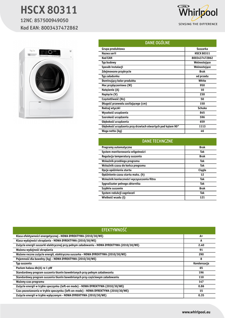 HSCX 80311 12NC: 857500949050 Kod EAN: 8003437472862 DANE OGÓLNE Grupa produktowa Suszarka Nazwa serii HSCX 80311 Kod EAN 8003437472862 Typ budowy Wolnostojące Sposób instalacji Wolnostojące Zdejmowane przykrycie Brak Typ załadunku od przodu Dominujący kolor produktu White Moc przyłączeniowa (W) 950 Natężenie (A) 10 Napięcie (V) 230 Częstotliwość (Hz) 50 Długość przewodu zasilającego (cm) 150 Rodzaj wtyczki Schuko Wysokość urządzenia 845 Szerokość urządzenia 596 Głębokość urządzenia 659 Głębokość urządzenia przy drzwiach otwartych pod kątem 90° 1113 Waga netto (kg) 46 DANE TECHNCZNE Programy automatyczne Brak System monitorowania wilgotności Tak Regulacja temperatury suszenia Brak Wskaźnik przebiegu programu Tak Wskaźnik czasu do końca programu Opcje opóźnienia startu Tak Ciągła Opóźnienie czasu startu maks. (h) 12 Wskaźnik konieczności wyczyszczenia filtra Tak Sygnalizator pełnego zbiornika Tak Szybkie suszenie Brak System redukcji zagnieceń Tak Wielkość wsadu (l) 121 EFEK EFEKTT YWNOŚĆ Klasa efektywności energetycznej - NOWA DYREKTYWA (2010/30/WE) Klasa wydajności skraplania - NOWA DYREKTYWA (2010/30/WE) Zużycie energii suszarki elektrycznej przy pełnym załadowaniu - NOWA DYREKTYWA (2010/30/WE) A+ A 2.40 Ważona wydajność skraplania 91 Ważone roczne zużycie energii, elektryczna suszarka - NOWA DYREKTYWA (2010/30/WE) 290 Pojemność dla bawełny (kg) - NOWA DYREKTYWA (2010/30/WE) Typ suszenia 8 Kondensacja Poziom hałasu db(A) re 1 pW 65 Standardowy program suszenia tkanin bawełnianych przy pełnym załadowaniu 196 Standardowy program suszenia tkanin bawełnianych przy częściowym załadowaniu 110 Ważony czas programu 147 Zużycie energii w trybie spoczynku (left-on mode) - NOWA DYREKTYWA (2010/30/WE) 0.86 Czas pozostawania w trybie spoczynku (left-on-mode) - NOWA DYREKTYWA (2010/30/WE) Zużycie energii w trybie wyłączonym - NOWA DYREKTYWA (2010/30/WE) 15 0.35 www.whirlpool.eu