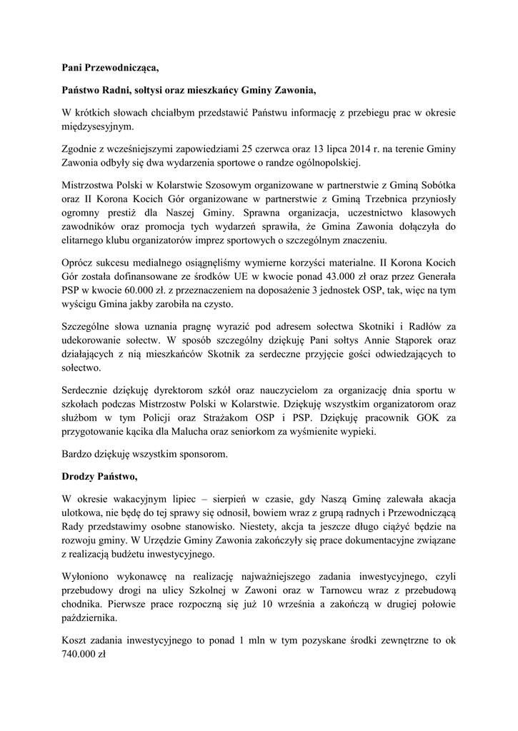 Pani Przewodnicząca, Państwo Radni, sołtysi oraz mieszkańcy Gminy Zawonia, W krótkich słowach chciałbym przedstawić Państwu informację z przebiegu prac w okresie międzysesyjnym. Zgodnie z wcześniejszymi zapowiedziami 25 czerwca oraz 13 lipca 2014 r. na terenie Gminy Zawonia odbyły się dwa wydarzenia sportowe o randze ogólnopolskiej. Mistrzostwa Polski w Kolarstwie Szosowym organizowane w partnerstwie z Gminą Sobótka oraz II Korona Kocich Gór organizowane w partnerstwie z Gminą Trzebnica przyniosły ogromny prestiż dla Naszej Gminy. Sprawna organizacja, uczestnictwo klasowych zawodników oraz promocja tych wydarzeń sprawiła, że Gmina Zawonia dołączyła do elitarnego klubu organizatorów imprez sportowych o szczególnym znaczeniu. Oprócz sukcesu medialnego osiągnęliśmy wymierne korzyści materialne. II Korona Kocich Gór została dofinansowane ze środków UE w kwocie ponad 43.000 zł oraz przez Generała PSP w kwocie 60.000 zł. z przeznaczeniem na doposażenie 3 jednostek OSP, tak, więc na tym wyścigu Gmina jakby zarobiła na czysto. Szczególne słowa uznania pragnę wyrazić pod adresem sołectwa Skotniki i Radłów za udekorowanie sołectw. W sposób szczególny dziękuję Pani sołtys Annie Stąporek oraz działających z nią mieszkańców Skotnik za serdeczne przyjęcie gości odwiedzających to sołectwo. Serdecznie dziękuję dyrektorom szkół oraz nauczycielom za organizację dnia sportu w szkołach podczas Mistrzostw Polski w Kolarstwie. Dziękuję wszystkim organizatorom oraz służbom w tym Policji oraz Strażakom OSP i PSP. Dziękuję pracownik GOK za przygotowanie kącika dla Malucha oraz seniorkom za wyśmienite wypieki. Bardzo dziękuję wszystkim sponsorom. Drodzy Państwo, W okresie wakacyjnym lipiec – sierpień w czasie, gdy Naszą Gminę zalewała akacja ulotkowa, nie będę do tej sprawy się odnosił, bowiem wraz z grupą radnych i Przewodniczącą Rady przedstawimy osobne stanowisko. Niestety, akcja ta jeszcze długo ciążyć będzie na rozwoju gminy. W Urzędzie Gminy Zawonia zakończyły się prace dokumentacyjne związane z realizacją budżetu inwestycyjnego. Wyłoniono wykonawcę na realizację najważniejszego zadania inwestycyjnego, czyli przebudowy drogi na ulicy Szkolnej w Zawoni oraz w Tarnowcu wraz z przebudową chodnika. Pierwsze prace rozpoczną się już 10 września a zakończą w drugiej połowie października. Koszt zadania inwestycyjnego to ponad 1 mln w tym pozyskane środki zewnętrzne to ok 740.000 zł Wyłoniono wykonawców robót remontowych w szkołach oraz dostawców w projekcie Modernizacji Oddziałów Przedszkolnych dofinansowanych w kwocie 350.000 zł ze środków Unii Europejskiej oraz krajowych łącznie – 100 procent całości zadania inwestycyjnego. Pragnę podkreślić, iż w ramach realizacji dwóch projektów inwestycyjnych w dwóch zespołach Szkół tj. Zawoni i Czeszowie łącznie na inwestycje oraz wyposażenie do końca września br. wydamy kwotę ponad 500.000 zł. Wkład własny gminy wyniesie jedynie 50.000 zł. W wyniku zakończonych procedur oceny wniosków podpisano umowy na następujące inwestycje: 1. Budowa placów zabaw w Tarnowcu, Sędziach i Budczycach. Zadanie dofinansowane jest ze środków UE w ramach małych projektów poprzez LGD Kraina Wzgórz Trzebnickich w kwocie 25.000 zł. Projekt zostanie zakończony na przełomie września i października. 2. Budowa napowietrznych siłowni w Zawoni, Czeszowie i Złotowie. Zadanie dofinansowane jest w kwocie 30.000 zł ze środków Urzędu Marszałkowskiego w ramach programu Odnowy Dolnośląskiej Wsi. Projekt zostanie zakończony na przełomie września i października. 3. Przystąpiono do realizacji partnerskiego projektu rozwoju e- urzędu dofinansowanego w 85 % ze środków UE. 4. Zakończono etap dokumentacyjny na budowę chodnika na ulicy Oleśnickiej w Zawoni. We wrześniu zostanie wyłoniony w drodze przetargu niegraniczonego wykonawca realizacji tego zadania. Pierwsze prace ruszą w październiku br. Dofinansowanie ze środków Urzędu Marszałkowskiego to 300.000 zł. 5. Zdobyto pomoc ze środków UE na realizację nowego zadania inwestycyjnego tj. budowy chodnika w Czeszowie. Zadanie inwestycyjne zostanie zgłoszone do budżetu Gminy Zawonia na najbliższej Sesji Rady Gminy. W październiku zostanie wyłoniony w drodze przetargu nieograniczonego wykonawca tych prac. 6. Zakończono etap dokumentacji projektowej na budowę nowych punktów oświetleniowych. Na przełomie września i października zostanie wyłoniony w drodze przetargu nieograniczonego wykonawca tych robót. 7. Rozpoczęto realizację zadań w ramach funduszu sołeckiego. Pierwsze prace ruszyły w Pęciszowie oraz w Złotowie i Niedarach. Kolejne będą wykonywane we wrześniu i zakończone w październiku. 8. Wydłużono na kolejne 3 miesiące realizację projektu „Pierwsze przedszkole w gminie Zawoni”. Dzięki powstałym oszczędnością 3,4 i 5 latki w przedszkolu Zawoni skorzystają z bezpłatnej nauki języka angielskiego, rytmiki i gimnastyki korekcyjne. 9. Przystąpiono do realizacji prac bieżących w tym szczególnie przy drogach gminnych. W sumie na realizację prac inwestycyjnych do końca tego roku zostanie wydatkowana kwota ponad 3 mln zł. Dodać należy, że 3 września Naszą Gminę odwiedził Pan Marszałek Włodzimierz Chlebosz. Pan Marszałek przywiózł umowę na dofinansowanie prac remontowych w szkołach na kwotę 100.000 zł. Wizyta przebiegał w bardzo miłej atmosferze w obecności ks. Proboszcza, Pani sołtys sołectwa Złotów oraz Prezesa Świątyni Artystów Pana Ryszarda Gila. Podczas tej niecodziennej wizyty zaprezentowaliśmy Kościół w Złotowie wraz z niezwykłym dziełem Golgotą Jerzego Dudy Gracza. Pan Marszałek pogratulował nam podejmowanych inicjatyw i wielu inwestycji pozyskanych ze środków zewnętrznych. Na zakończenie dokonał wpisu do Księgi Pamiątkowej Świątyni Artystów. Szanowny Państwo, pragnę Pa