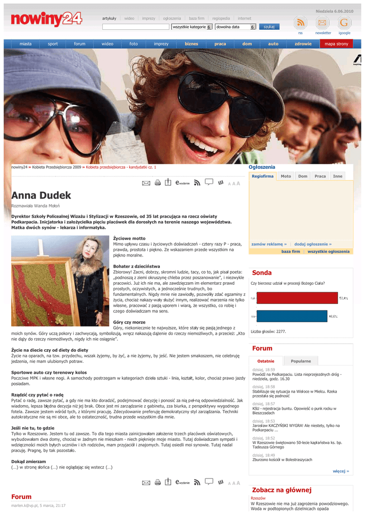 Niedziela 6.06.2010 artykuły wideo imprezy ogłoszenia baza firm wszystkie kategorie 6 regiopedia internet 6 dowolna data rss miasta sport forum wideo foto imprezy biznes praca dom auto newsletter zdrowie igoogle mapa strony reklama Ogłoszenia nowiny24 » Kobieta Przedsiębiorcza 2009 » Kobieta przedsiębiorcza - kandydatki cz. 1 Regiofirma Moto Dom Praca Inne A AA Anna Dudek Rozmawiała Wanda Mołoń Dyrektor Szkoły Policealnej Wizażu i Stylizacji w Rzeszowie, od 35 lat pracująca na rzecz oświaty Podkarpacia. Inicjatorka i założycielka pięciu placówek dla dorosłych na terenie naszego województwa. Matka dwóch synów - lekarza i informatyka. Życiowe motto Mimo upływu czasu i życiowych doświadczeń - cztery razy P - praca, prawda, prostota i piękno. Ze wskazaniem przede wszystkim na piękno moralne. Bohater z dzieciństwa Zbiorowy! Zacni, dobrzy, skromni ludzie, tacy, co to, jak pisał poeta: „podnoszą z ziemi okruszynę chleba przez poszanowanie”, i niezwykle pracowici. Już ich nie ma, ale zawdzięczam im elementarz prawd prostych, oczywistych, a jednocześnie trudnych, bo fundamentalnych. Nigdy mnie nie zawiodły, pozwoliły zdać egzaminy z życia, chociaż nakazy-wały służyć innym, realizować marzenia nie tylko własne, pracować z pasją uporem i wiarą, że wszystko, co robię i czego doświadczam ma sens. Góry czy morze Góry, niekoniecznie te najwyższe, które stały się pasją jednego z moich synów. Góry uczą pokory i zachwycają, symbolizują, wręcz nakazują dążenie do rzeczy niemożliwych, a przecież: „Kto nie dąży do rzeczy niemożliwych, nigdy ich nie osiągnie”. Życie na diecie czy od diety do diety Życie na oparach, na tzw. przydechu, wszak żyjemy, by żyć, a nie żyjemy, by jeść. Nie jestem smakoszem, nie celebruję jedzenia, nie mam ulubionych potraw. Sportowe auto czy terenowy kolos Poczciwe MPK i własne nogi. A samochody postrzegam w kategoriach dzieła sztuki - linia, kształt, kolor, chociaż prawo jazdy posiadam. Rządzić czy pytać o radę Pytać o radę, zawsze pytać, a gdy nie ma kto doradzić, podejmować decyzję i ponosić za nią peł-ną odpowiedzialność. Jak wiadomo, lepsza błędna decyzja niż jej brak. Obce jest mi zarządzanie z gabinetu, zza biurka, z perspektywy wygodnego fotela. Zawsze jestem wśród tych, z którymi pracuję. Zdecydowanie preferuję demokratyczny styl zarządzania. Techniki autokratyczne nie są mi obce, ale to ostateczność, trudna przede wszystkim dla mnie. Jeśli nie tu, to gdzie Tylko w Rzeszowie. Jestem tu od zawsze. To dla tego miasta zainicjowałam założenie trzech placówek oświatowych, wybudowałam dwa domy, chociaż w żadnym nie mieszkam - niech pięknieje moje miasto. Tutaj doświadczam sympatii i wdzięczności moich byłych uczniów i ich rodziców, mam przyjaciół i znajomych. Tutaj osiedli moi synowie. Tutaj nadal pracuję. Pragnę, by tak pozostało. zamów reklamę » | dodaj ogłoszenie » baza firm | wszystkie ogłoszenia Sonda Czy bierzesz udział w procesji Bożego Ciała? Liczba głosów: 2277. Forum Ostatnie Popularne dzisiaj, 18:59 Powódź na Podkarpaciu. Lista nieprzejezdnych dróg niedziela, godz. 16.30 dzisiaj, 18:58 Stabilizuje się sytuacja na Wisłoce w Mielcu. Rzeka przestała się podnosić dzisiaj, 18:57 KSU - rejestracja buntu. Opowieść o punk rocku w Bieszczadach dzisiaj, 18:53 Jarosław KACZYŃSKI WYGRA! Ale niestety, tylko na Podkarpaciu ... dzisiaj, 18:52 W Rzeszowie świętowano 50-lecie kapłaństwa ks. bp. Tadeusza Górnego dzisiaj, 18:49 Zburzono kościół w Bolestraszycach Dokąd zmierzam (…) w stronę słońca (…) nie oglądając się wstecz (…) więcej » A AA Zobacz na głównej Forum Rzeszów [email protected], 5 marca, 21:17 W Rzeszowie nie ma już zagrożenia powodziowego. Woda w podtopionych dzielnicach opada były uczeń, 23 luty, 15:18 byli uczniowie z tej szkoły tez trzymają kciuki za Naszą Panią Dyrektor Jasło Wino Jutrzenka z winnicy Golesz w Jaśle Championem! p.zzz, 23 luty, 15:05 ZDZ rzeszowki trzyma kciuki Wszystkie komentarze [10] » Dodaj komentarz » Podkarpacie Powódź na Podkarpaciu. Lista nieprzejezdnych dróg - niedziela, godz. 16.30 Mielec Wisłoka w Mielcu opada, ale jest nadal niebezpiecznie Piłka nożna Relacje na żywo z niedzielnych meczów piłki nożnej na Podkarpaciu: od I do IV ligi (6 czerwca) Podkarpacie Powódź na Podkarpaciu. Aktualny raport - niedziela, godz. 14 Podkarpacie Powóź na Podkarpaciu. Sprawdź listę nieprzejezdnych dróg Piłka nożna Najszybsze wyniki niedzielnych spotkań z niższych lig na Podkarpaciu (6 czerwca) Przemyśl Rzeszów Kraj Piłka ręczna Komentarze Forum Leżajsk Siatkówka Blogi Łańcut Tarnobrzeg Koszykówka Regiopedia Żużel Wideo Krosno Mielec Inne dyscypliny Zdjęcia Dębica Młoda Para Stalowa Wola Praca Dom Sanok Auto Jarosław Zdrowie Nisko Jasło Edukacja Podkarpacie Kobieta Bieszczady Reportaże Wywiady Mapy Media Regionalne sp. z o. o. w Warszawie zastrzegają, iż rozpowszechnianie artykułów i materiałów zamieszczonych na stronie www.nowiny24.pl jest zabronione bez zachowania warunków korzystania z treści. Wszelkie prawa zastrzeżone. Media Regionalne Sp. z o.o. w Warszawie. 2001-2010. kontakt reklama promocja redakcja