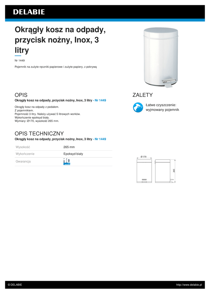 Okrągły kosz na odpady, przycisk nożny, Inox, 3 litry Nr 1449 Pojemnik na zużyte ręczniki papierowe i zużyte papiery, z pokrywą OPIS ZALETY Okrągły kosz na odpady, przycisk nożny, Inox, 3 litry - Nr 1449 Okrągły kosz na odpady z pedałem. Z pojemnikiem. Pojemność 3 litry. Należy używać 5 litrowych worków. Wykończenie epoksyd biały. Wymiary: Ø170, wysokość 265 mm. Łatwe czyszczenie: wyjmowany pojemnik OPIS TECHNICZNY Okrągły kosz na odpady, przycisk nożny, Inox, 3 litry - Nr 1449 Wysokość 265 mm Wykończenie Epoksyd biały Gwarancja © DELABIE http://www.delabie.pl