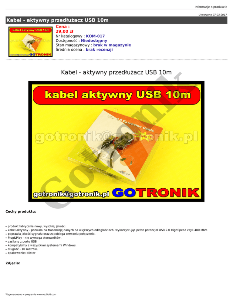 Informacje o produkcie Utworzono 07-03-2017 Kabel - aktywny przedłużacz USB 10m Cena : 29,00 zł Nr katalogowy : KOM-017 Dostępność : Niedostępny Stan magazynowy : brak w magazynie Średnia ocena : brak recenzji G ot r on ik Kabel - aktywny przedłużacz USB 10m Cechy produktu: ● ● ● ● ● ● ● ● produkt fabrycznie nowy, wysokiej jakości. kabel aktywny - pozwala na transmisję danych na większych odległościach, wykorzystując pełen potencjał USB 2.0 HighSpeed czyli 480 Mb/s poprawia jakość sygnału oraz zapobiega zerwaniu połączenia. Plug&Play - nie wymaga sterowników. zasilany z portu USB kompatybilny z wszystkimi systemami Windows. długość - 10 metrów. opakowanie: blister Zdjęcia: Wygenerowano w programie www.oscGold.com on ik ot r G