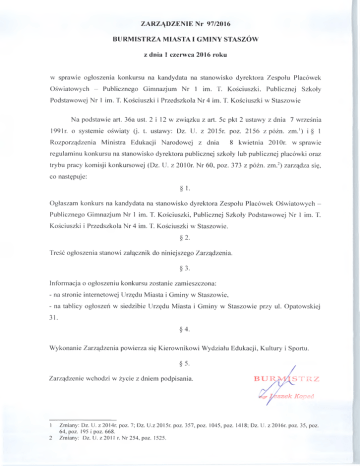 ZARZĄDZENIE Nr 97/2016 BURMISTRZA MIASTA I GMINY STASZÓW z dnia 1 czerwca 2016 roku w sprawie ogłoszenia konkursu na kandydata na stanowisko dyrektora Zespołu Placówek Oświatowych - Publicznego Gimnazjum Nr 1 im. T. Kościuszki. Publicznej Szkoły Podstawowej Nr 1 im. T. Kościuszki i Przedszkola Nr 4 im. T. Kościuszki w Staszowie Na podstawie art. 36a ust. 2 i 12 w związku z art. 5c pkt 2 ustawy z dnia 7 września 1991 r. o systemie oświaty (j. t. ustawy: Dz. U. z 2015r. poz. 2156 z późn. zm.1) i§ 1 Rozporządzenia Ministra Edukacji Narodowej z dnia 8 kwietnia 2010r. w sprawie regulaminu konkursu na stanowisko dyrektora publicznej szkoły lub publicznej placówki oraz trybu pracy komisji konkursowej (Dz. U. z 201 Or. Nr 60, poz. 373 z późn. zm.2) zarządza się, co następuje: §1. Ogłaszam konkurs na kandydata na stanowisko dyrektora Zespołu Placówek Oświatowych Publicznego Gimnazjum Nr 1 im. T. Kościuszki, Publicznej Szkoły Podstawowej Nr 1 im. T. Kościuszki i Przedszkola Nr 4 im. T. Kościuszki w Staszowie. § 2 . Treść ogłoszenia stanowi załącznik do niniejszego Zarządzenia. § 3. Informacja o ogłoszeniu konkursu zostanie zamieszczona: - na stronie internetowej Urzędu Miasta i Gminy w Staszowie, - na tablicy ogłoszeń w siedzibie Urzędu Miasta i Gminy w Staszowie przy ul. Opatowskiej 31. § 4. Wykonanie Zarządzenia powierza się Kierownikowi Wydziału Edukacji, Kultury i Sportu. § 5. Zarządzenie wchodzi w życie z dniem podpisania. 1 2 Zmiany: Dz. U. z2014r. poz. 7; Dz. U.z2015r. poz. 357, poz. 1045, poz. 1418; Dz. U. z2016r. poz. 35, poz. 64, poz. 195 i poz. 668. Zmiany: Dz. U. z 2011 r. Nr 254, poz. 1525. Załącznik do Zarządzenia Nr 97/2016 Burmistrza Miasta i Gminy Staszów z dnia 1 czerwca 2016r. OGŁOSZENIE O KONKURSIE BURMISTRZ MIASTA I GMINY STASZÓW ogłasza konkurs na kandydata na stanowisko dyrektora Zespołu Placówek Oświatowych - Publicznego Gimnazjum Nr 1 im. T. Kościuszki, Publicznej Szkoły Podstawowej Nr 1 im. T. Kościuszki i Przedszkola Nr 4 im. T. Kościuszki w Staszowie ul. Wysoka 39; 28-200 Staszów Część I. Do konkursu może przystąpić osoba, która spełnia wymagania określone w Rozporządzeniu Ministra Edukacji Narodowej z dnia 27 października 2009 r., w sprawie wymagań, jakim powinna odpowiadać osoba zajmująca stanowisko dyrektora oraz inne stanowisko kierownicze w poszczególnych typach publicznych szkół i rodzajach publicznych placówek (Dz. U. z 2009r. Nr 184, poz.1436 z późn. zm.), będąca nauczycielem mianowanym lub dyplomowanym, która posiada kwalifikacje do zajmowania stanowiska nauczyciela w szkole lub placówce wchodzącej w skład zespołu, w której wymagania dotyczące kwalifikacji nauczycieli są najwyższe, oraz spełnia łącznie następujące wymagania: 1) ukończyła studia magisterskie i posiada przygotowanie pedagogiczne oraz kwalifikacje do zajmowania stanowiska nauczyciela w Zespole Placówek Oświatowych - Publicznym Gimnazjum Nr 1 im. T. Kościuszki, Publicznej Szkole Podstawowej Nr 1 im. T. Kościuszki i Przedszkolu Nr 4 im. T. Kościuszki w Staszowie, w którym wymagania dotyczące kwalifikacji nauczycieli są najwyższe; 2) ukończyła studia wyższe lub studia podyplomowe z zakresu zarządzania albo kurs kwalifikacyjny z zakresu zarządzania oświatą, prowadzony zgodnie z przepisami w sprawie placówek doskonalenia nauczycieli; 3) posiada co najmniej pięcioletni staż pracy pedagogicznej na stanowisku nauczyciela lub pięcioletni staż pracy dydaktycznej na stanowisku nauczyciela akademickiego; 4) uzyskała: a) co najmniej dobrą ocenę pracy w okresie ostatnich pięciu lat pracy lub b) pozytywną ocenę dorobku zawodowego w okresie ostatniego roku albo c) w przypadku nauczyciela akademickiego - pozytywną ocenę pracy w okresie ostatnich czterech lat pracy w szkole wyższej przed przystąpieniem do konkursu na stanowisko dyrektora. 5) spełnia warunki zdrowotne niezbędne do wykonywania pracy na stanowisku kierowniczym; 6) nie była karana karą dyscyplinarną, o której mowa w art. 76 ust. 1 ustawy z dnia 26 stycznia 1982 r. - Karta Nauczyciela (j. t. Dz. U. z 2014r. poz. 191 z późn. zm.), a w przypadku nauczyciela akademickiego - karą dyscyplinarną, o której mowa w art. 140 ust. 1 ustawy z dnia 27 lipca 2005 r. - Prawo o szkolnictwie wyższym (j. t. Dz. U. z 2012r. poz. 572 z późn. zm.), oraz nie toczy się przeciwko niej postępowanie dyscyplinarne; 7) nie była skazana prawomocnym wyrokiem za umyślne przestępstwo lub umyślne przestępstwo skarbowe; 8) nie toczy się przeciwko niej postępowanie o przestępstwo ścigane z oskarżenia publicznego; 9) nie była karana zakazem pełnienia funkcji związanych z dysponowaniem środkami publicznymi, o którym mowa w art. 31 ust. 1 pkt 4 ustawy z dnia 17 grudnia 2004r. o odpowiedzialności za naruszenie dyscypliny finansów publicznych (j. t. Dz. U. z 2013r., poz. 168). Część II. Do konkursu może przystąpić również osoba, która: 1. Jest nauczycielem mianowanym lub dyplomowanym, zatrudnionym na stanowisku wymagającym kwalifikacji pedagogicznych w urzędzie organu administracji rządowej, kuratorium oświaty. Centrum Edukacji Artystycznej, Centralnej Komisji Egzaminacyjnej i okręgowych komisjach egzaminacyjnych bądź nauczycielem mianowanym lub dyplomowanym urlopowanym lub zwolnionym z obowiązku świadczenia pracy na podstawie przepisów ustawy z dnia 23 maja 1991 r. o związkach zawodowych (j. t. Dz. U. z2015r., poz. 1881), spełniający wymagania określone w rozporządzeniu, z wyjątkiem wymogu posiadania co najmniej dobrej oceny pracy albo pozytywnej oceny dorobku zawodowego. 2. Spełnia wymagania określone w Rozporządzeniu Ministra Edukacji Narodowej z dnia 27 października 2009 r., w sprawie wymagań, jakim powinna odpowiadać osoba zajmująca stanowisko dyrektora oraz inne stanowisko kierownicze w poszczególnych typach publicznych szkół i rodzajach publicznych placówek (Dz. U. z 2009r. Nr 184, p