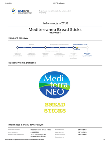 24.05.2016 EUIPO eSearch Obejmij swoją własność intelektualną ochroną w Unii Europejskiej Informacje o ZTUE Mediterraneo Bread Sticks 012009684 Horyzont czasowy Badanie Postępowanie sprzeciwowe Zarejestrowany ZTUE 24/05/2016 0 otrzymane sprzeciwy 24/07/2013 Otrzymano zgłoszenie ZTUE 04/09/2013 Rozpatrywanie zakończone 05/09/2013 Publikacja zgłoszenia 05/12/2013 Zakończenie okresu sprzeciwowego 17/12/2013 ZTUE zarejestrowany i opublikowany 24/07/2023 Data wygaśnięcia ZTUE Przedstawienie graficzne Informacje o znaku towarowym Nazwa/imię i nazwisko Mediterraneo Bread Sticks Data zgłoszenia 24/07/2013 Numer zgłoszenia 012009684 Data rejestracji 13/12/2013 Podstawa znaku towarowego Znak towarowy Unii Europejskiej (ZTUE) Data wygaśnięcia 24/07/2023 24/07/2013 https://euipo.europa.eu/eSearch/#details/trademarks/012009684 Data wskazania 1/4 24.05.2016 EUIPO eSearch Data otrzymania 24/07/2013 Język zgłoszenia Rodzaj Graficzny grecki Drugi język Charakter Indywidualny angielski Nr ref. zgłoszenia Klasy wg klasyfikacji nicejskiej 30 ( Klasyfikacja nicejska ) ctm/fil/breadsticksmed Status znaku towarowego Klasyfikacja wiedeńska 06.19.01 ( Klasyfikacja wiedeńska ) Zarejestrowany Nabyty charakter odróżniający No Towary i usługi polski (pl) 30 Paluszki. Opis polski (pl) Opis Kolor Znak składa się ze słów ''Medi terra NEO'' umieszczonych jedno pod drugim w okrągłej ramce z tłem, które składa się z odcieni jasnoniebieskiego, niebieskiego, zielonego i ciemnoniebieskiego, które pojawiają się jeden pod drugim. Słowa są napisane łacińskimi literami w kolorze białym. Pierwsza litera ''M'' oraz litery ''NEO'' są drukowanymi literami, a reszta liter jest mała. Pod okręgiem znajdują się słowa ''BREAD STICKS'' napisane drukowanymi złotymi literami. Jasnoniebieski, niebieski, zielony, ciemnoniebieski i złoty. Właściciele Fedon Grammatikopoulos & Georgios Papadopoulos - Production of Pastry Products - Societe Anonyme trading as FEDON SA Numer identyfikac…371297 Organizacja Forma prawna Kraj Fedon Grammatikopoulos Miejscowość & Georgios Papadopoulos Kod pocztowy - Production Adres of Pastry Products Societe Anonyme trading as FEDON SA Region GR - GRECJA Adres korespondencyjny n/a Fedon Grammatikopoulos & Georgios Papadopoulos Production of Pastry Products - Societe Anonyme trading as FEDON SA Nea Santa GR-61100 Kilkis GRECIA Kilkis 61100 Nea Santa Możliwość dostępu i zmiany przez uprawnionego użytkownika za pośrednictwem User Area Możliwość dostępu i zmiany przez uprawnionego użytkownika za pośrednictwem User Area Możliwość dostępu i zmiany przez uprawnionego użytkownika za pośrednictwem User Area Podmiot prawny Pełnomocnicy MALAMIS & ASSOCIATES Numer identyfikac…16343 Kraj GR - GRECJA Adres korespondencyjny MALAMIS & ASSOCIATES PALAIA TATOIOU 8, KIFISIA GR-146 71 Athens GRECIA Organizacja n/a Region n/a Forma prawna Osoba prawna Miejscowość Athens Kod pocztowy 146 71 Adres PALAIA TATOIOU 8, KIFISIA Rodzaj Stowarzyszenie https://euipo.europa.eu/eSearch/#details/trademarks/012009684 00 30-2103629855 00 30-2103647994 [email protected] 2/4 24.05.2016 EUIPO eSearch Korespondencja Numer Od Procedura zgłoszenia Temat Data Wpis 008337159 C.1.3. Owner - change of name & address - entry on the register M - automatic template 27/03/2014 Znak towarowy Unii Europejskiej (ZTUE) 012009684 Cover letter for registration certificate. 18/12/2013 Znak towarowy Unii Europejskiej (ZTUE) 012009684 Świadectwo rejestracji 17/12/2013 Znak towarowy Unii Europejskiej (ZTUE) 012009684 Graficzny 24/07/2013 Znak towarowy Unii Europejskiej (ZTUE) 012009684 Wniosek o wpis i załącznik 24/07/2013 Działania Pokazywanie od 1 do 5 5 wpisów Przekształcenie RM Brak wpisu Starszeństwo Brak wpisu Pierwszeństwo z wystawienia Brak wpisu Pierwszeństwo Brak wpisu Publikacje Numer biuletynu Data Sekcja Opis 2013/168 05/09/2013 A.1 Zgłoszenia opublikowane na mocy art. 40 RZTUE 2013/239 17/12/2013 B.1 Rejestracje bez zmian od daty publikacji zgłoszenia 2014/060 31/03/2014 C.1.3 Właściciel – zmiana nazwy/imienia i nazwiska i adresu Pokazywanie od 1 do 3 3 wpisów Unieważnienie WZT Brak wpisu Wpisy Numer biuletynu Data Sekcja Numer zgłoszenia Tytuł Podtytuł 2014/060 31/03/2014 C.1.3 008337159 Właściciel Zmiana nazwy/imienia i nazwiska i adresu Pokazywanie od 1 do 1 1 wpisów https://euipo.europa.eu/eSearch/#details/trademarks/012009684 3/4 24.05.2016 EUIPO eSearch Sprzeciwy Brak wpisu Odwołania Brak wpisu Decyzje Brak wpisu Przedłużenia Brak wpisu Powiązania znaku towarowego Brak wpisu https://euipo.europa.eu/eSearch/#details/trademarks/012009684 4/4