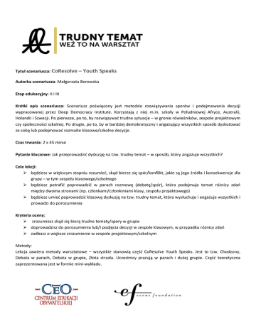 Tytuł scenariusza: CoResolve – Youth Speaks Autorka scenariusza: Małgorzata Borowska Etap edukacyjny: II i III Krótki opis scenariusza: Scenariusz poświęcony jest metodzie rozwiązywania sporów i podejmowania decyzji wypracowanej przez Deep Democracy Institute. Korzystają z niej m.in. szkoły w Południowej Afryce, Australii, Holandii i Szwecji. Po pierwsze, po to, by rozwiązywać trudne sytuacje – w gronie rówieśników, zespole projektowym czy społeczności szkolnej. Po drugie, po to, by w bardziej demokratyczny i angażujący wszystkich sposób dyskutować ze sobą lub podejmować rozmaite klasowe/szkolne decyzje. Czas trwania: 2 x 45 minut Pytanie kluczowe: Jak przeprowadzić dyskusję na tzw. trudny temat – w sposób, który angażuje wszystkich? Cele lekcji: będziesz w większym stopniu rozumieć, skąd bierze się spór/konflikt, jakie są jego źródła i konsekwencje dla grupy – w tym zespołu klasowego/szkolnego będziesz potrafić poprowadzić w parach rozmowę (debatę/spór), która podejmuje temat różnicy zdań między dwoma stronami (np. członkami/członkiniami klasy, zespołu projektowego) będziesz umieć poprowadzić klasową dyskusję na tzw. trudny temat, która wysłuchuje i angażuje wszystkich i prowadzi do porozumienia Kryteria oceny: zrozumiesz skąd się biorą trudne tematy/spory w grupie doprowadzisz do porozumienia lub/i podjęcia decyzji w zespole klasowym, w przypadku różnicy zdań zadbasz o większe zrozumienie w zespole projektowym/szkolnym Metody: Lekcja zawiera metody warsztatowe – wszystkie stanowią część CoResolve Youth Speaks. Jest to tzw. Chodzony, Debata w parach, Debata w grupie, Złota strzała. Uczestnicy pracują w parach i dużej grupie. Część teoretyczna zaprezentowana jest w formie mini-wykładu. I. Wprowadzenie (10 minut) [Uwaga techniczna: prowadź zajęcia w sali, w której osoby uczestniczące siedzą tak, by mogły widzieć się nawzajem – wokół wspólnego stołu lub w kręgu. W pierwszej części zajęć będzie ci również potrzebne miejsce, w którym wszystkie osoby uczestniczące w warsztacie będą mogły swobodnie poruszać się po sali] 1. Cele warsztatu. Rozpocznij zajęcia ze wszystkimi osobami siedzącymi w kręgu. Powiedz, że dzisiejsza lekcja będzie poświęcona lepszemu komunikowaniu się w klasie/zespole projektowym/samorządzie (w zależności od tego, kto uczestniczy w zajęciach). Powiedz też, że uczestnicy i uczestniczki zajęć poznają taką metodę rozwiązywania sporów/porozumiewania się w sytuacji różnicy zdań, z której będą mogli korzystać samodzielnie: w parach lub małych zespołach – jeśli będą czuli taką potrzebę. Zapewnij, że o tym, jakie tematy/kwestie zostaną poddane dyskusji, zdecydują uczestnicy zajęć. 2. Rundka początkowa: „Zamelduj się” (nieobowiązkowo). Zaproponuj, żeby wszyscy chętni, zabrali głos w dobrowolnej „rundce” głosów. To pozwoli ci zorientować się, jaka atmosfera panuje w grupie, z jaką myślą/energią/uczuciami uczestnicy i uczestniczki zaczynają zajęcia. II „Chodzony” (soft shoe shuffle) (10 minut) 1. Aby wybrać temat do dalszej pracy, zaproponuj „Chodzonego” – inaczej Dialog Dynamiczny. Chodzony to rozmowa na stojąco, która pozwala na to, aby wszyscy mogli się w nią zaangażować. 2. Instrukcja. Rozpocznijcie stojąc w kole. Powiedz, że dyskusję może zacząć dowolna osoba – dając krok do przodu, (wyłamując się z koła) i wygłaszając jakąś tezę/stwierdzenie. Pozostałe osoby okazują, że zgadzają się z tym stwierdzeniem przysuwając się do mówiącej/mówiącego lub że się z tym nie zgadzają, odsuwając się. Kolejne osoby występują z koła, aby wyrazić swoje opinie (Uwaga! Niekoniecznie w odniesieniu do tego, co już padło), a reszta grupy przesuwa się dołączając do tych, z którymi się zgadzają. Jeśli dana osoba nie zgadza się z żadnym z zaprezentowanych stanowisk może w dowolnym momencie odsunąć się od grup w wolną przestrzeń i wyrazić własny pogląd. W tym przypadku inne osoby wyrażają swoje poparcie dołączając do niej/niego. Powiedz uczestnikom i uczestniczkom, że zaletą tej metody jest możliwość zmiany zdania. Można wyrazić pewną opinię i stanąć po jednej stronie, a za chwilę zmienić zdanie, powiedzieć coś zupełnie przeciwnego i stanąć po stronie przeciwnej. Każdy pogląd zajmuje miejsce w przestrzeni; istnieje bez względu na to, czy go popierasz czy nie. Możesz zmieniać stanowisko tak często, jak tylko chcesz. Pozwoli ci to w fizyczny sposób odczuć, jak płynnie zmieniają się poglądy. Im więcej się poruszasz, tym więcej opinii uda ci się poznać. 2. Wskazówki dla osoby prowadzącej: ZACHĘCAJ uczestników i uczestniczki do dowolnego poruszania się między grupami. Odwiedź osoby od używania/stawiania pytań. Wytłumacz uczestniczkom i uczestnikom, w jaki sposób „oszukiwać” lub ukryć się. Jeśli ktoś woli nie zabierać głosu, to powinien/powinna przemieszczać się z dowolną grupą - inaczej osoba prowadząca zapyta go/ją o zdanie. Jeśli nie chcą zostać zapytani, powinni często się przemieszczać. 3. Uważaj na: Nieprzemieszczanie się. Ludzie często zapominają o zmianie pozycji. Przypominaj i w miarę możliwości zachęcaj wszystkie osoby do poruszania się. Nie nalegaj na przemieszczanie się; zachęcaj i facylituj/umożliwiaj. 4. Pracę „Chodzonym” zakończ wtedy, gdy: Przemieszczanie się nie jest wymagane: kiedy atmosfera/energia zmienia się, kiedy uczestniczki i uczestnicy są bardzo zaangażowani często przestają chodzić i kontynuują rozmowę na stojąco w jednym miejscu. W takim przypadku działaj według własnego uznania. Jeśli wywiązała się rozmowa i wszystkie osoby wydają się zaangażowane, naleganie na zmianę pozycji może nie być najlepszym rozwiązaniem. Miej na uwadze zachowania graniczne (piszemy o nich w tekście opisującym metodę), nawracające t