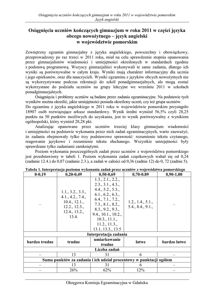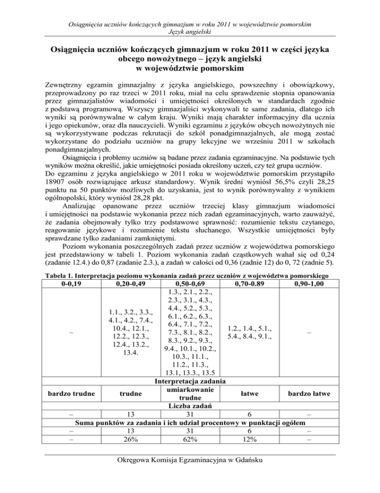Osiągnięcia uczniów kończących gimnazjum w roku 2011 w województwie pomorskim Język angielski Osiągnięcia uczniów kończących gimnazjum w roku 2011 w części języka obcego nowoŜytnego – język angielski w województwie pomorskim Zewnętrzny egzamin gimnazjalny z języka angielskiego, powszechny i obowiązkowy, przeprowadzony po raz trzeci w 2011 roku, miał na celu sprawdzenie stopnia opanowania przez gimnazjalistów wiadomości i umiejętności określonych w standardach zgodnie z podstawą programową. Wszyscy gimnazjaliści wykonywali te same zadania, dlatego ich wyniki są porównywalne w całym kraju. Wyniki mają charakter informacyjny dla ucznia i jego opiekunów, oraz dla nauczycieli. Wyniki egzaminu z języków obcych nowoŜytnych nie są wykorzystywane podczas rekrutacji do szkół ponadgimnazjalnych, ale mogą zostać wykorzystane do podziału uczniów na grupy lekcyjne we wrześniu 2011 w szkołach ponadgimnazjalnych. Osiągnięcia i problemy uczniów są badane przez zadania egzaminacyjne. Na podstawie tych wyników moŜna określić, jakie umiejętności posiada określony uczeń, czy teŜ grupa uczniów. Do egzaminu z języka angielskiego w 2011 roku w województwie pomorskim przystąpiło 18907 osób rozwiązujące arkusz standardowy. Wynik średni wyniósł 56,5% czyli 28,25 punktu na 50 punktów moŜliwych do uzyskania, jest to wynik porównywalny z wynikiem ogólnopolski, który wyniósł 28,28 pkt. Analizując opanowane przez uczniów trzeciej klasy gimnazjum wiadomości i umiejętności na podstawie wykonania przez nich zadań egzaminacyjnych, warto zauwaŜyć, Ŝe zadania obejmowały tylko trzy podstawowe sprawność: rozumienie tekstu czytanego, reagowanie językowe i rozumienie tekstu słuchanego. Wszystkie umiejętności były sprawdzane tylko zadaniami zamkniętymi. Poziom wykonania poszczególnych zadań przez uczniów z województwa pomorskiego jest przedstawiony w tabeli 1. Poziom wykonania zadań cząstkowych wahał się od 0,24 (zadanie 12.4.) do 0,87 (zadanie 2.3.), a zadań w całości od 0,36 (zadnie 12) do 0, 72 (zadnie 5). Tabela 1. Interpretacja poziomu wykonania zadań przez uczniów z województwa pomorskiego 0-0,19 0,20-0,49 0,50-0,69 0,70-0.89 0,90-1,00 1.3., 2.1., 2.2., 2.3., 3.1., 4.3., 4.4., 5.2., 5.3., 1.1., 3.2., 3.3., 6.1., 6.2., 6.3., 4.1., 4.2., 7.4., 6.4., 7.1., 7.2., 10.4., 12.1., 1.2., 1.4., 5.1., – 7.3., 8.1., 8.2., – 12.2., 12.3., 5.4., 8.4., 9.1., 8.3., 9.2., 9.3., 12.4., 13.2., 9.4., 10.1., 10.2., 13.4. 10.3., 11.1., 11.2., 11.3., 13.1, 13.3., 13.5 Interpretacja zadania umiarkowanie bardzo trudne trudne łatwe bardzo łatwe trudne Liczba zadań – 13 31 6 – Suma punktów za zadania i ich udział procentowy w punktacji ogółem – 13 31 6 – – 26% 62% 12% – Okręgowa Komisja Egzaminacyjna w Gdańsku Osiągnięcia uczniów kończących gimnazjum w roku 2011 w województwie pomorskim Język angielski W zestawie egzaminacyjnym z języka angielskiego nie było zadań bardzo trudnych i bardzo łatwych dla zdających z województwa pomorskiego. Największą grupę zadań (61% wszystkich zadań w zestawie stanowiły zadnia umiarkowanie trudne. Wśród nich znajdują się zadania ze wszystkich obszarów egzaminacyjnych Odbiór tekstu słuchanego Tę sprawność badano trzema zadaniami, zgodnie ze standardami przedstawionymi w Informatorze gimnazjalnym. W zadaniu 1 uczeń miał wysłuchać czterech nagrań i następnie wybrać kontekst sytuacyjny rozmowy przedstawiony w materiale ikonograficznym (standard 1.2.) zadanie 1.2. Określić główną myśl tekstu standard 1.1. zadanie 1.1., oraz stwierdzić, czy tekst zawiera określone informacje lub wyselekcjonować informacje standard 1.3. zadania 1.3 i 1.4. Zadanie 1 w tej części egzaminu było umiarkowanie trudne, gdyŜ wskaźnik łatwości całego zadania wyniósł 0,62. Zadanie cząstkowe 1.1. w którym zdający miał zrozumieć, główną myśl tekstu, czyli stwierdzić o czym mówi dziewczyna było zadaniem cząstkowym najtrudniejszym ze wskaźnikiem łatwości 0,43. Zadanie 2 było najłatwiejszym z trzech zadań sprawdzających umiejętność rozumienia ze słuchu. Uczeń miał wysłuchać rozmowę nauczycieli następnie stwierdzić, czy wysłuchany tekst zawiera określone informacje (standard 1.3.). Było to zadanie typu prawda/fałsz. Łatwość całego zadnia wyniosła 0,66 co oznacza, Ŝe było to zadanie umiarkowanie trudne. W zadaniu 3 uczeń miał wysłuchać trzy wypowiedzi na temat Internetu. Na podstawie informacji zawartych w nagraniu miał dopasować odpowiadające jej zdanie, czyli zdający miał wyszukać lub wyselekcjonować informacje (standard 1.3.). Było to najtrudniejsze zadanie w tej części arkusza ze wskaźnikiem łatwości 0,47. Najtrudniejszym zadaniem było zadanie cząstkowe 3.2. ze wskaźnikiem łatwości 0,40. Rozumienie tekstu słuchanego było dala gimnazjalistów piszących egzamin w 2011 roku umiejętnością umiarkowanie trudną. Łatwość trzech zadań wyniosła 0,59. Wykres 1 Wykres 1. przedstawia rozkład wyników uzyskanych przez zdających w arkuszu standardowym z rozumienia tekstu słuchanego. Wykres wskazuje, Ŝe większość zdających poradziła sobie z trzema zadaniami na rozumienie tekstu słuchanego. Okręgowa Komisja Egzaminacyjna w Gdańsku Osiągnięcia uczniów kończących gimnazjum w roku 2011 w województwie pomorskim Język angielski Reagowanie językowe Tę sprawność sprawdzano pięcioma zadaniami 4 – 8., poziom wykonania zadań w tej części wyniósł 0,59. W zadaniu 4 zdający mieli wybrać właściwą reakcję do wysłuchanych wcześniej czterech krótkich typowych wypowiedzi. Najtrudniejszym zadaniem cząstkowym było zadnie 4.2. w której uczeń miał wybrać właściwą reakcję do wypowiedzi Are you ready to order? Tylko 31% zdających wybrało właściwą odpowiedź Yes, I’ll have chicken with rice. Najłatwiejszym zdaniem cząstkowym było zadanie 4.4. (łatwość 0,62), w którym zda