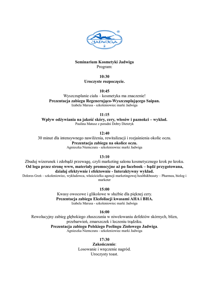 Seminarium Kosmetyki Jadwiga Program: 10:30 Uroczyste rozpoczęcie. 10:45 Wyszczuplanie ciała – kosmetyka ma znaczenie! Prezentacja zabiegu Regenerująco-Wyszczuplającego Saipan. Izabela Marusa - szkoleniowiec marki Jadwiga 11:15 Wpływ odżywiania na jakość skóry, cery, włosów i paznokci – wykład. Paulina Matusz z poradni Dobry Dietetyk 12:40 30 minut dla intensywnego nawilżenia, rewitalizacji i rozjaśnienia okolic oczu. Prezentacja zabiegu na okolice oczu. Agnieszka Niemczura - szkoleniowiec marki Jadwiga 13:10 Zbuduj wizerunek i zdobądź przewagę, czyli marketing salonu kosmetycznego krok po kroku. Od loga przez stronę www, materiały promocyjne aż po facebook – bądź przygotowana, działaj efektywnie i efektownie - Interaktywny wykład. Dolores Greń – szkoleniowiec, wykładowca, właścicielka agencji marketingowej health&beauty – Pharmea, biolog i marketer 15:00 Kwasy owocowe i glikolowe w służbie dla pięknej cery. Prezentacja zabiegu Eksfoliacji kwasami AHA i BHA. Izabela Marusa - szkoleniowiec marki Jadwiga 16:00 Rewolucyjny zabieg głębokiego złuszczania w niwelowaniu defektów skórnych, blizn, przebarwień, zmarszczek i leczeniu trądziku. Prezentacja zabiegu Polskiego Peelingu Ziołowego Jadwiga. Agnieszka Niemczura - szkoleniowiec marki Jadwiga 17:30 Zakończenie: Losowanie i wręczenie nagród. Uroczysty toast.