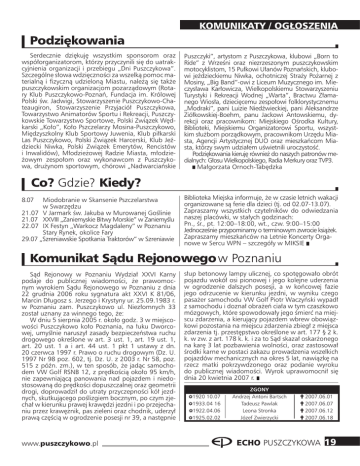 KOMUNIKATY / OGŁOSZENIA Podziękowania Serdecznie dziękuję wszystkim sponsorom oraz współorganizatorom, którzy przyczynili się do uatrakcyjnienia organizacji i przebiegu „Dni Puszczykowa”. Szczególne słowa wdzięczności za wszelką pomoc materialną i fizyczną udzieloną Miastu, należą się także puszczykowskim organizacjom pozarządowym (Rotary Klub Puszczykowo-Poznań, Fundacja im. Królowej Polski św. Jadwigi, Stowarzyszenie Puszczykowo-Chateaugiron, Stowarzyszenie Przyjaciół Puszczykowa, Towarzystwo Animatorów Sportu i Rekreacji, Puszczykowskie Towarzystwo Sportowe, Polski Związek Wędkarski „Koło”, Koło Pszczelarzy Mosina-Puszczykowo, Międzyszkolny Klub Sportowy Juwenia, Klub piłkarski Las Puszczykowo, Polski Związek Harcerski, Klub Jeździecki Niwka, Polski Związek Emerytów, Rencistów i Inwalidów), Młodzieżowej Radzie Miasta, młodzieżowym zespołom oraz wykonawcom z Puszczykowa, drużynom sportowym, chórowi „Nadwarciańskie Puszczyki”, artystom z Puszczykowa, klubowi „Born to Ride” z Wrześni oraz niezrzeszonym puszczykowskim motocyklistom, 15 Pułkowi Ułanów Poznańskich, klubowi jeździeckiemu Niwka, ochotniczej Straży Pożarnej z Mosiny, „Big Band”-owi z Liceum Muzycznego im. Mieczysława Karłowicza, Wielkopolskiemu Stowarzyszeniu Turystyki i Rekreacji Wodnej „Warta”, Bractwu Złamanego Wiosła, dziecięcemu zespołowi folklorystycznemu „Modraki”, pani Luizie Niedźwieckiej, pani Aleksandrze Ziółkowskiej-Boehm, panu Jackowi Antowskiemu, dyrekcji oraz pracownikom: Miejskiego Ośrodka Kultury, Biblioteki, Miejskiemu Organizatorowi Sportu, wszystkim służbom porządkowym, pracownikom Urzędu Miasta, Agencji Artystycznej DUO oraz mieszkańcom Miasta, którzy swym udziałem uświetnili uroczystość. Podziękowania kieruję również do naszych patronów medialnych: Głosu Wielkopolskiego, Radia Merkury oraz TVP3. Małgorzata Ornoch-Tabędzka Co? Gdzie? Kiedy? 8.07 Miodobranie w Skansenie Pszczelarstwa w Swarzędzu 21.07 V Jarmark św. Jakuba w Murowanej Goślinie 21.07 XXVIII „Zaniemyskie Bitwy Morskie” w Zaniemyślu 22.07 IX Festyn „Warkocz Magdaleny” w Poznaniu Stary Rynek, okolice Fary 29.07 „Szreniawskie Spotkania Traktorów” w Szreniawie Biblioteka Miejska informuje, że w czasie letnich wakacji organizowane są ferie dla dzieci (tj. od 02.07-13.07). Zapraszamy wszystkich czytelników do odwiedzania naszej placówki, w stałych godzinach: Pn., śr., pt. 12:00–18:00, wt., czw. 9:00–15:00 Jednocześnie przypominamy o terminowym zwrocie książek. Zapraszamy mieszkańców na Letnie Koncerty Organowe w Sercu WPN – szczegóły w MIKSIE Komunikat Sądu Rejonowego w Poznaniu Sąd Rejonowy w Poznaniu Wydział XXVI Karny podaje do publicznej wiadomości, że prawomocnym wyrokiem Sądu Rejonowego w Poznaniu z dnia 22 grudnia 2006 roku sygnatura akt XXVI K 81/06, Marcin Długosz s. Jerzego i Krystyny ur. 25.09.1983 r. w Poznaniu zam. Puszczykowo ul. Niezłomnych 33 został uznany za winnego tego, że: W dniu 5 sierpnia 2005 r. około godz. 3 w miejscowości Puszczykowo koło Poznania, na łuku Dworcowej, umyślnie naruszył zasady bezpieczeństwa ruchu drogowego określone w art. 3 ust. 1, art. 19 ust. 1, art. 20 ust. 1 a i art. 44 ust. 1 pkt 1 ustawy z dn. 20 czerwca 1997 r. Prawo o ruchu drogowym (Dz. U. 1997 Nr 98 poz. 602, tj. Dz. U. z 2003 r. Nr 58, poz. 515 z późn. zm.), w ten sposób, że jadąc samochodem VW Golf RSNB 12, z prędkością około 95 km/h, nie zapewniającą panowania nad pojazdem i niedostosowaną do prędkości dopuszczalnej oraz geometrii drogi, doprowadził do utraty przyczepności kół jezdnych, skutkującego poślizgiem bocznym, po czym zjechał w kierunku prawej krawędzi jezdni i po przejechaniu przez krawężnik, pas zieleni oraz chodnik, uderzył prawą częścią w ogrodzenie posesji nr 39, a następnie www.puszczykowo.pl słup betonowy lampy ulicznej, co spotęgowało obrót pojazdu wokół osi pionowej i jego kolejne uderzenia w ogrodzenie dalszych posesji, a w końcowej fazie jego odrzucenie w kierunku jezdni, w wyniku czego pasażer samochodu VW Golf Piotr Waczyński wypadł z samochodu i doznał obrażeń ciała w tym czaszkowo mózgowych, które spowodowały jego śmierć na miejscu zdarzenia, a kierujący pojazdem wbrew obowiązkowi pozostania na miejscu zdarzenia zbiegł z miejsca zdarzenia tj. przestępstwo określone w art. 177 § 2 k. k. w zw. z art. 178 k. k. i za to Sąd skazał oskarżonego na karę 3 lat pozbawienia wolności, oraz zastosował środki karne w postaci zakazu prowadzenia wszelkich pojazdów mechanicznych na okres 5 lat, nawiązkę na rzecz matki pokrzywdzonego oraz podanie wyroku do publicznej wiadomości. Wyrok uprawomocnił się dnia 20 kwietnia 2007 r. 1920 10.07 1933.04 16 1922.04.06 1925.02.02 ZGONY Andrzej Antoni Bartsch Tadeusz Pawlak Leona Stronka Józef Zwierzycki 2007.06.01 2007.06.07 2007.06.12 2007.06.18 ECHO PUSZCZYKOWA 19