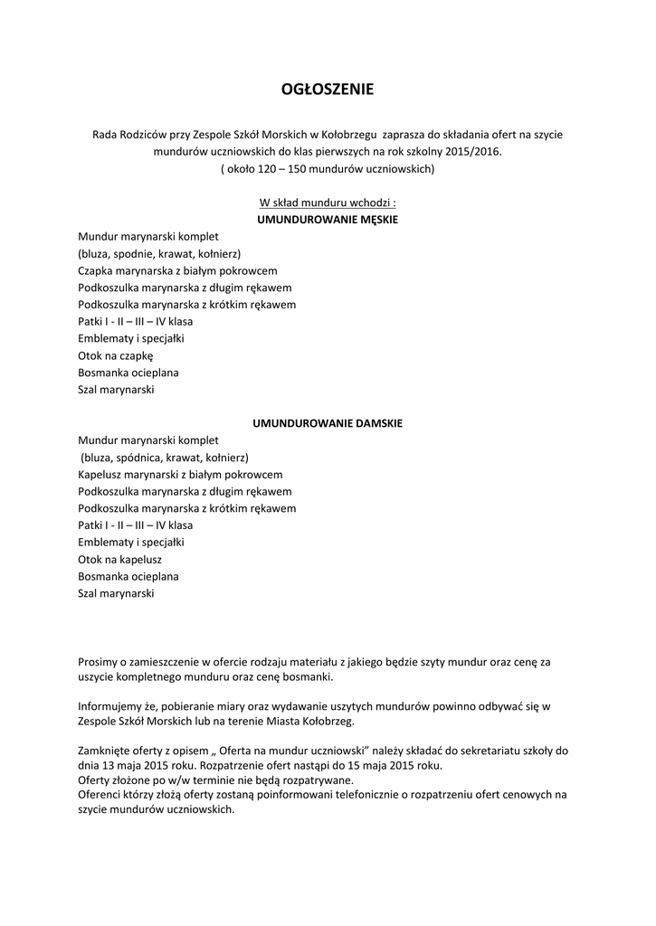 OGŁOSZENIE Rada Rodziców przy Zespole Szkół Morskich w Kołobrzegu zaprasza do składania ofert na szycie mundurów uczniowskich do klas pierwszych na rok szkolny 2015/2016. ( około 120 – 150 mundurów uczniowskich) W skład munduru wchodzi : UMUNDUROWANIE MĘSKIE Mundur marynarski komplet (bluza, spodnie, krawat, kołnierz) Czapka marynarska z białym pokrowcem Podkoszulka marynarska z długim rękawem Podkoszulka marynarska z krótkim rękawem Patki I - II – III – IV klasa Emblematy i specjałki Otok na czapkę Bosmanka ocieplana Szal marynarski UMUNDUROWANIE DAMSKIE Mundur marynarski komplet (bluza, spódnica, krawat, kołnierz) Kapelusz marynarski z białym pokrowcem Podkoszulka marynarska z długim rękawem Podkoszulka marynarska z krótkim rękawem Patki I - II – III – IV klasa Emblematy i specjałki Otok na kapelusz Bosmanka ocieplana Szal marynarski Prosimy o zamieszczenie w ofercie rodzaju materiału z jakiego będzie szyty mundur oraz cenę za uszycie kompletnego munduru oraz cenę bosmanki. Informujemy że, pobieranie miary oraz wydawanie uszytych mundurów powinno odbywać się w Zespole Szkół Morskich lub na terenie Miasta Kołobrzeg. Zamknięte oferty z opisem „ Oferta na mundur uczniowski” należy składać do sekretariatu szkoły do dnia 13 maja 2015 roku. Rozpatrzenie ofert nastąpi do 15 maja 2015 roku. Oferty złożone po w/w terminie nie będą rozpatrywane. Oferenci którzy złożą oferty zostaną poinformowani telefonicznie o rozpatrzeniu ofert cenowych na szycie mundurów uczniowskich. W ofercie należy podać: 1. Cenę za kompletny mundur uczniowski (oddzielnie męski i damski w podziale na poszczególne pozycje) 2. Rodzaj materiału z jakiego będzie szyty mundur uczniowski 3. Rodzaj materiału z jakiego będzie szyta bosmanka 4. Nazwę Firmy, Imię i Nazwisko Oferenta 5. Adres 6. Telefon kontaktowy 7. Formę płatności W załączeniu zdjęcia mundurów